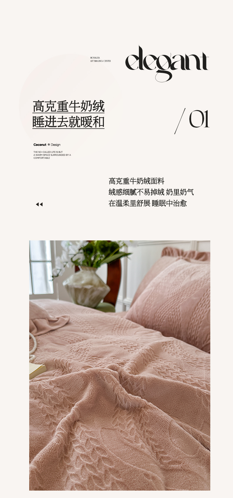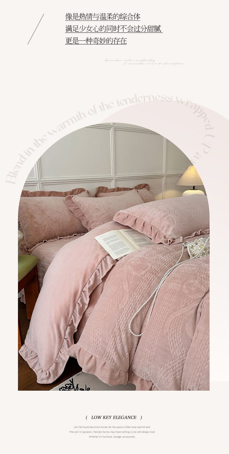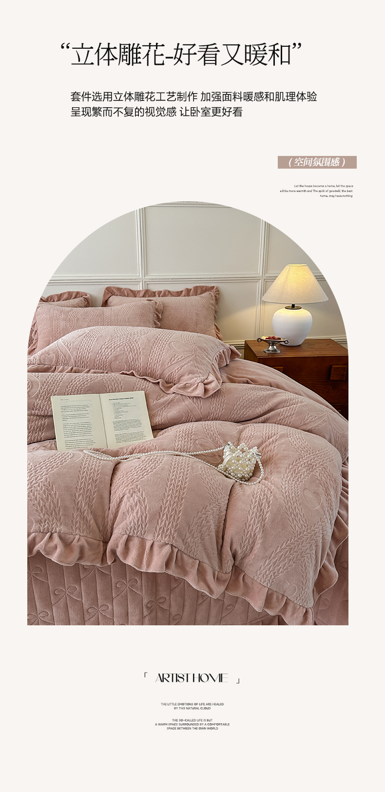 当前位置: 91家纺网 > 商品网购 > 床品套件 > 四件套 > 牛奶绒四件套 > 野合家纺 2024新款法式A类雕花牛奶绒韩版公主风四件套床盖款床单款床笠款 麦芮-豆沙
