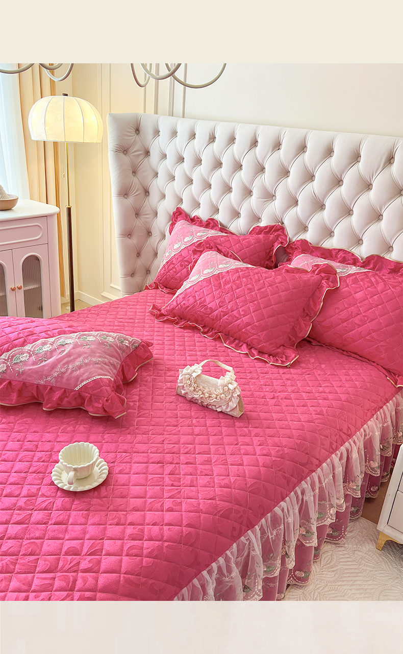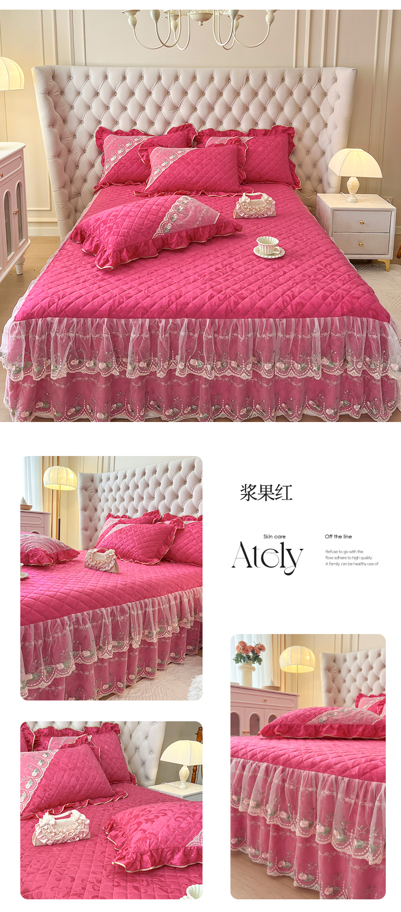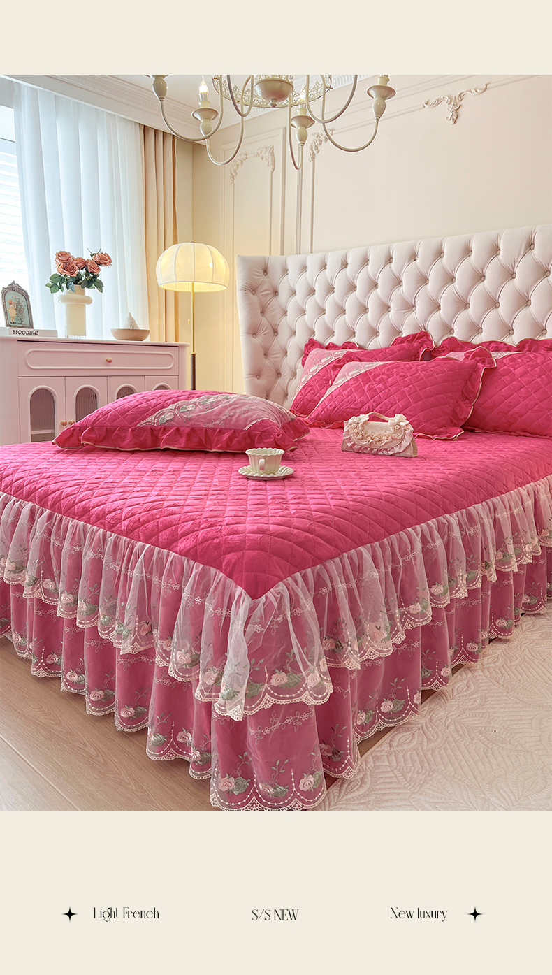 网红馆(ck家纺) 2025新款高克重天鹅绒刺绣床裙三件套-花语秘境 花语秘境-浆果红