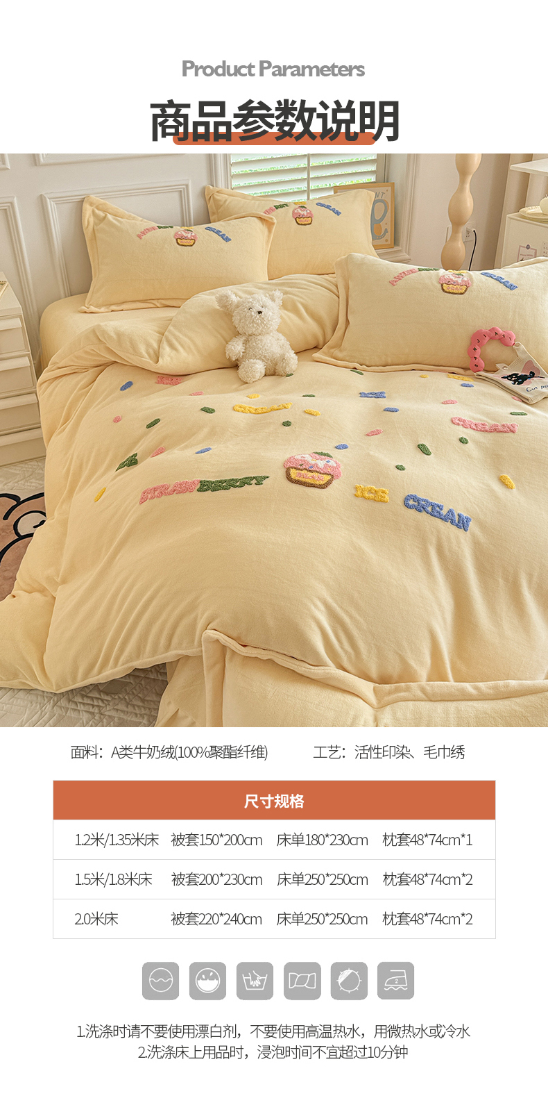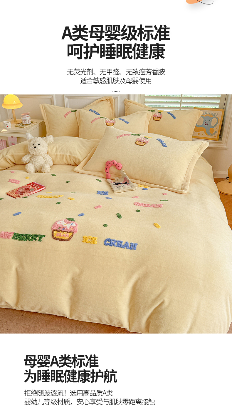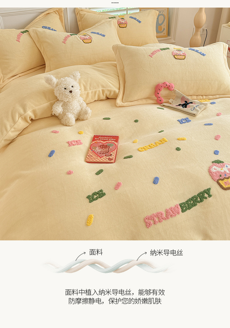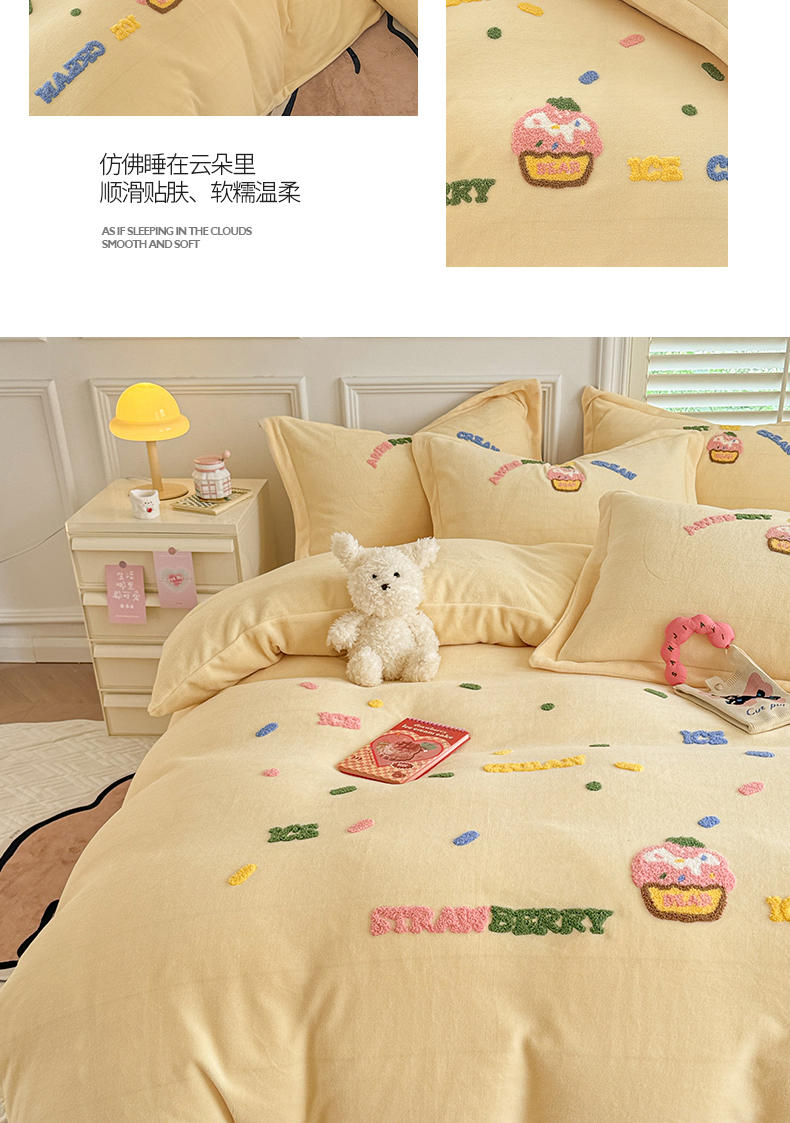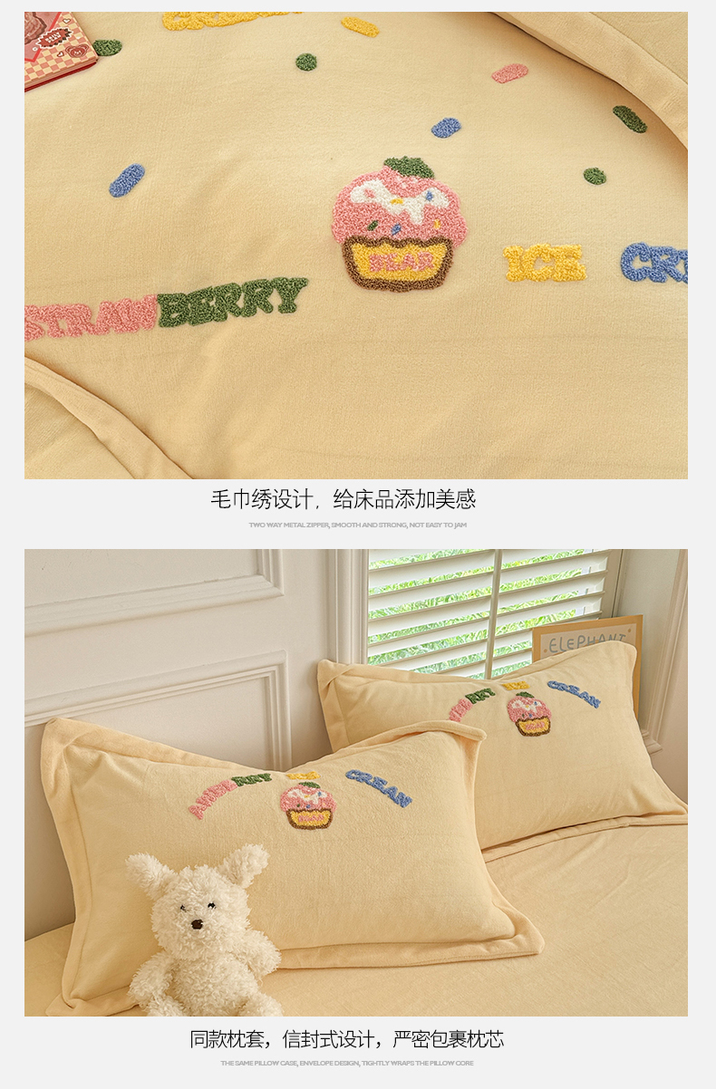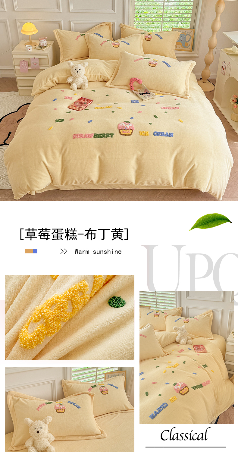 商品名称:芯贝儿 2024新款简约小清新加厚保暖牛奶绒毛巾绣花宝宝绒雕花绒法莱绒四件套 草莓蛋糕-布丁黄