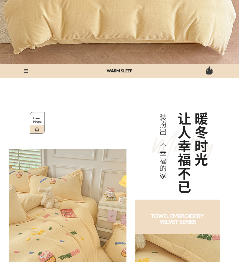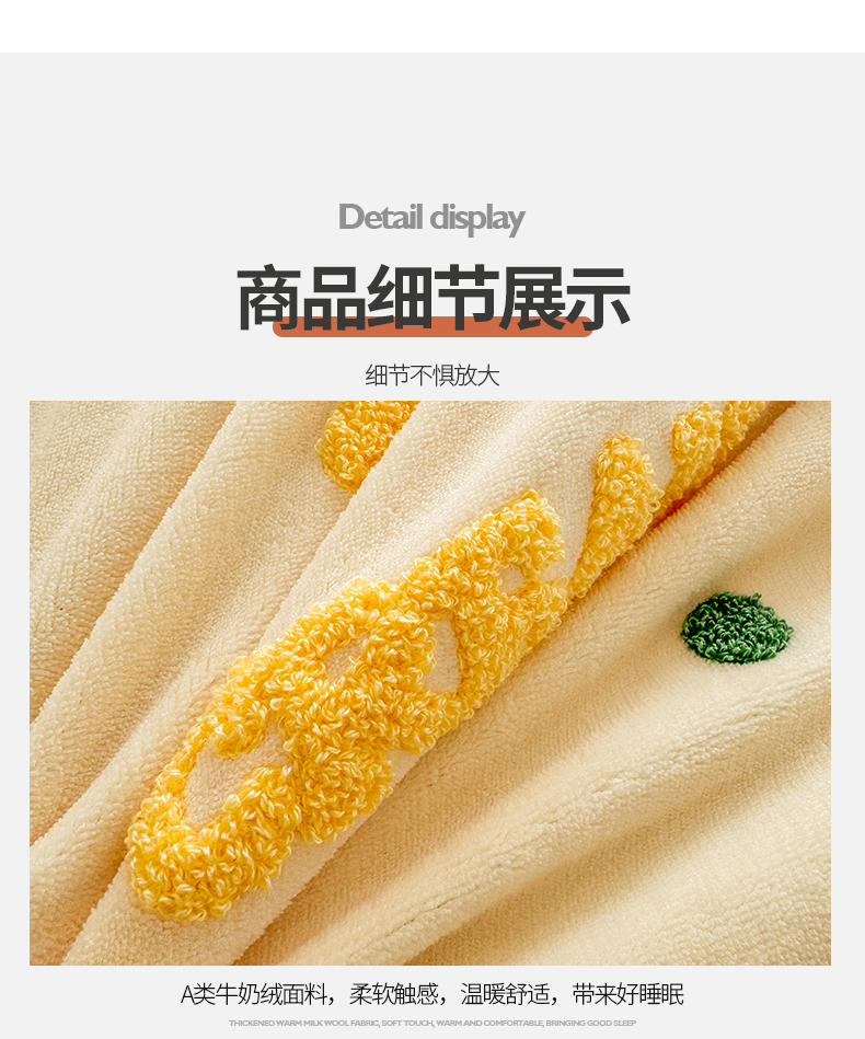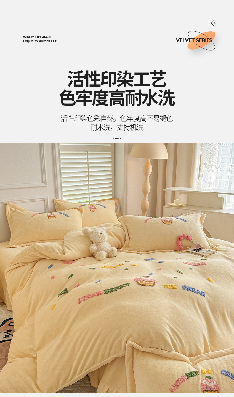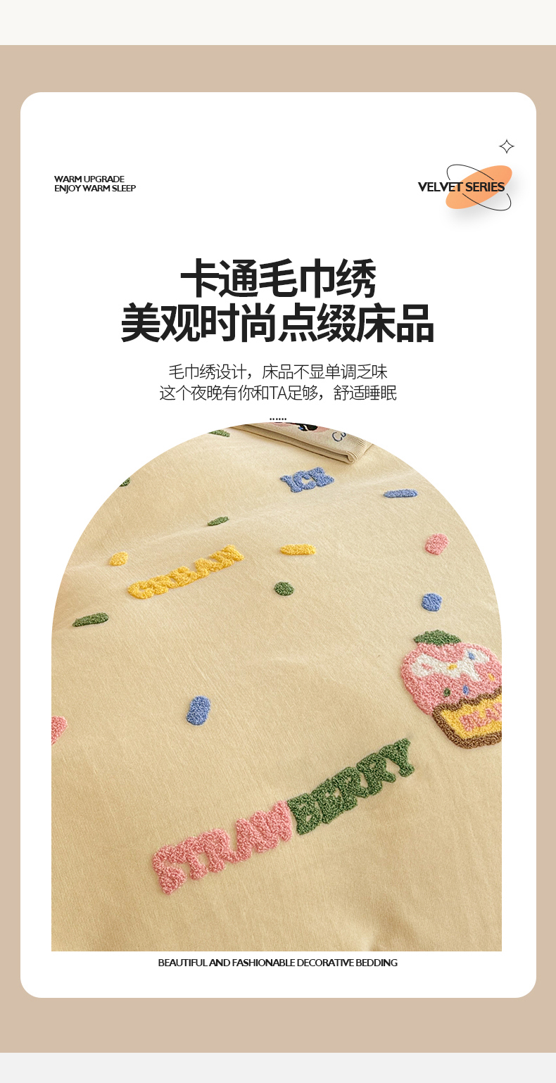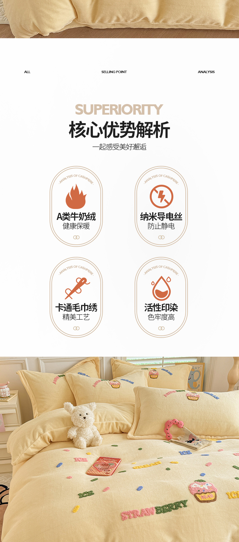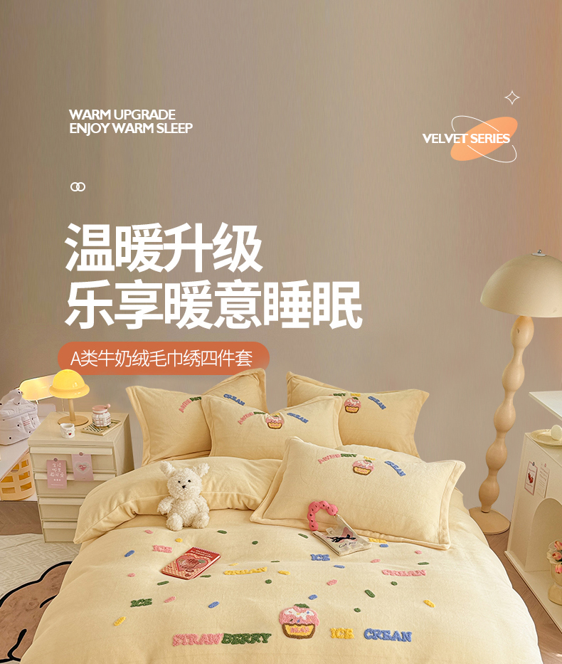 商品名称:芯贝儿 2024新款简约小清新加厚保暖牛奶绒毛巾绣花宝宝绒雕花绒法莱绒四件套 草莓蛋糕-布丁黄