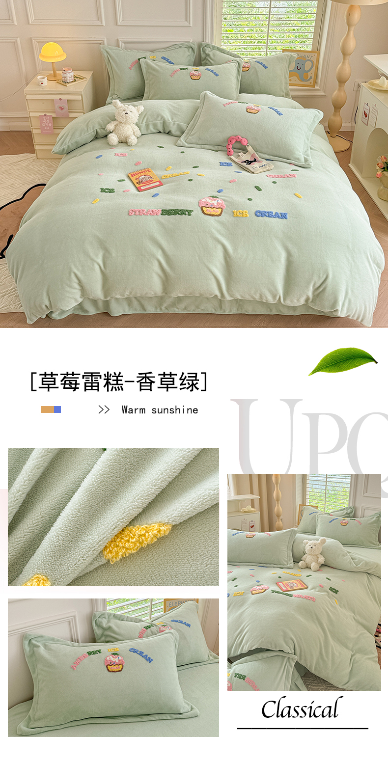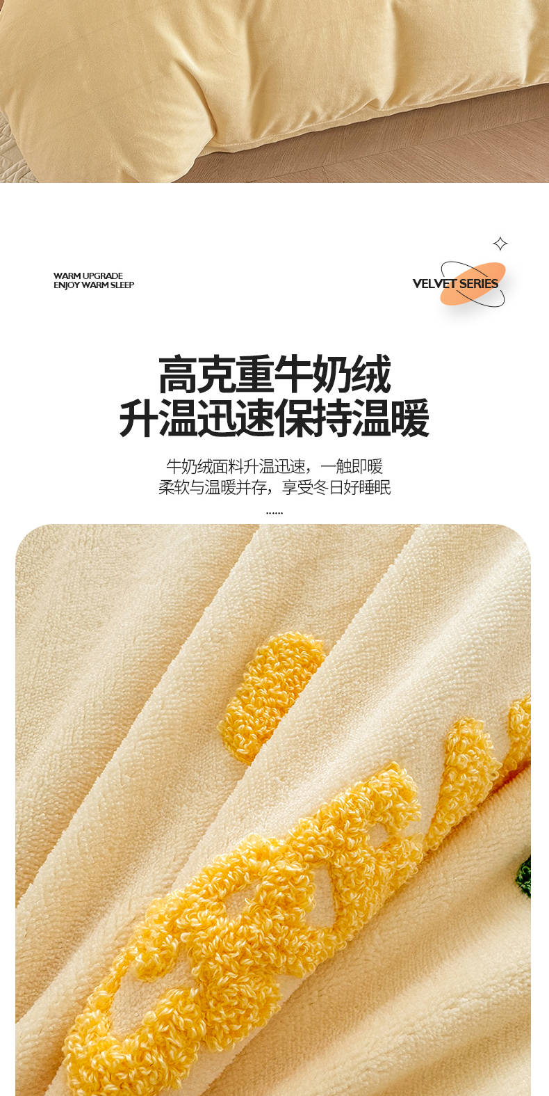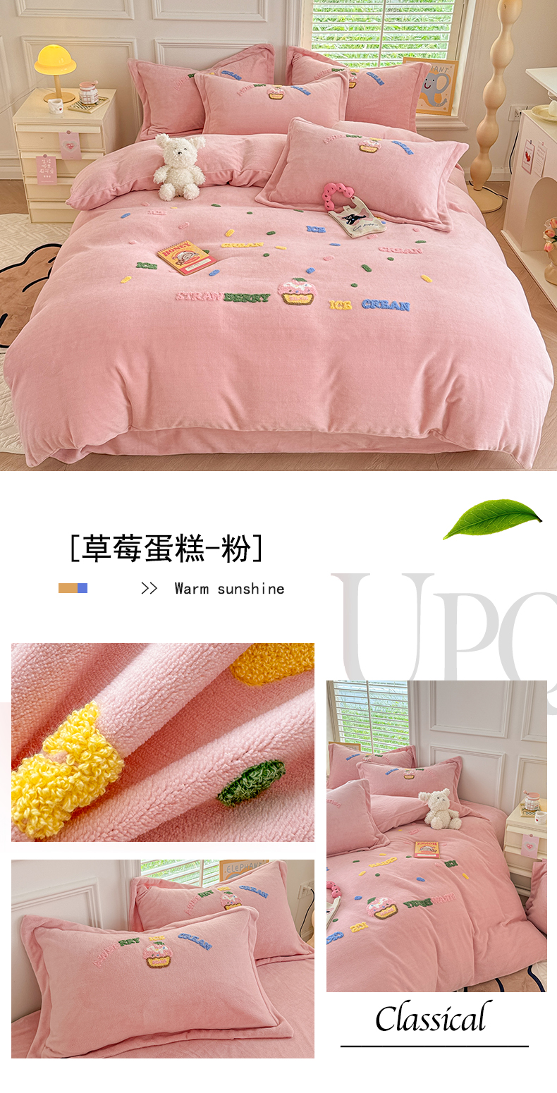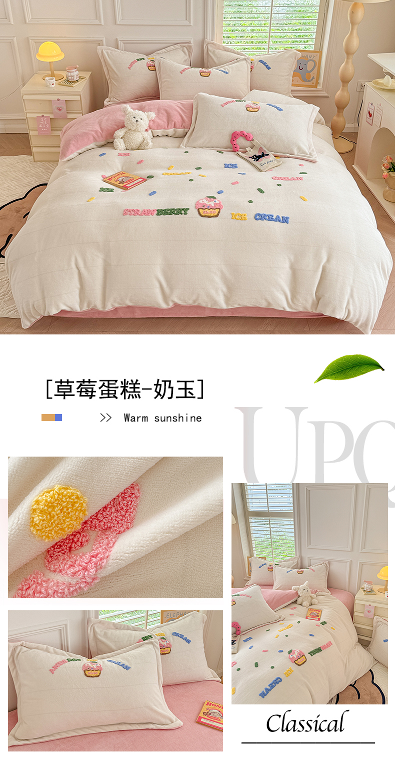 芯贝儿 2024新款简约小清新加厚保暖牛奶绒毛巾绣花宝宝绒雕花绒法莱绒四件套 草莓蛋糕-布丁黄