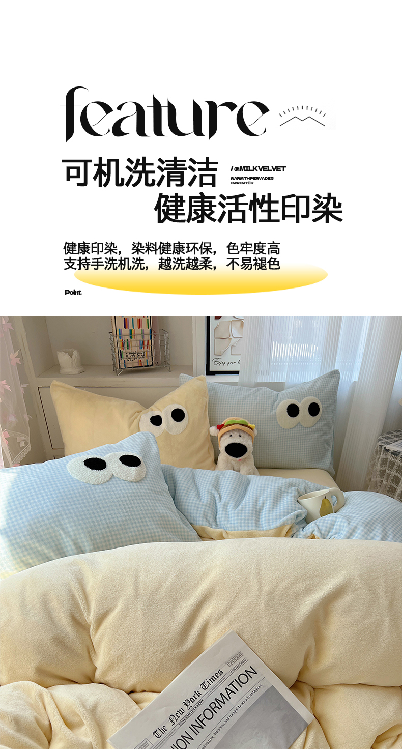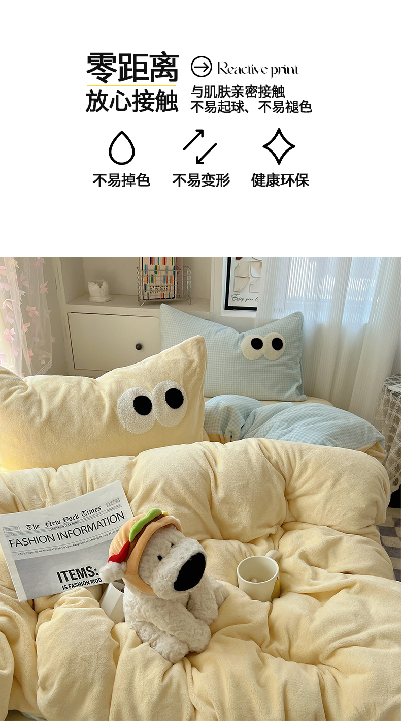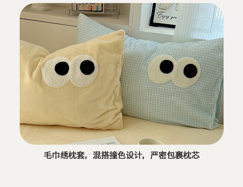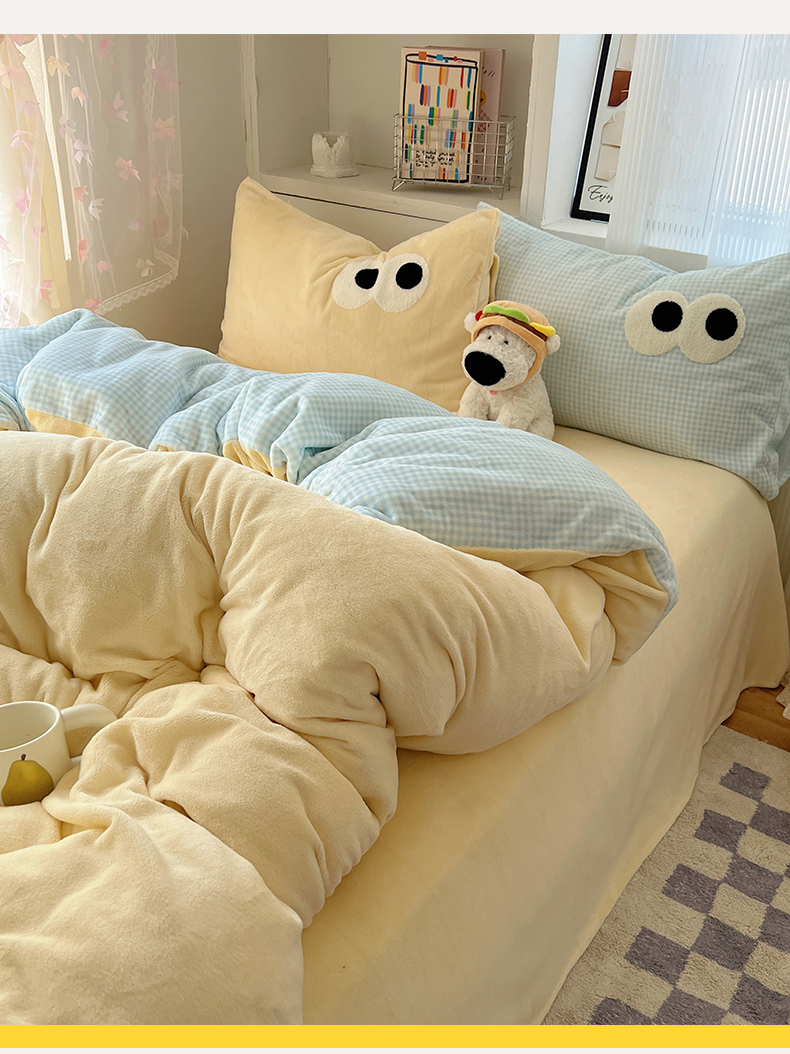 当前位置: 91家纺网 > 商品网购 > 床品套件 > 四件套 > 牛奶绒四件套 > 桃子家居 2024新款A类ins加厚毛巾绣大眼萌混搭撞色牛奶绒系列四件套 绒毛巾绣-大眼萌蓝格黄黄2