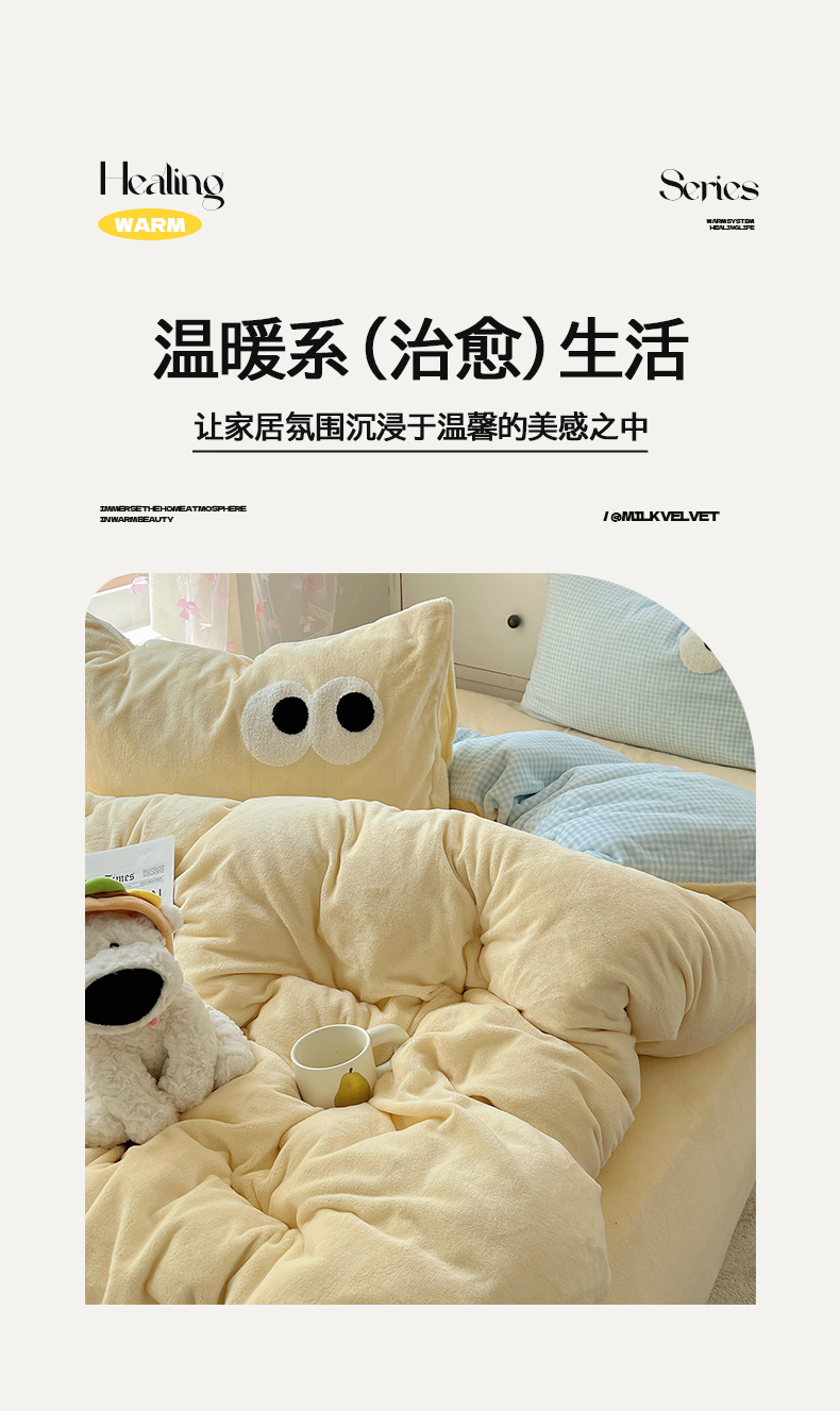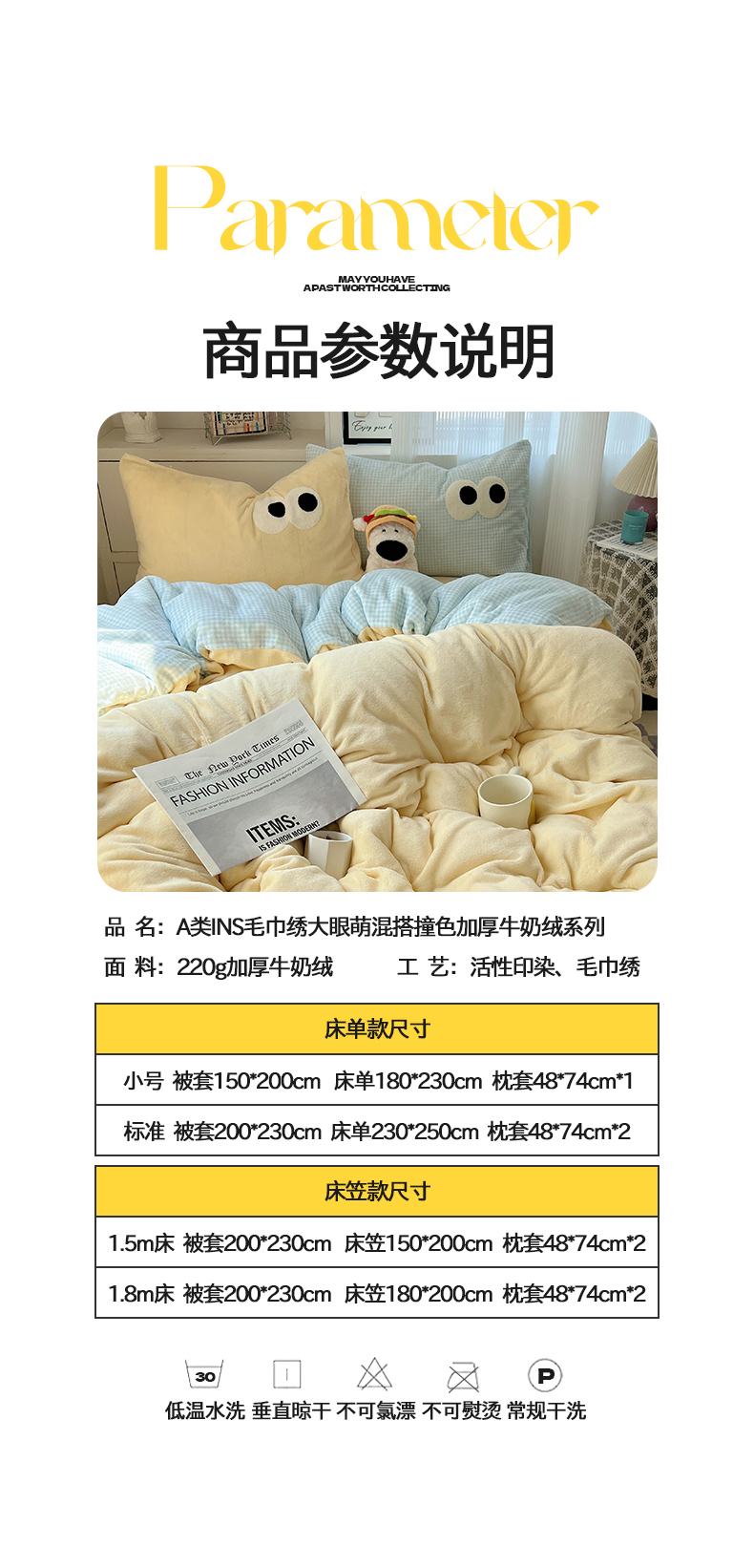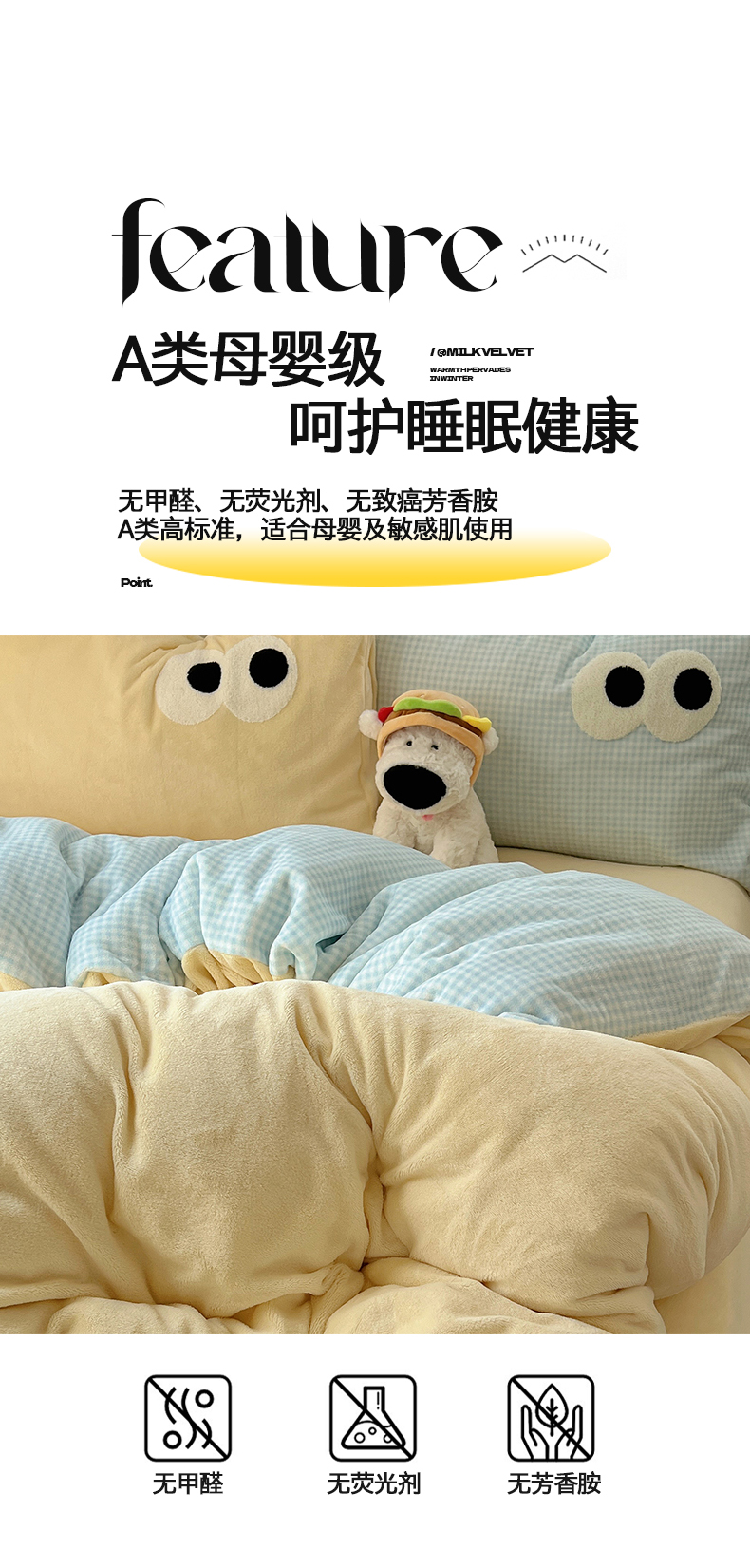 当前位置: 91家纺网 > 商品网购 > 床品套件 > 四件套 > 牛奶绒四件套 > 桃子家居 2024新款A类ins加厚毛巾绣大眼萌混搭撞色牛奶绒系列四件套 绒毛巾绣-大眼萌蓝格黄黄2