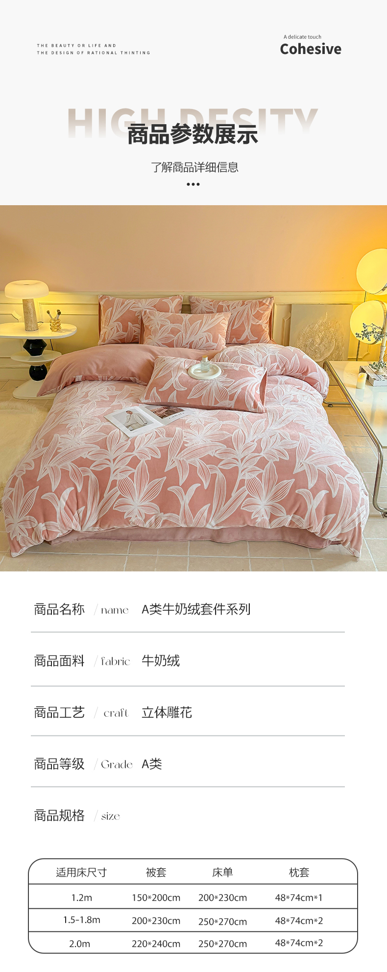 商品名称:大境 2024新款8斤A类230克牛奶绒提花烂花四件套床笠款床单款 叶阑 蔷薇粉