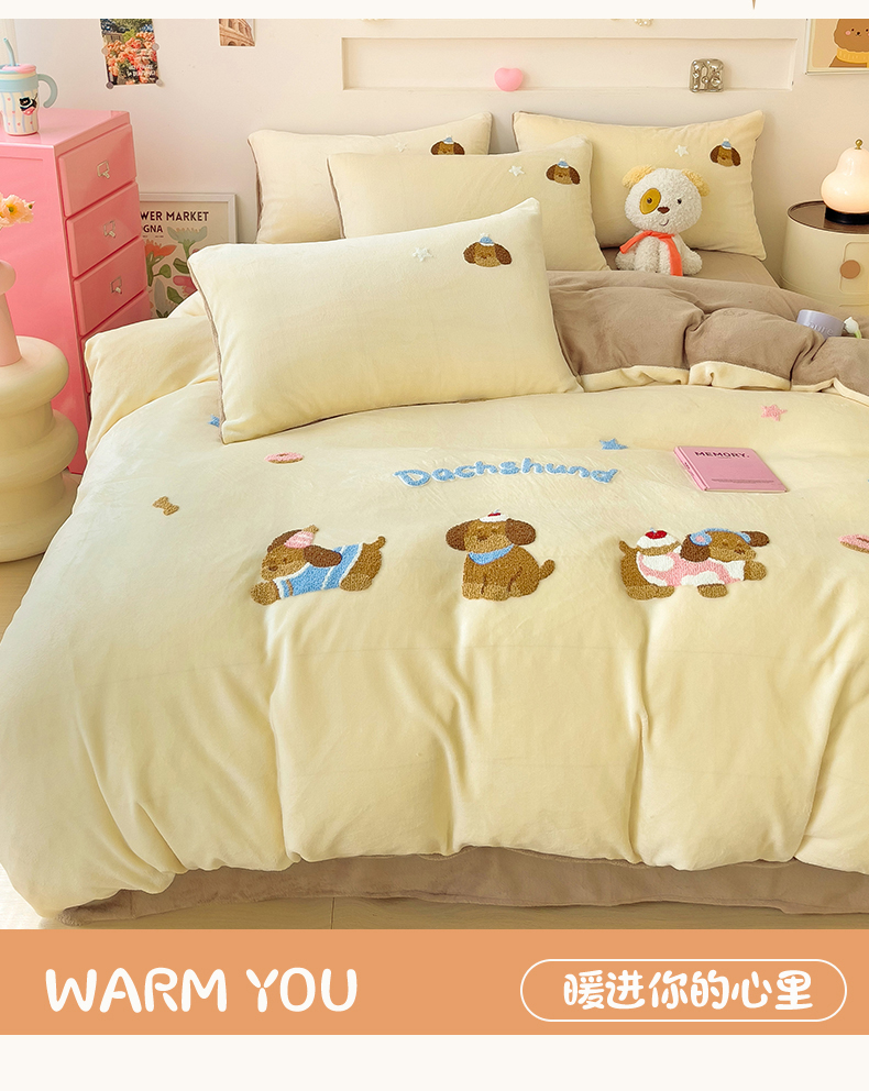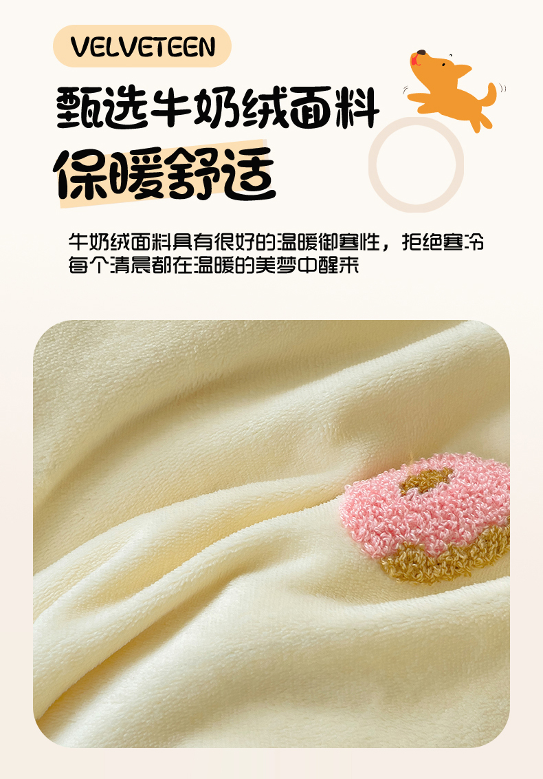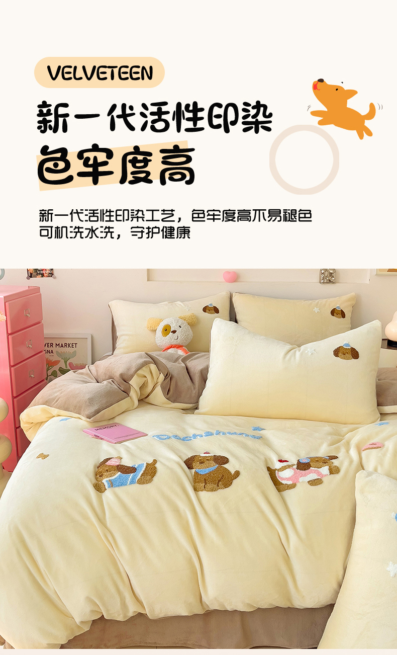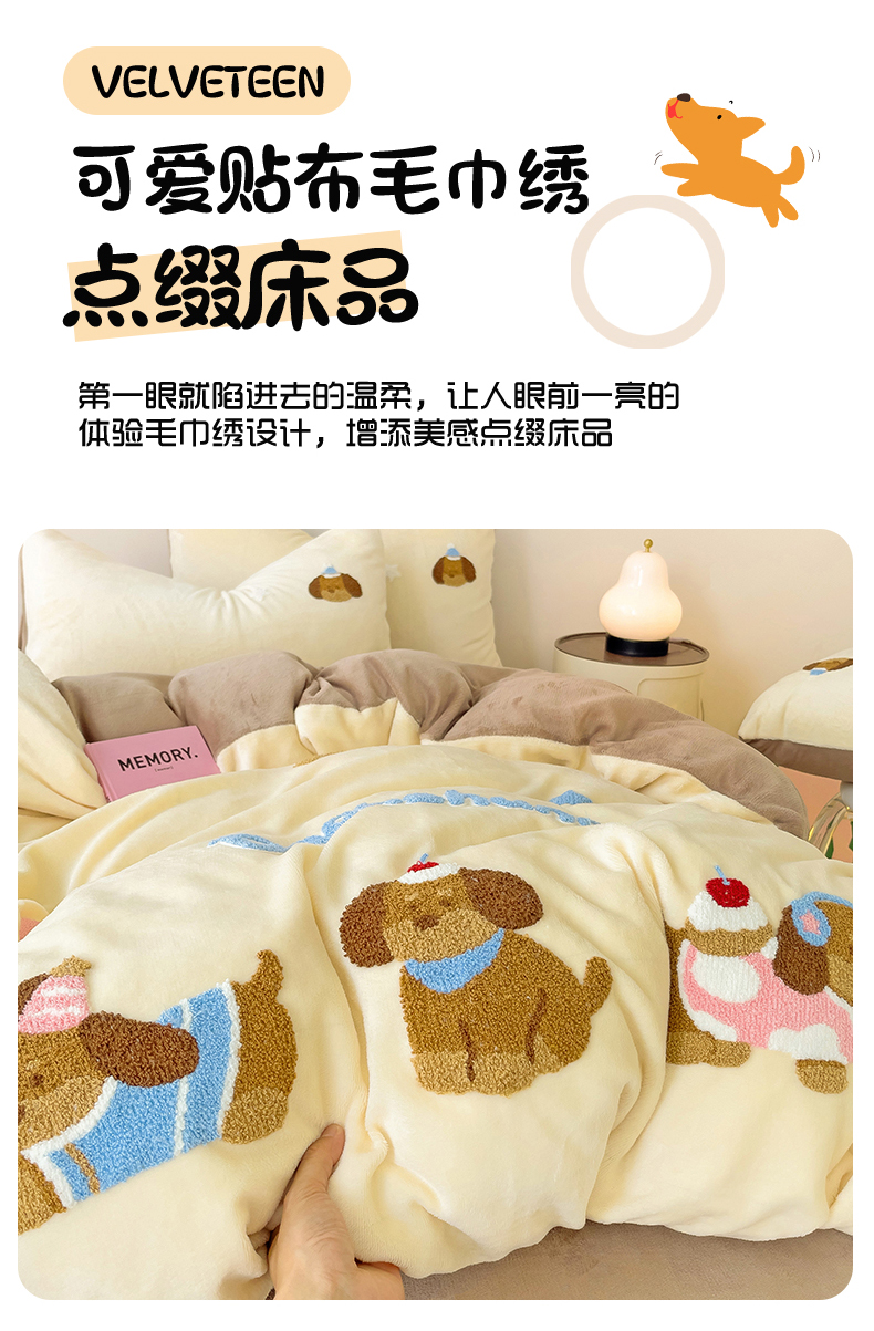 商品名称:梦之岛 2024新款牛奶绒卡通毛巾绣四件套腊肠狗 腊肠狗-浅驼
