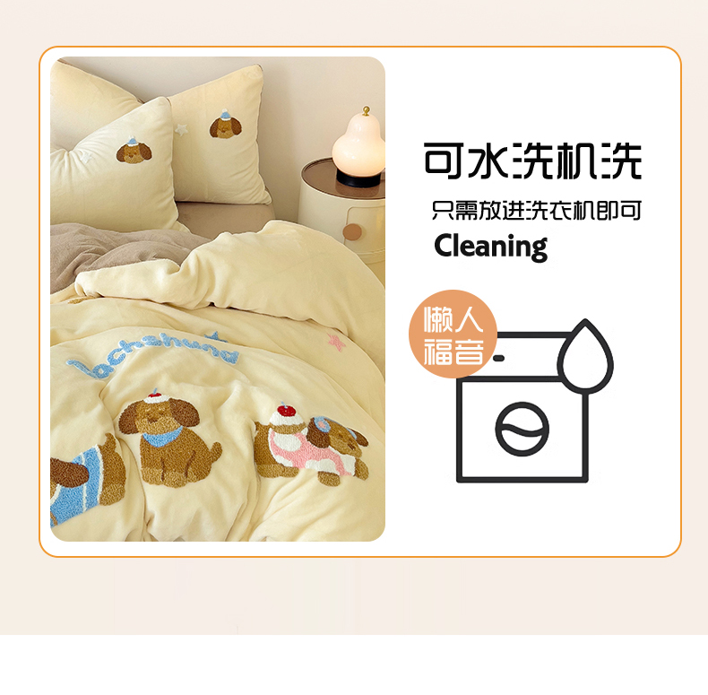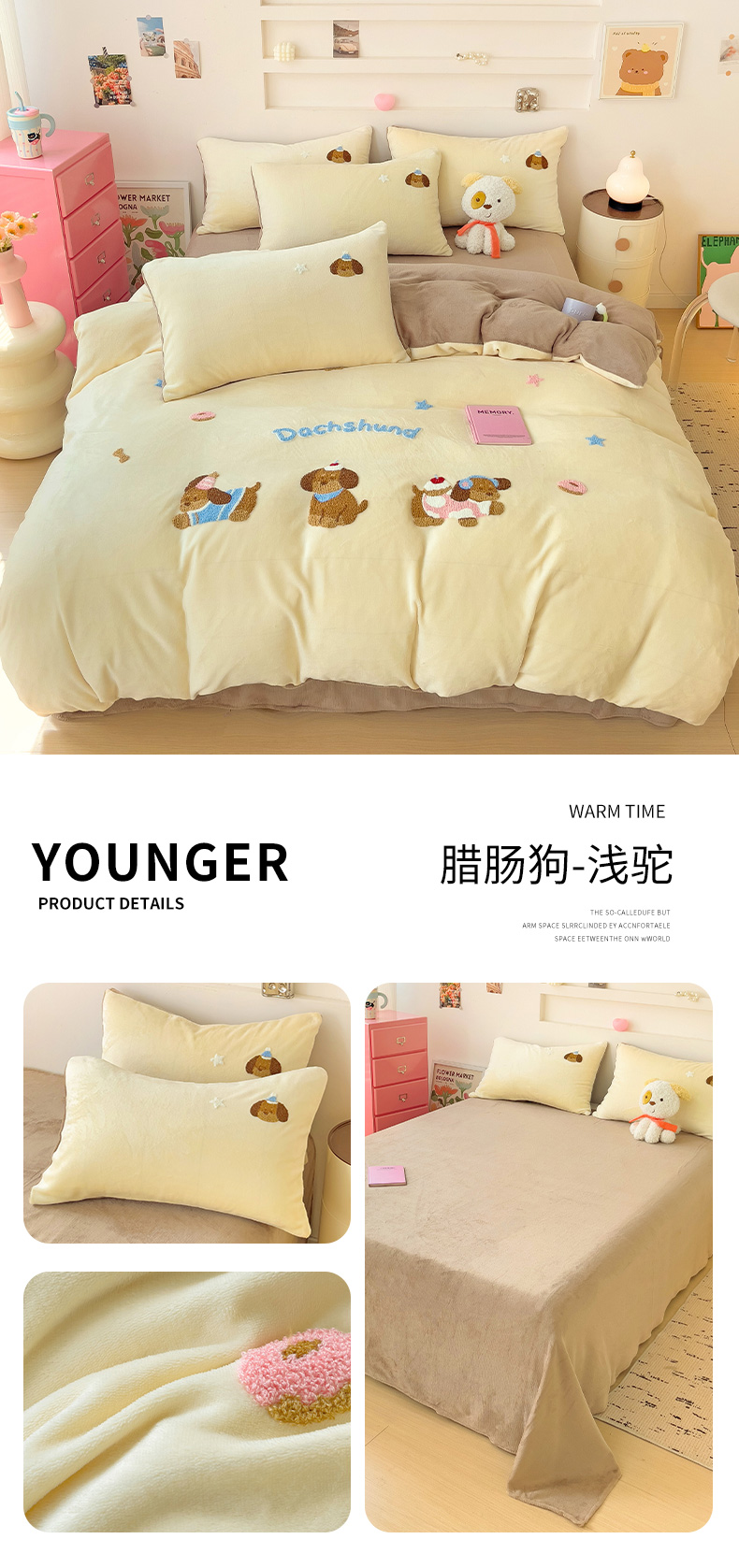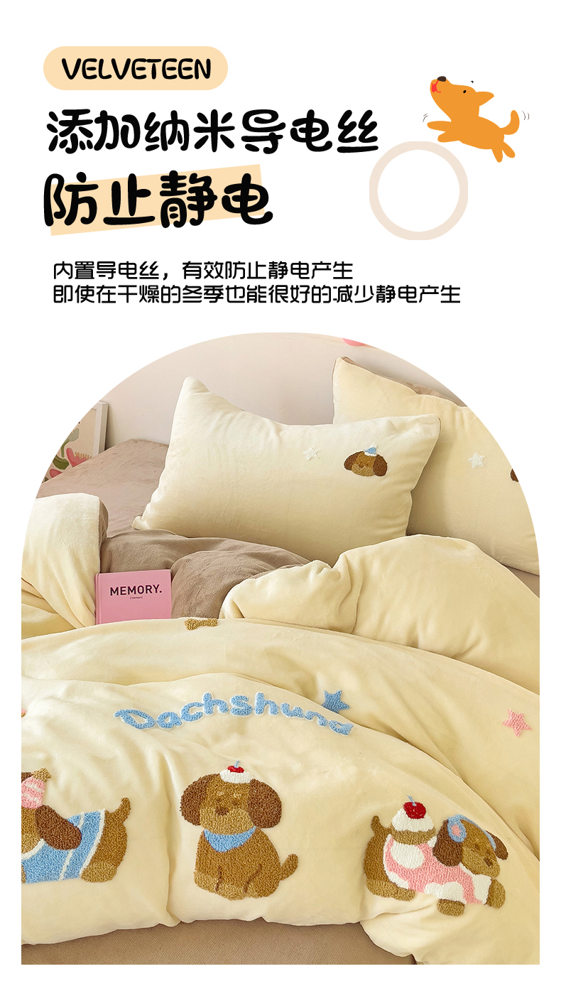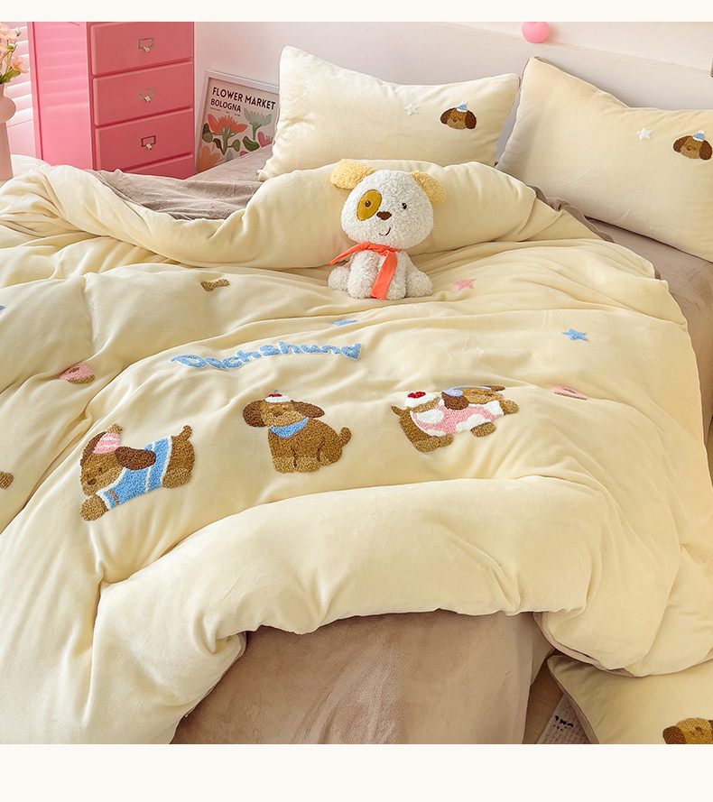 商品名称:梦之岛 2024新款牛奶绒卡通毛巾绣四件套腊肠狗 腊肠狗-浅驼
