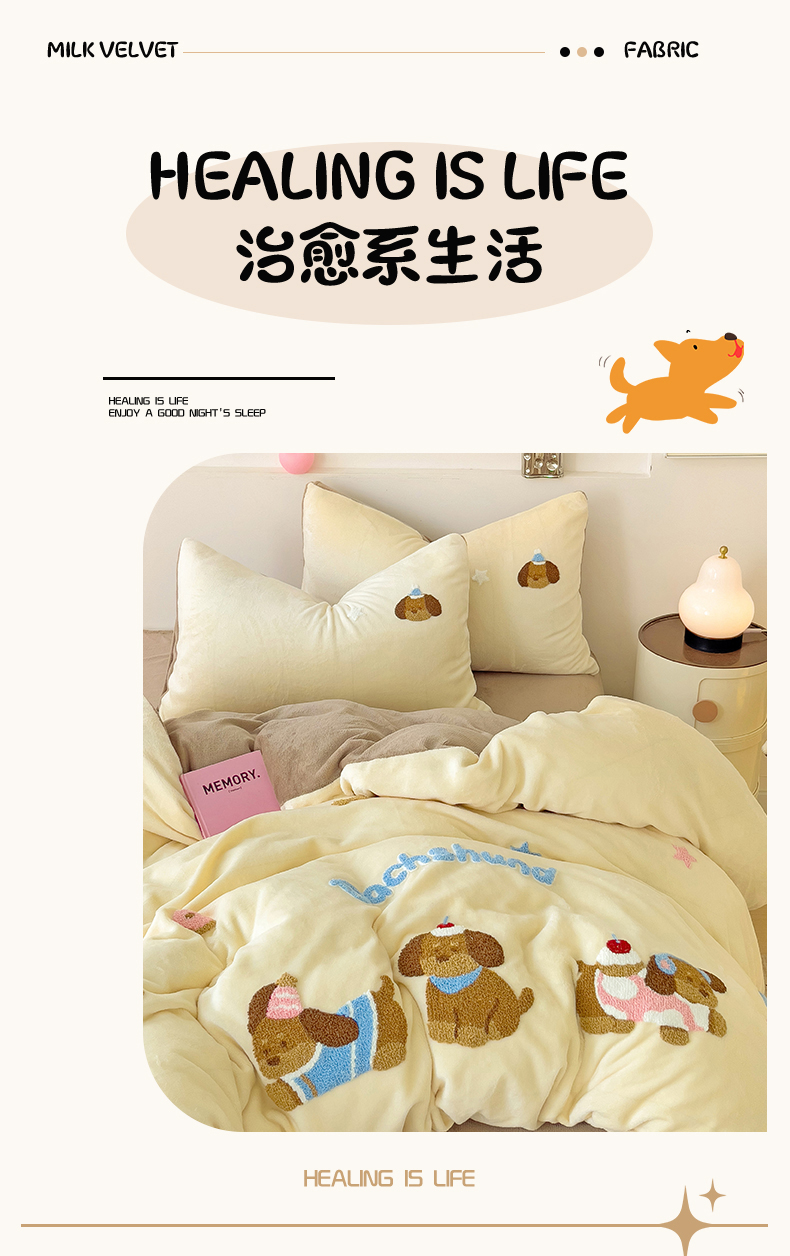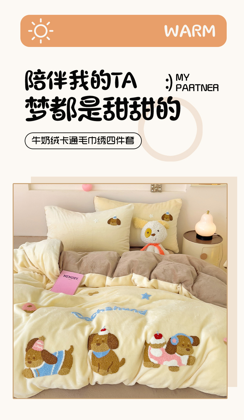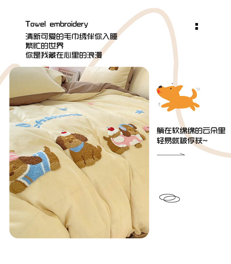 (总)梦之岛 2025新款高克重大版牛奶绒卡通毛巾绣四件套,可爱狗-蓝,可爱狗-浅驼,幸运兔-粉,幸运兔-黄