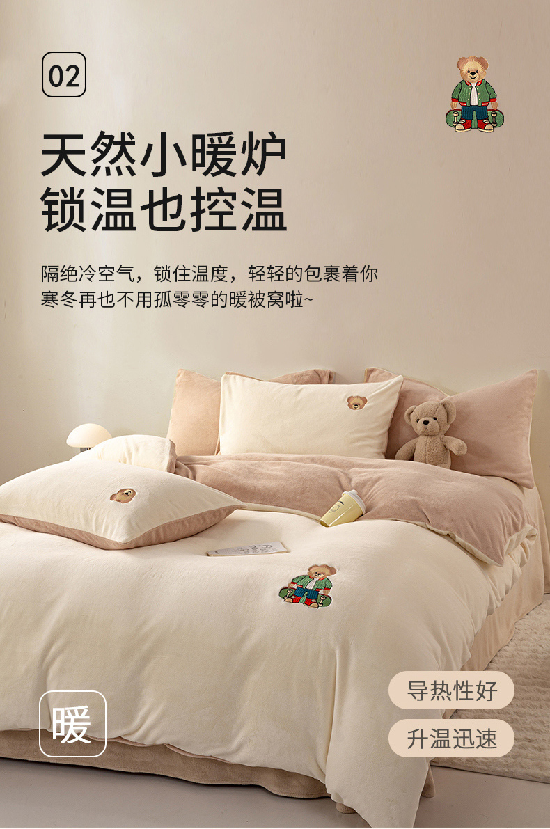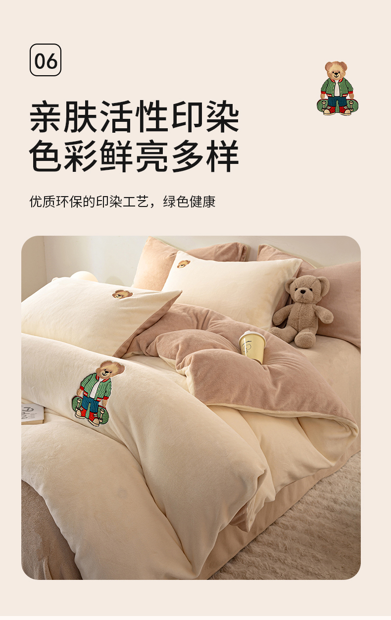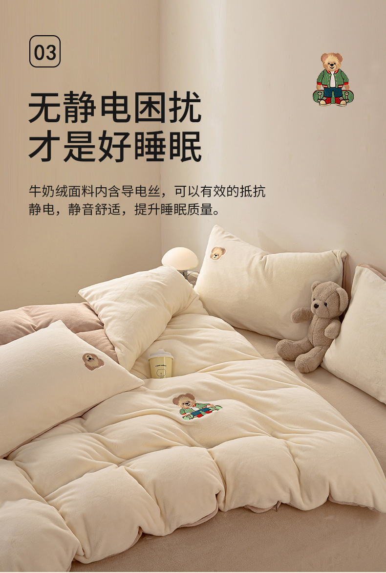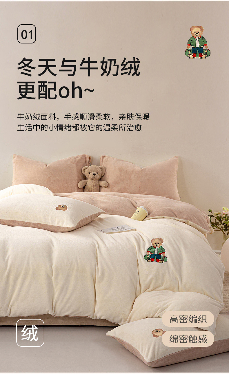 当前位置: 91家纺网 > 商品网购 > 床品套件 > 四件套 > 牛奶绒四件套 > 沐晴家纺 2024新品秋冬加厚牛奶绒纯色简约绣花卡通四件套 滑板熊(白+米驼)