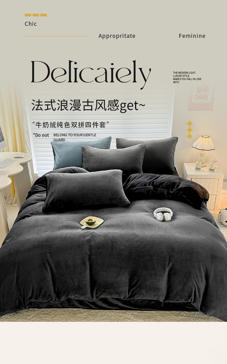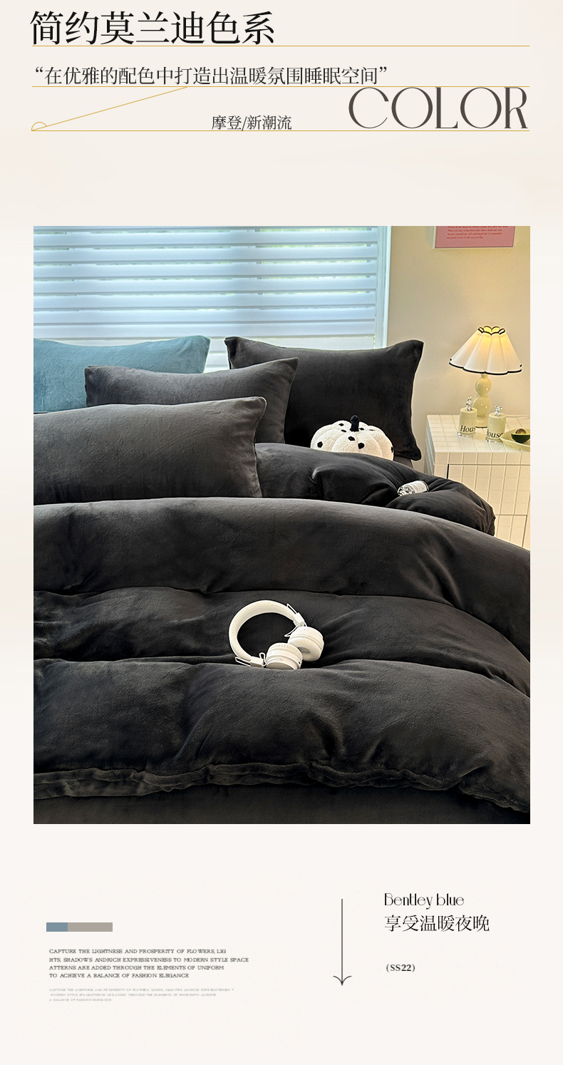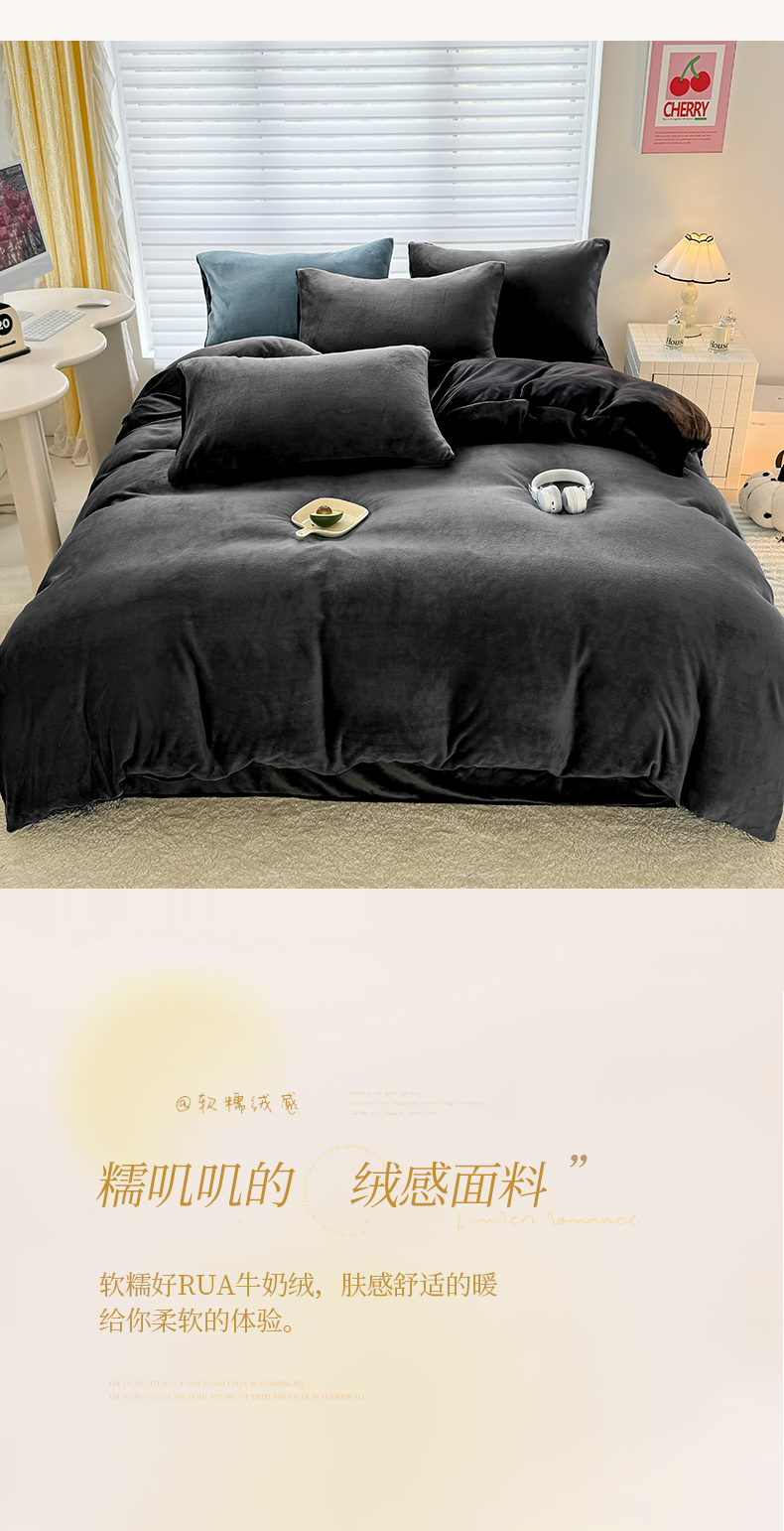 (总)觅妮家纺 2025新款纯色高克重牛奶绒四件套系列,果绿粉,宝石蓝,高级黑,卡其黑,柠檬粉,浅粉灰,深浅灰,树莓粉