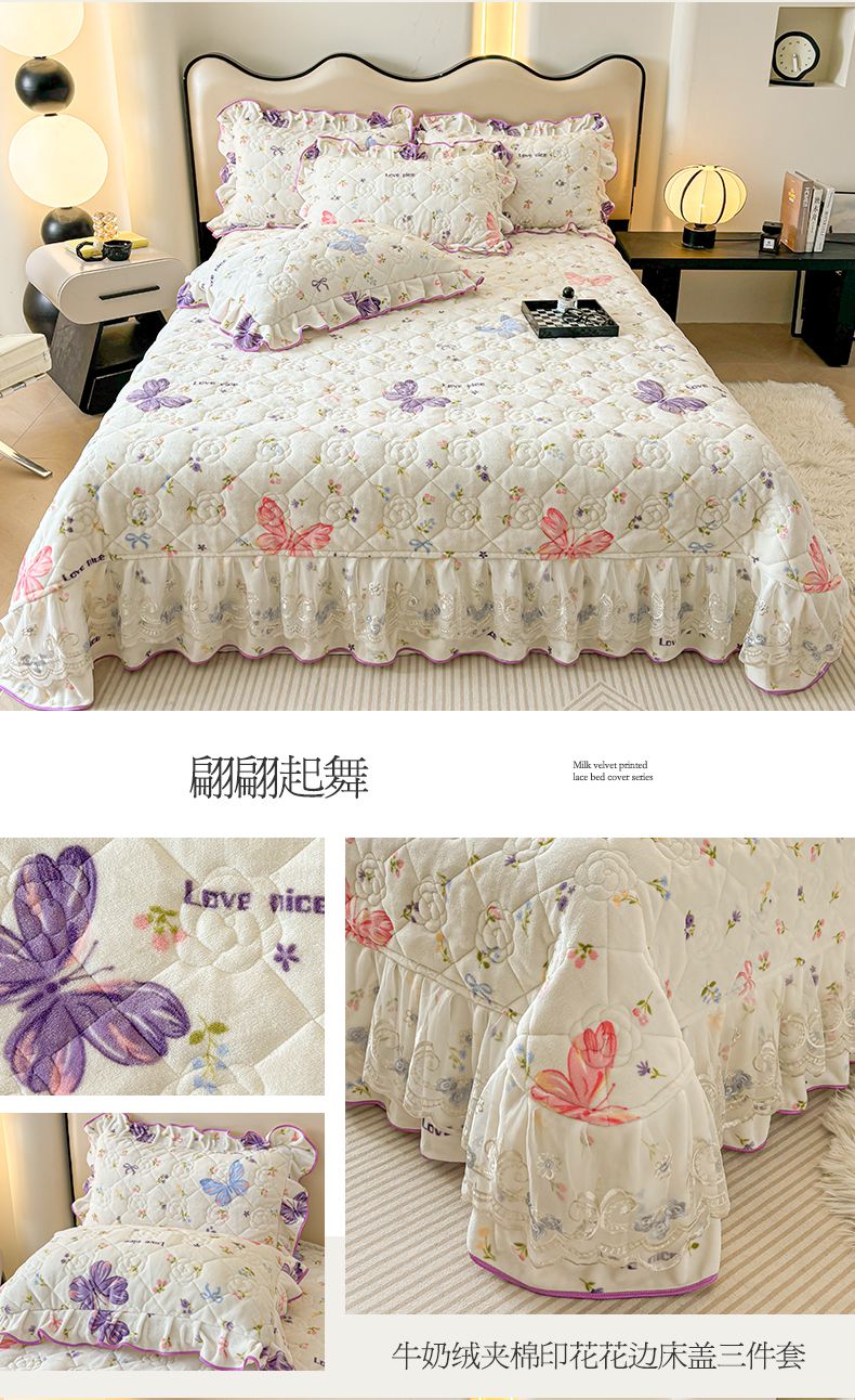 当前位置: 91家纺网 > 商品网购 > 床品套件 > 三件套 > 宜凡家纺 2024新款牛奶绒印花夹棉花边床盖三件套 欧曼情调