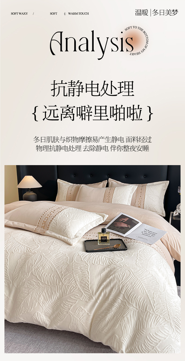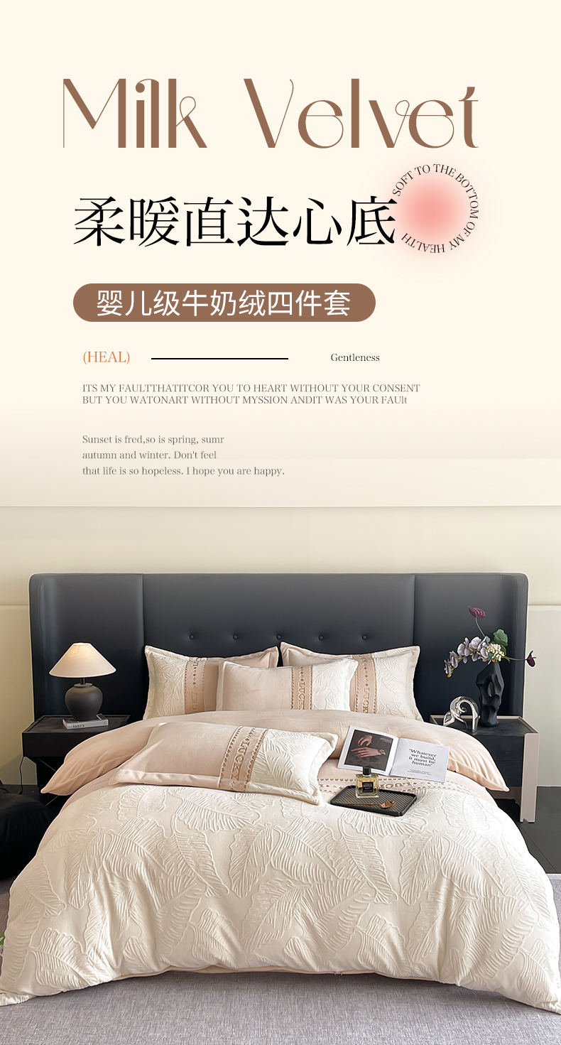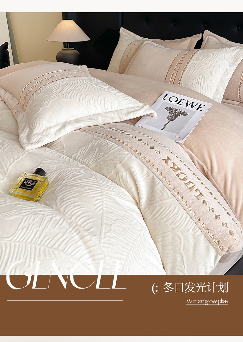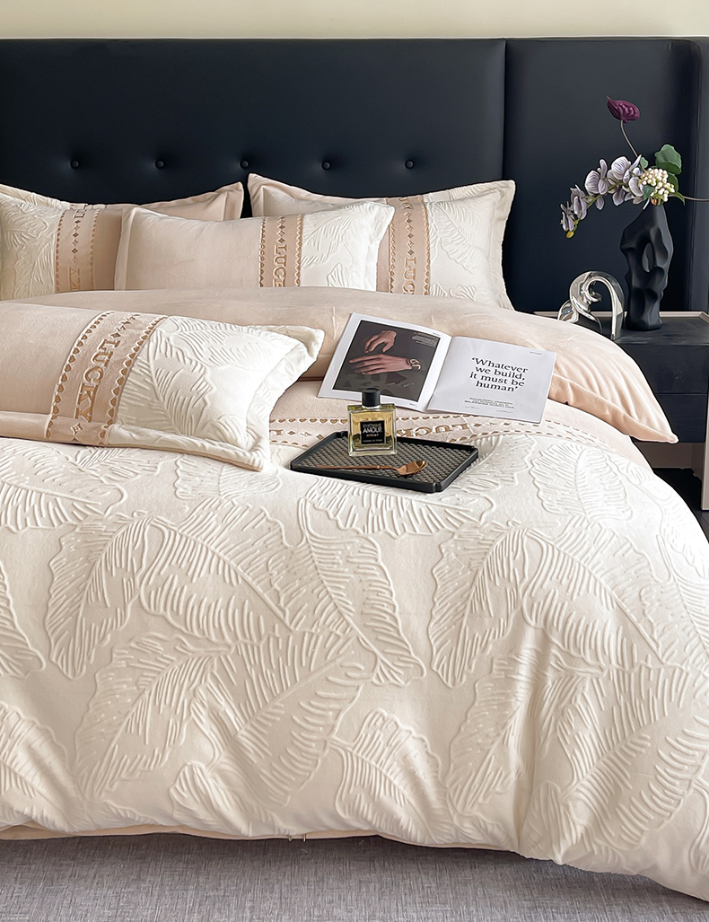 商品名称:金窝窝家纺 2024新款婴儿级牛奶绒拼接刺绣烂花雕花绒四件套--朱丽叶系列 朱丽叶-咖