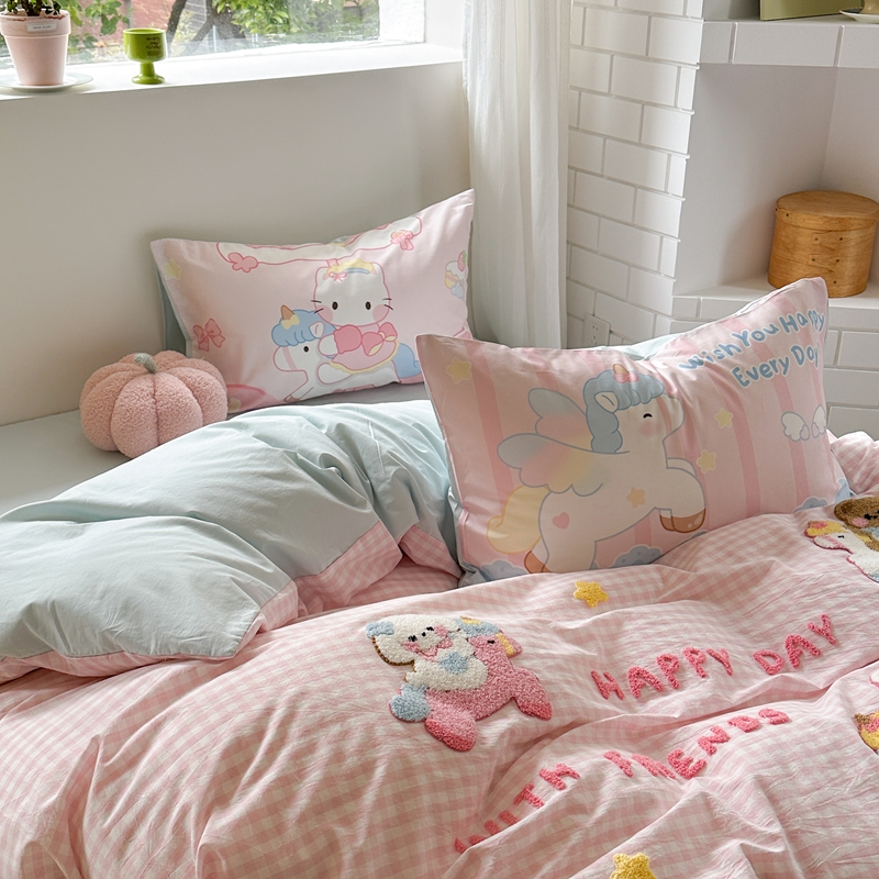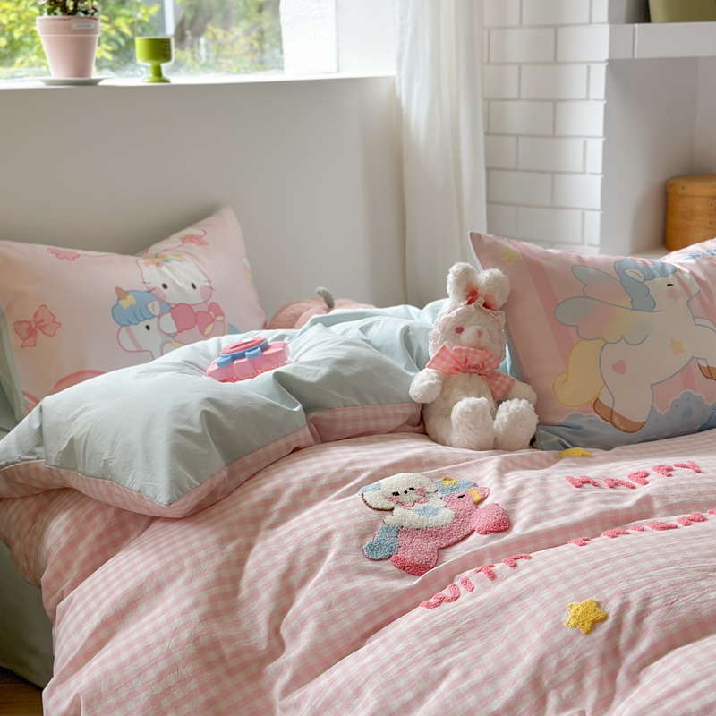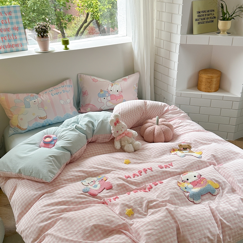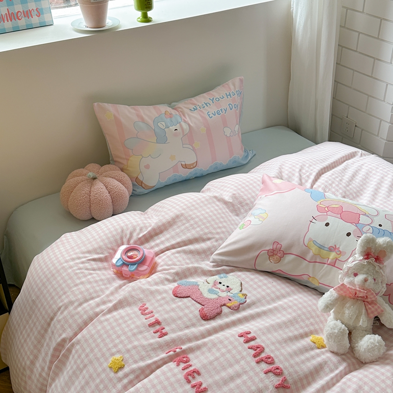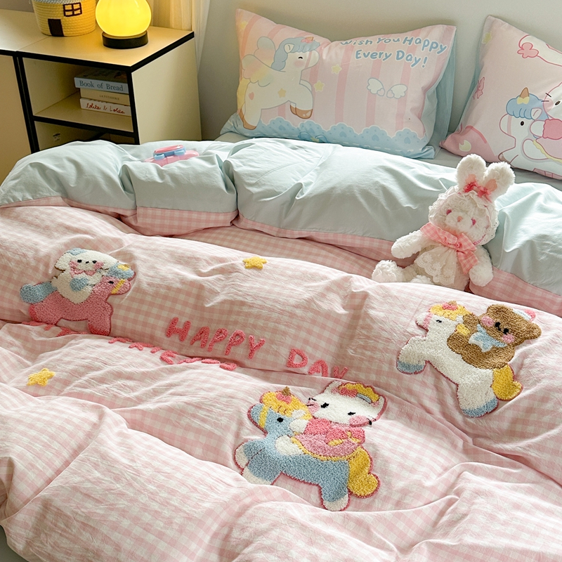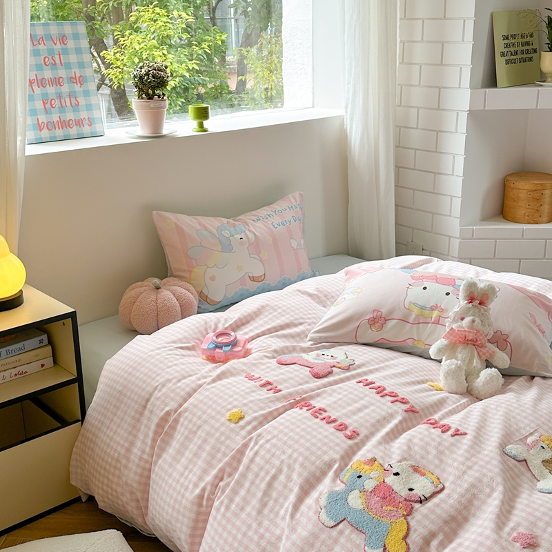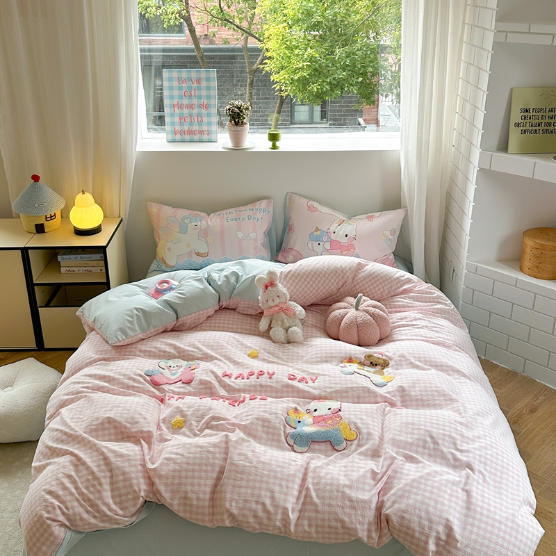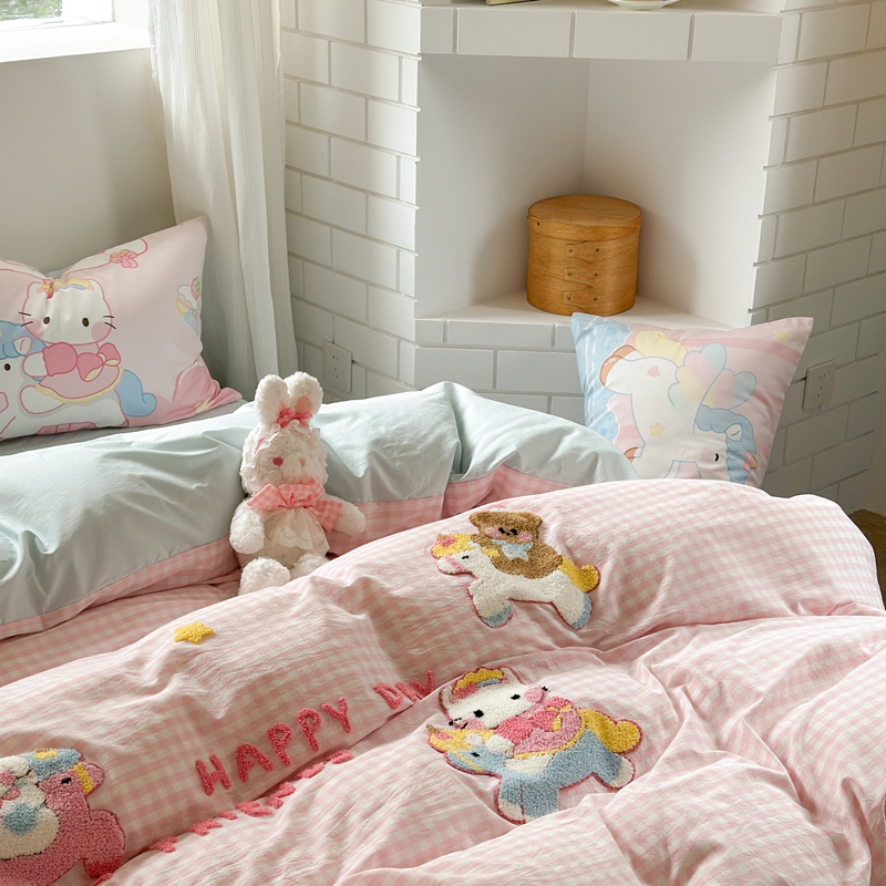 柚子YOUTH 2025新款水洗棉条格毛巾绣四件套 木马kitty