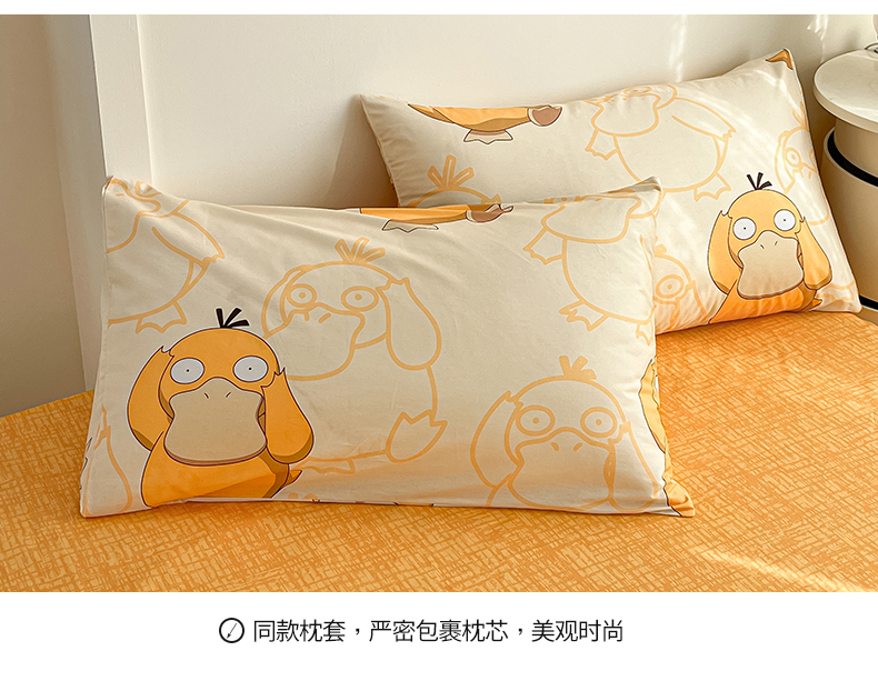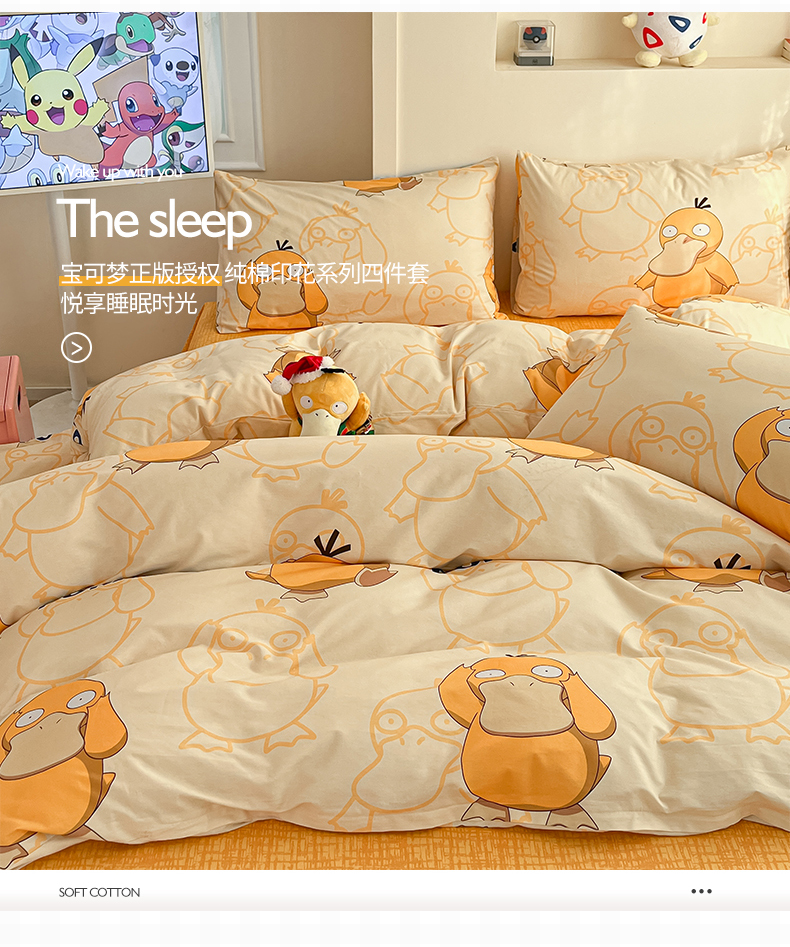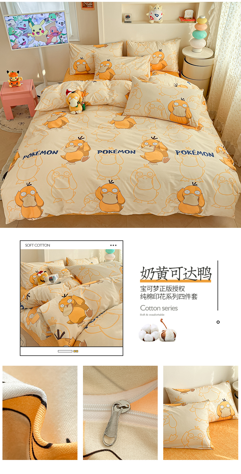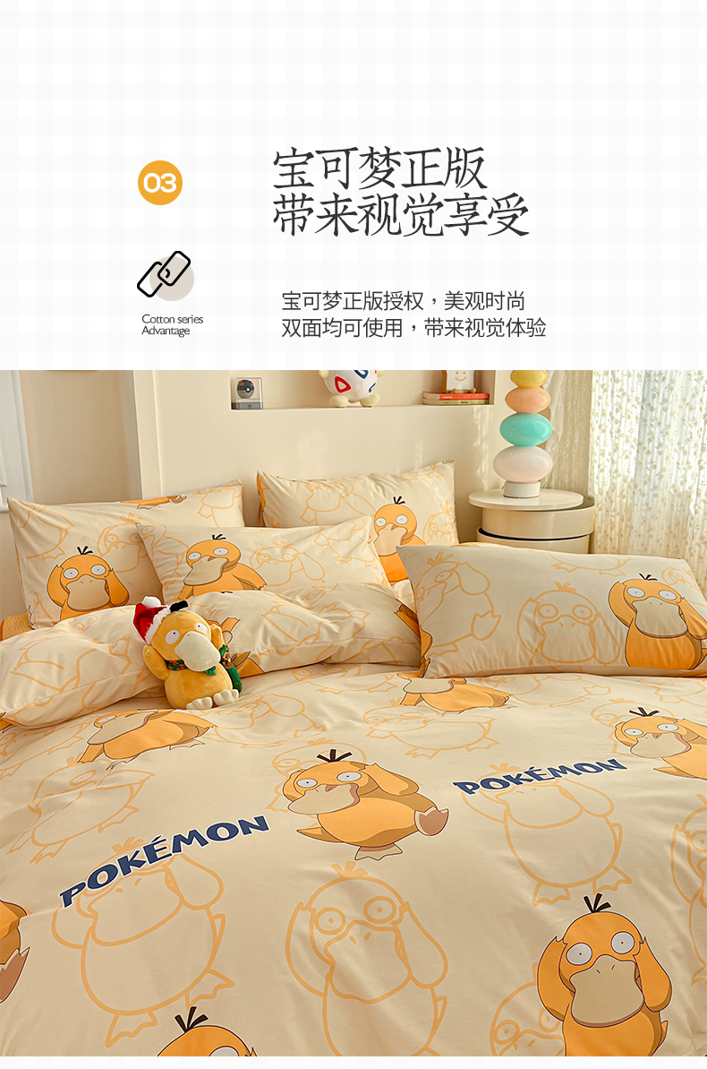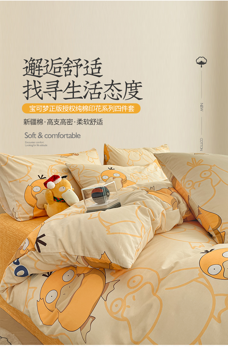 当前位置: 91家纺网 > 商品网购 > 床品套件 > 四件套 > 全棉普通四件套 > 桃子家居 2025新款宝可梦正版授权皮卡丘纯棉印花系列四件套 棉宝可梦-奶黄可达鸭