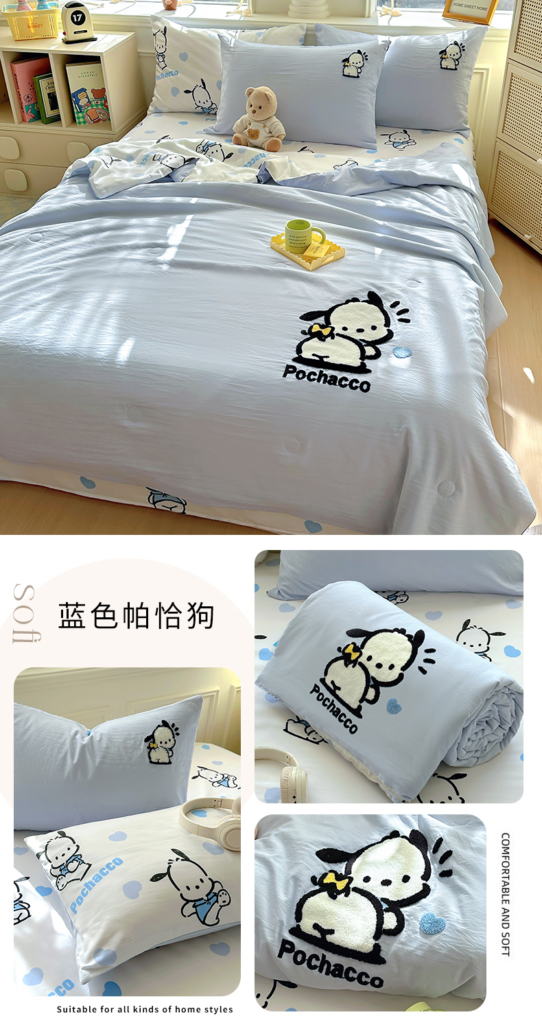 商品名称:木堇家居 2025春夏三丽鸥云柔棉毛巾绣夏被四件套 毛巾绣-蓝色帕恰狗
