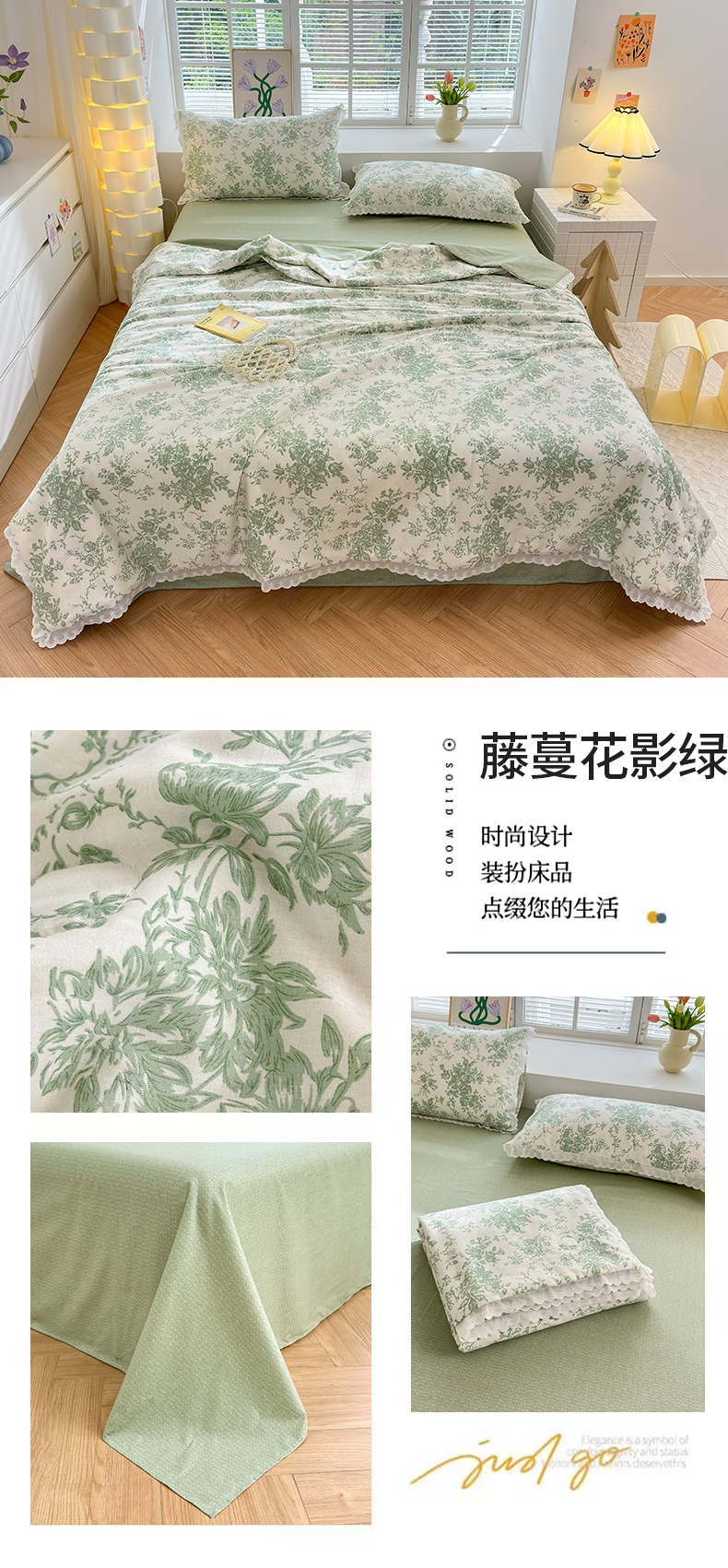 被窝家纺 2025新款全棉花边大豆夏被四件套 藤蔓花影-绿