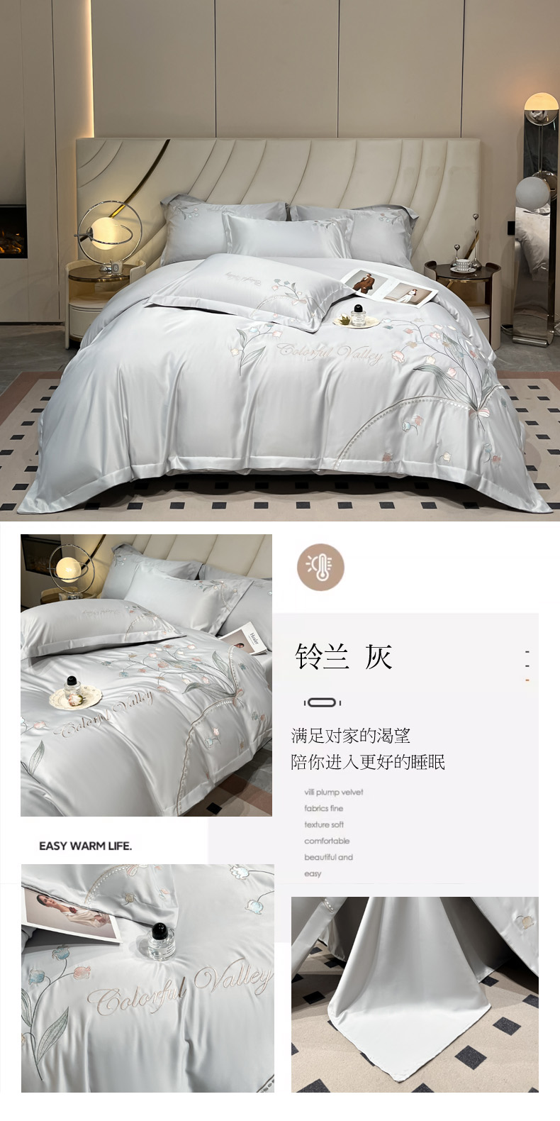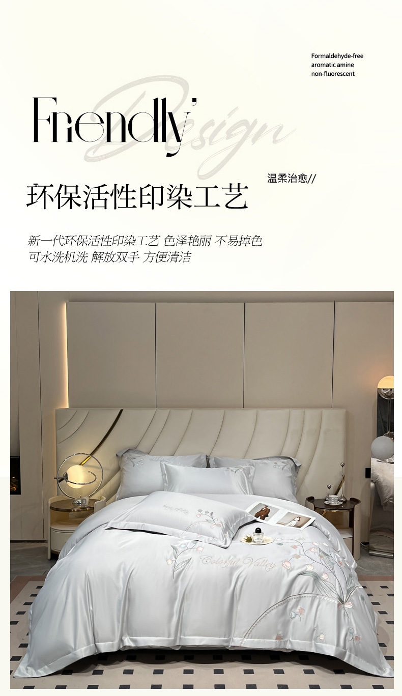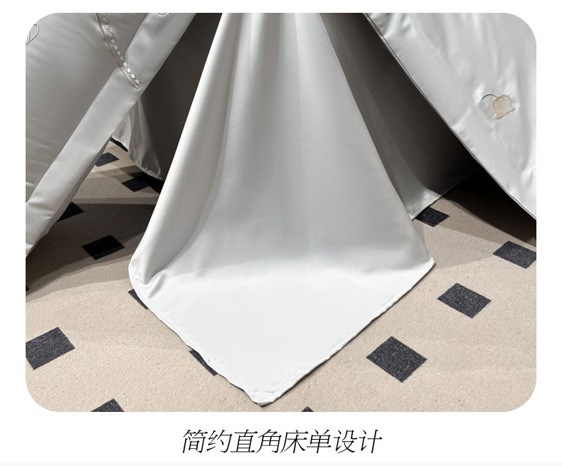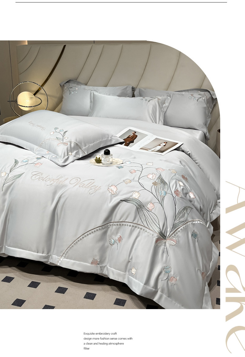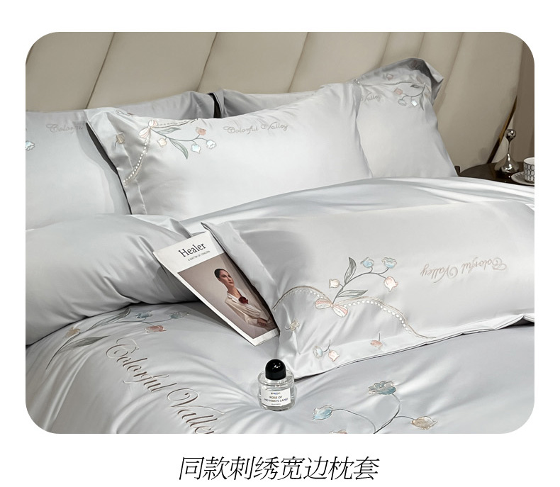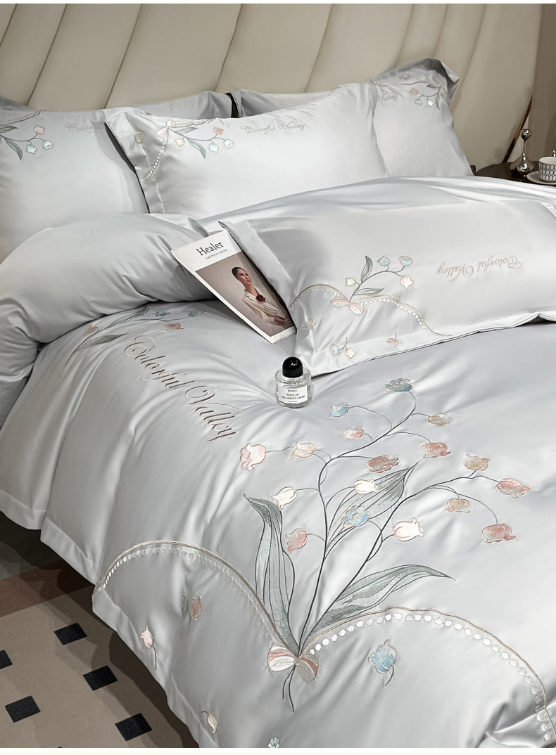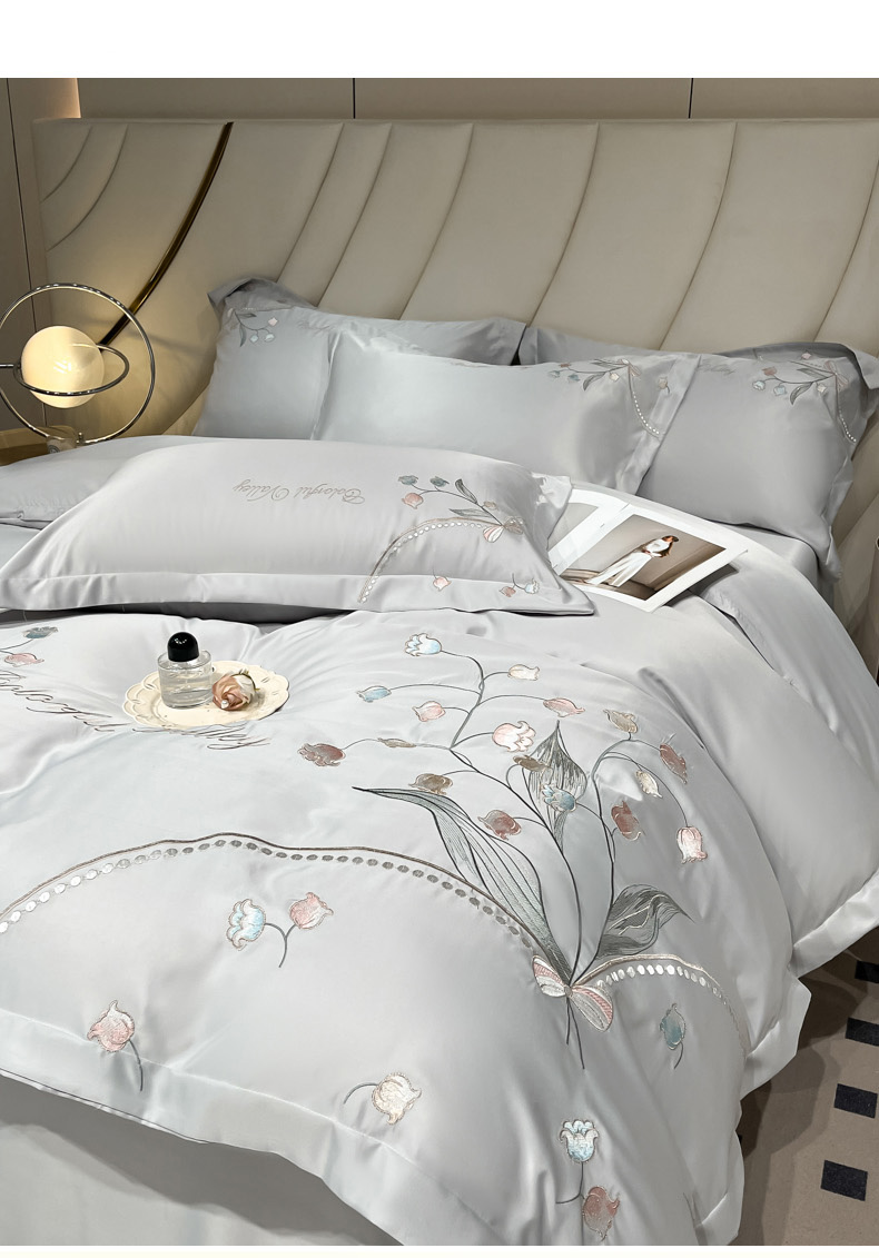 商品名称:菲儿家纺 2025新款轻奢简约冰丝刺绣四件套-铃兰 铃兰-灰