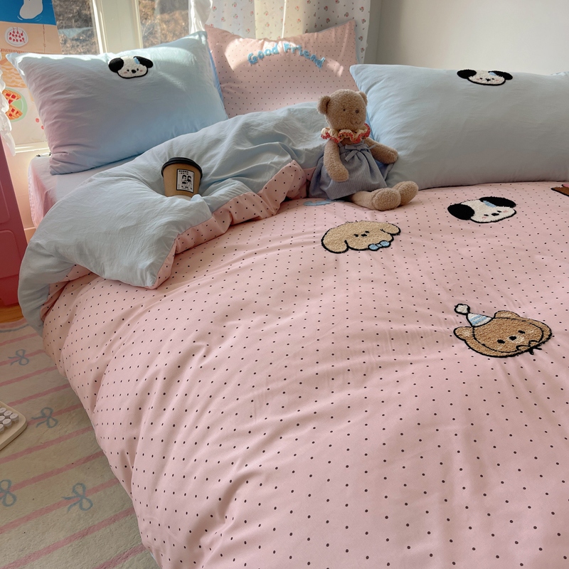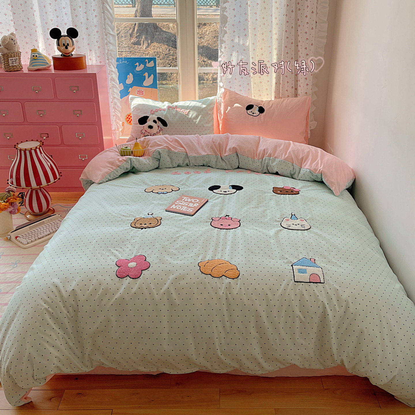 (总)顾里家纺 2024新款ins奶萌格子狗狗毛巾绣牛奶绒四件套,粉格小狗,黄格小狗,咖格小狗,蓝格小狗,绿格小狗