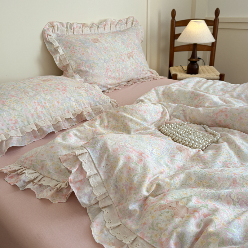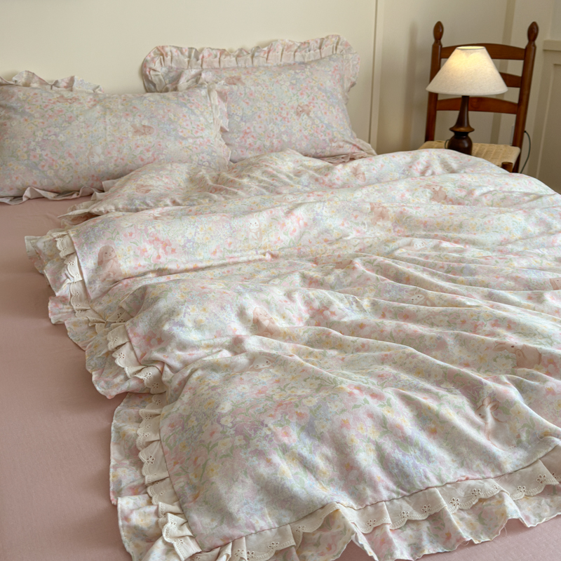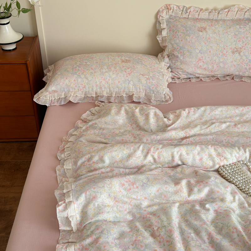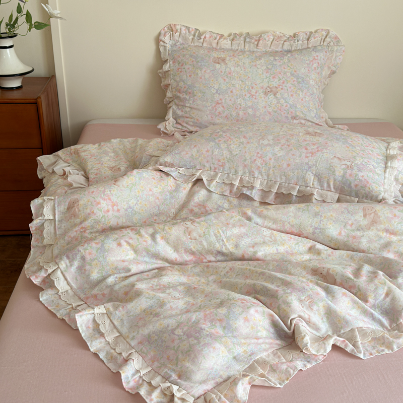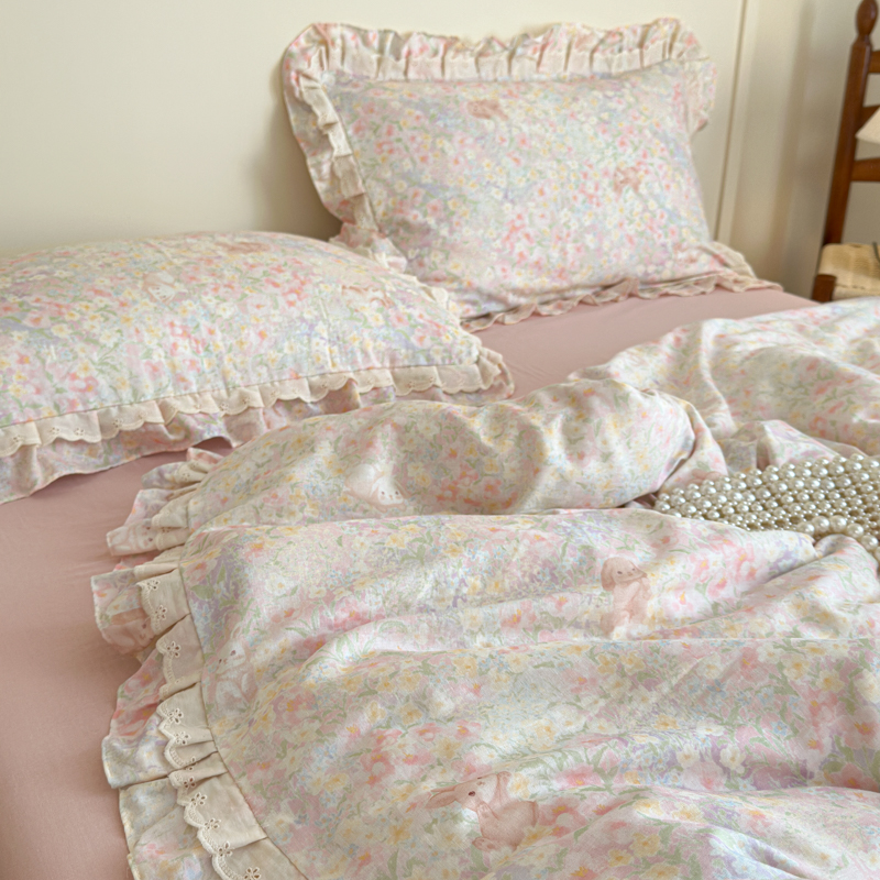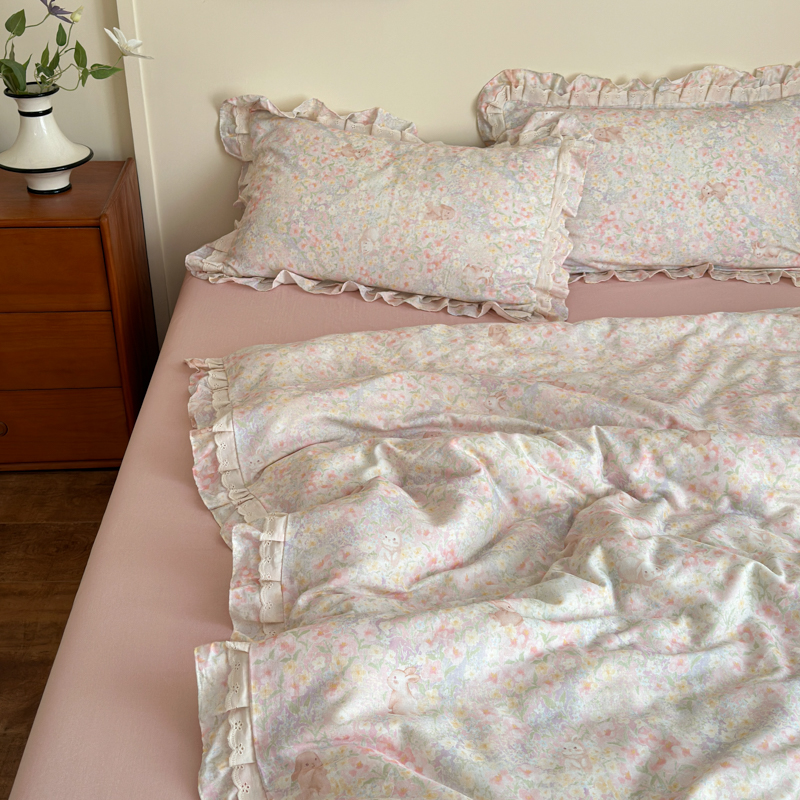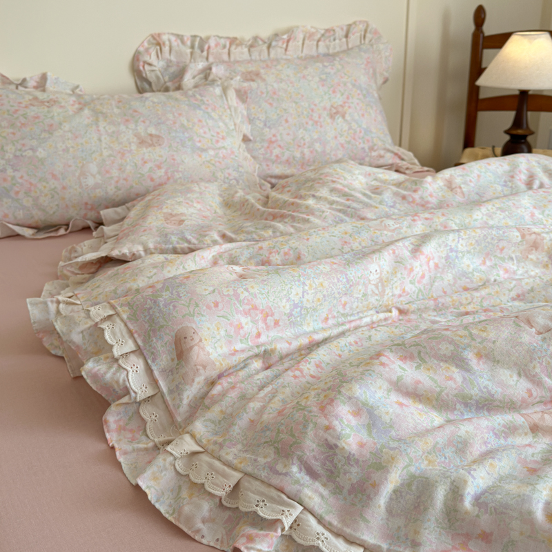 当前位置: 91家纺网 > 商品网购 > 床品套件 > 四件套 > 双层纱四件套 > 乐童家纺 2025纯棉A类双层纱双花边工艺小清新四件套 丛林小兔