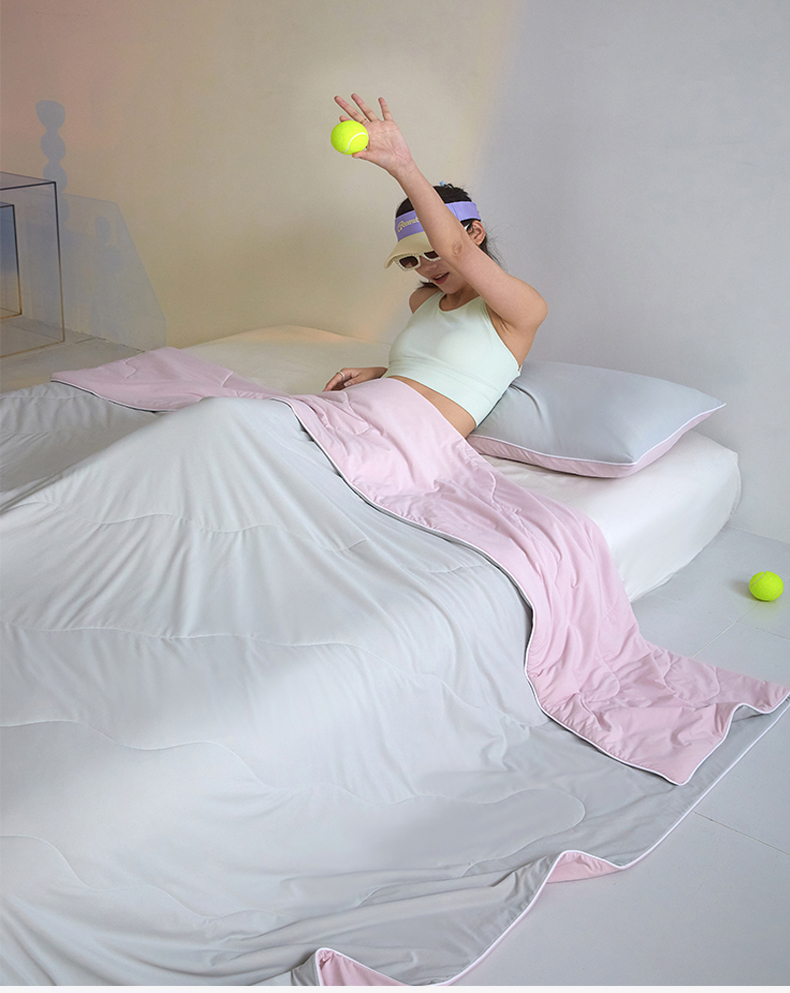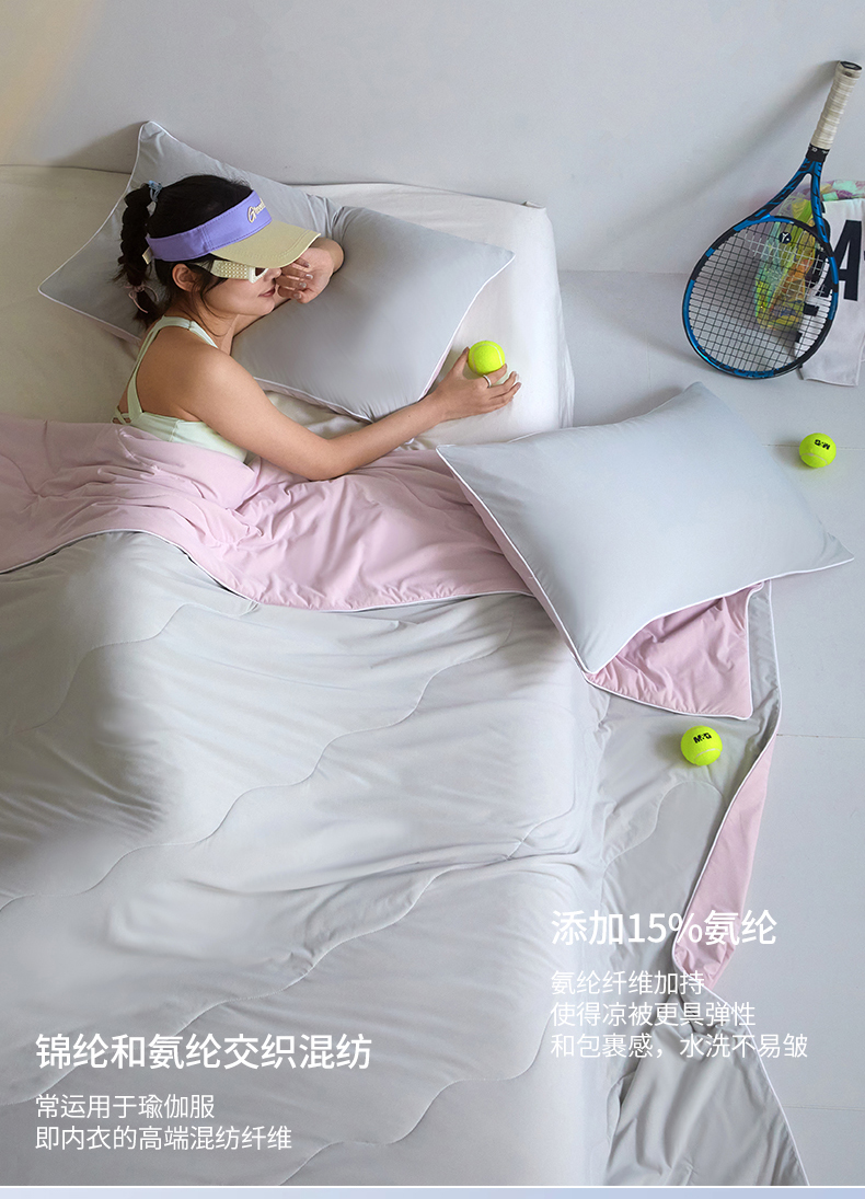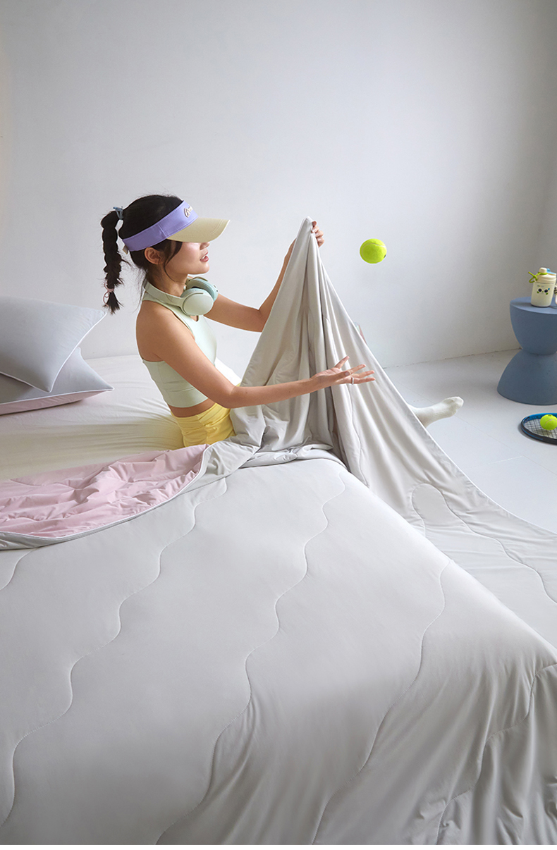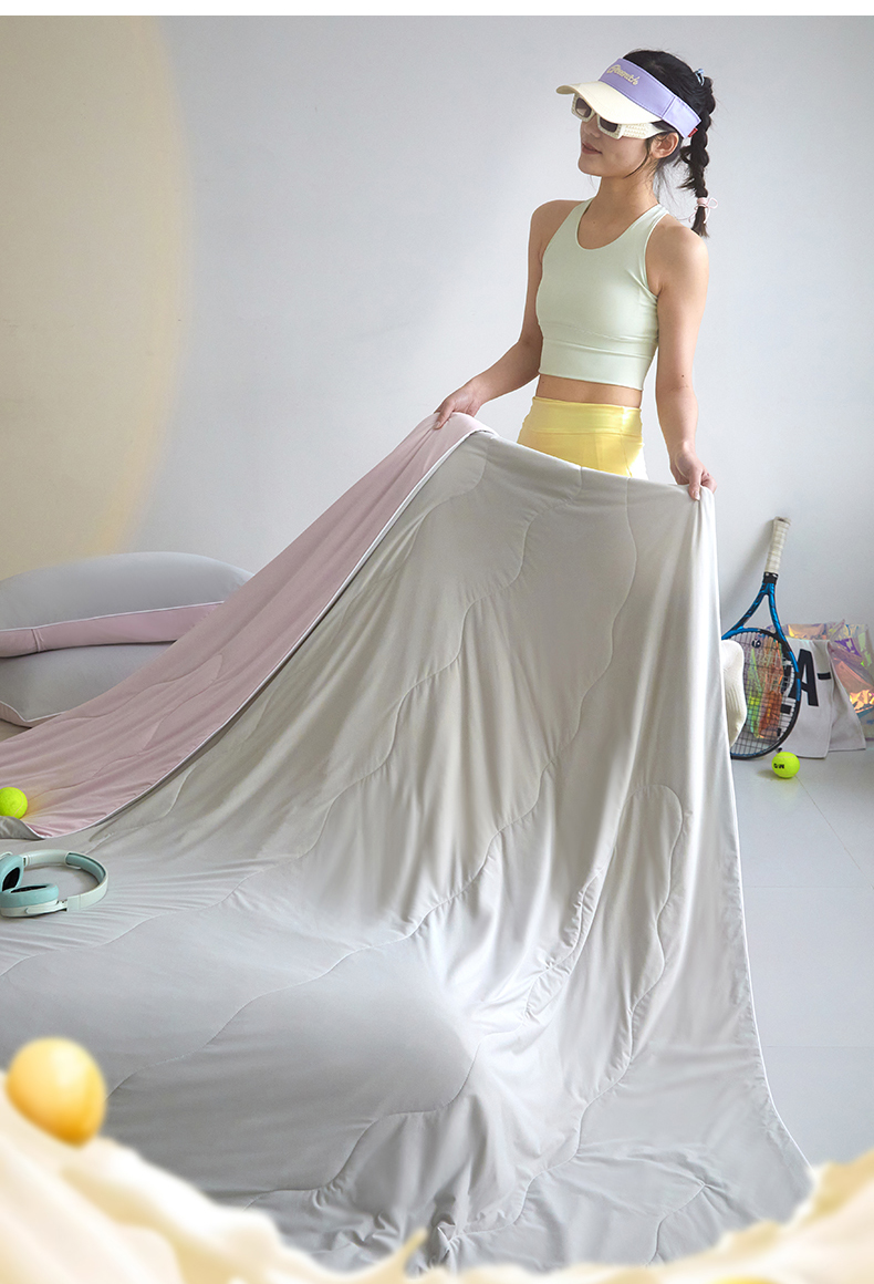 被子 > 夏被 > 头等舱 2025新款4.0版凉感A类锦氨(165克)55大豆抗菌夏凉被夏被配礼盒模特图 浅灰拼浅豆沙