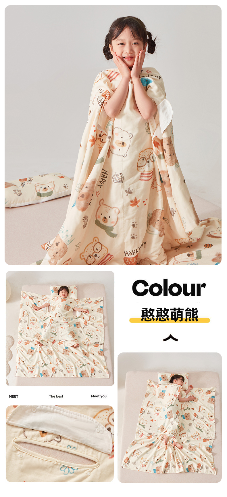 艾佳宝贝 2025A类全棉纱布护肚防踢睡袋多功能盖毯宝宝夏被 憨憨萌熊