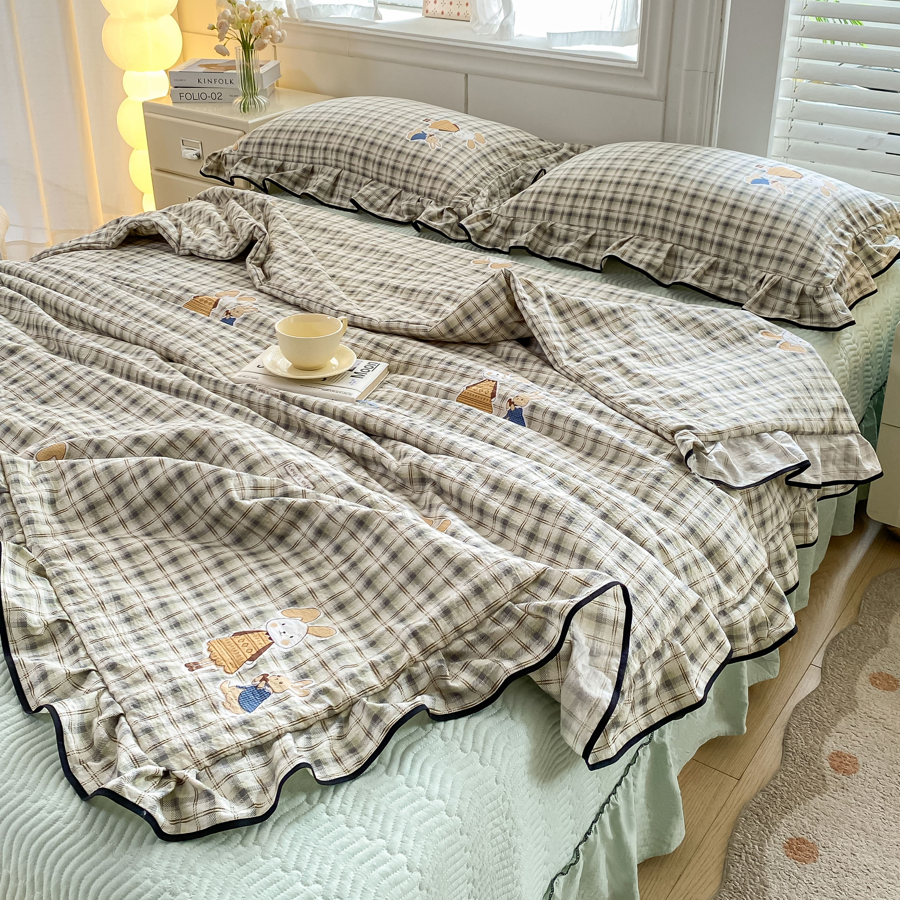 (总)希朵家纺 2025新款木棉皱皱纱活套多功能床盖夏被四件套,红格,蓝格,绿咖格,紫格