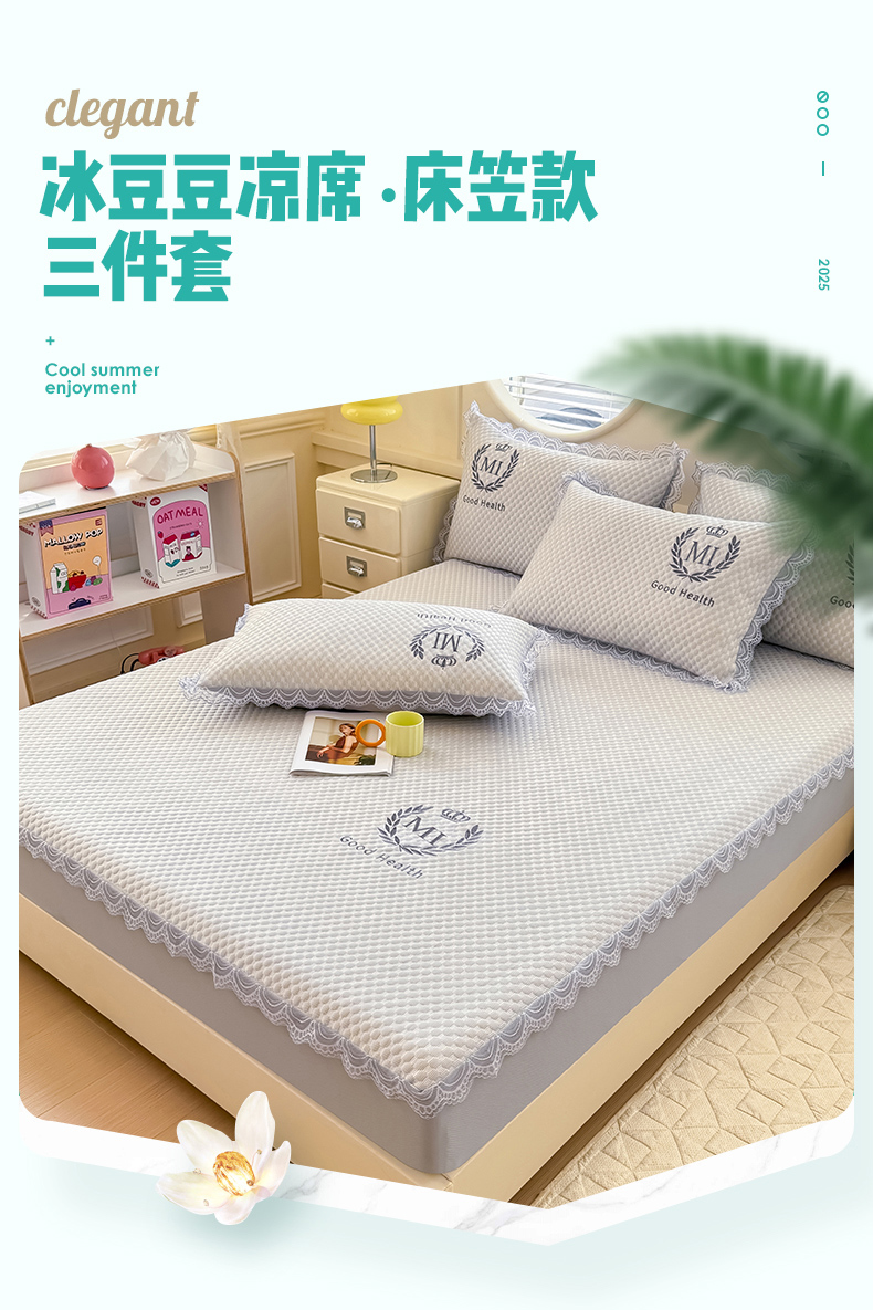 莉莉安家纺 2025新款禾风系列工艺款凉豆豆凉席床笠款三件套单件 禾风-浅灰(枕套)