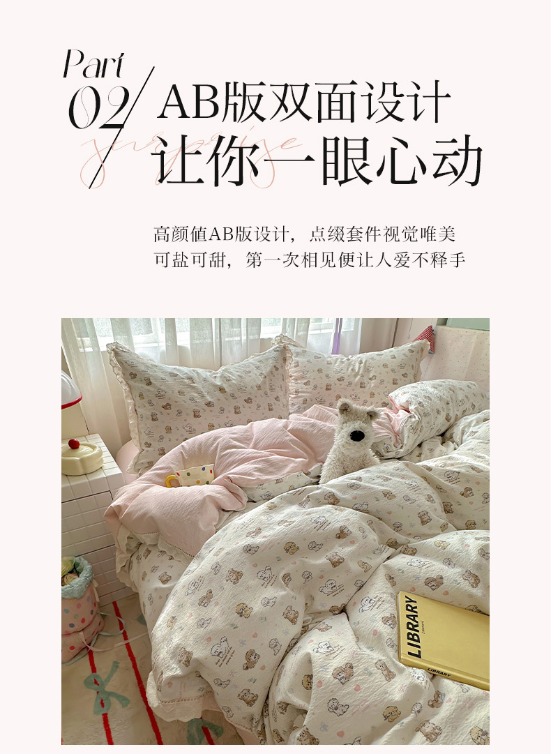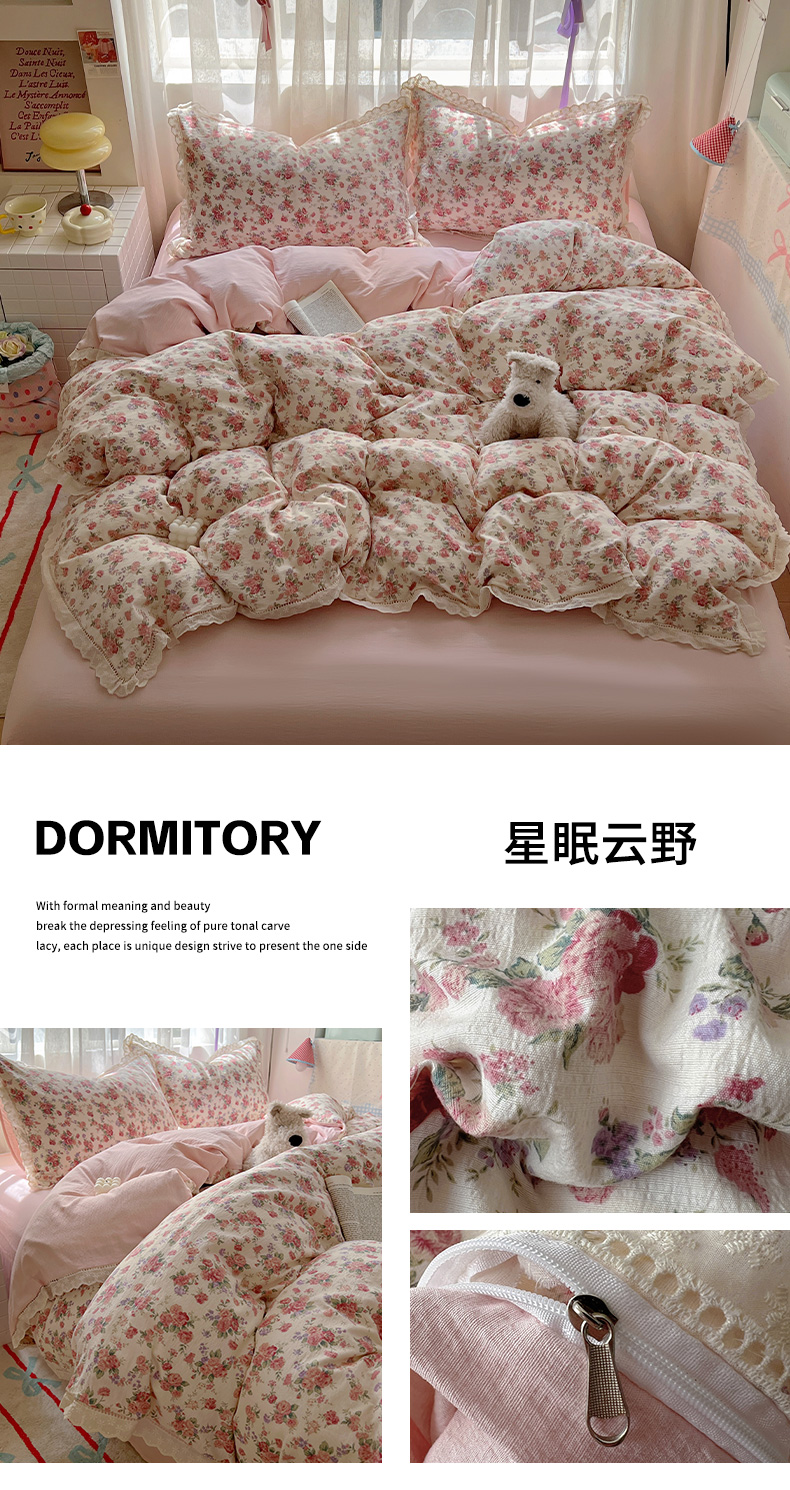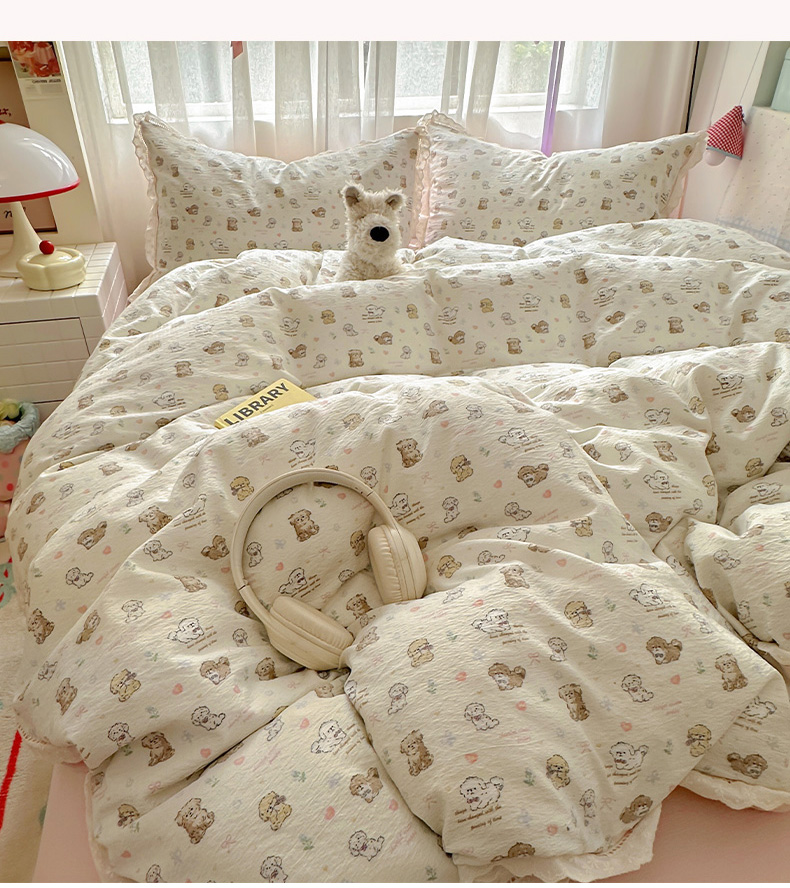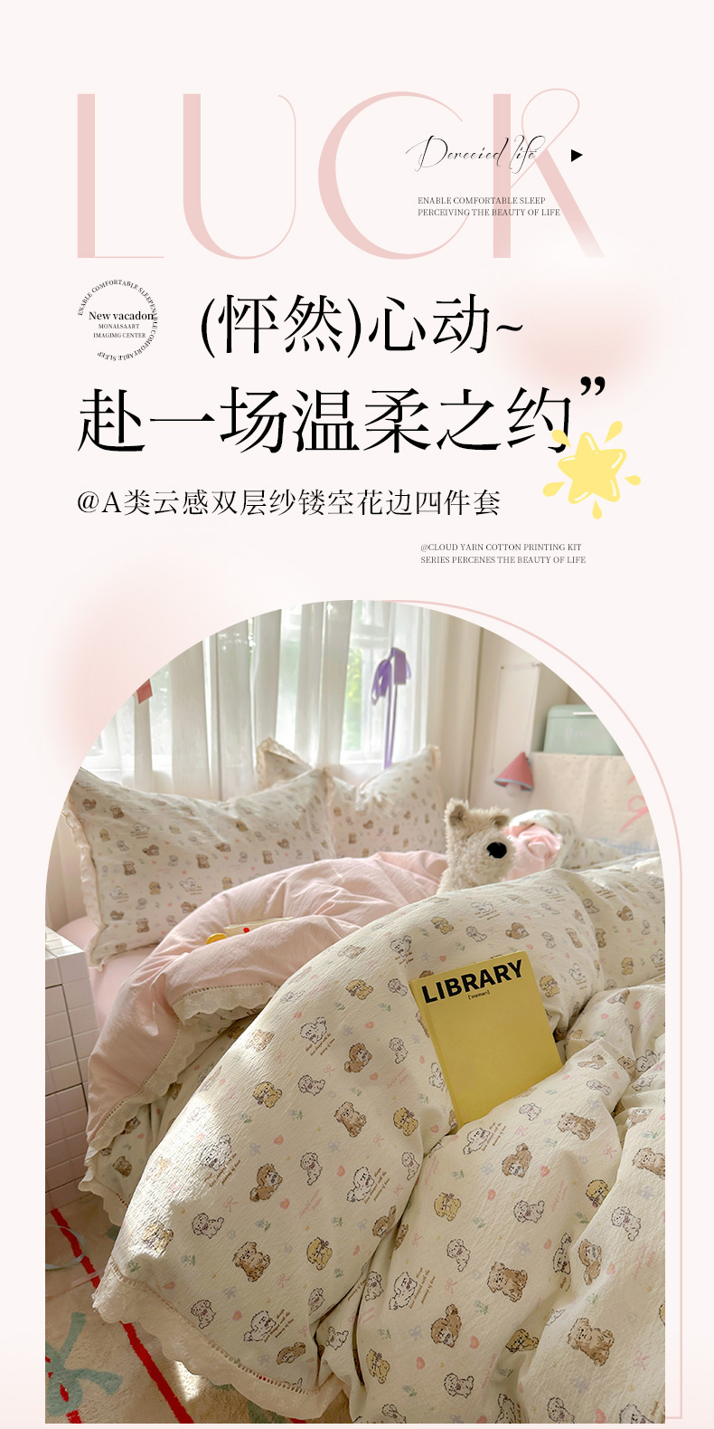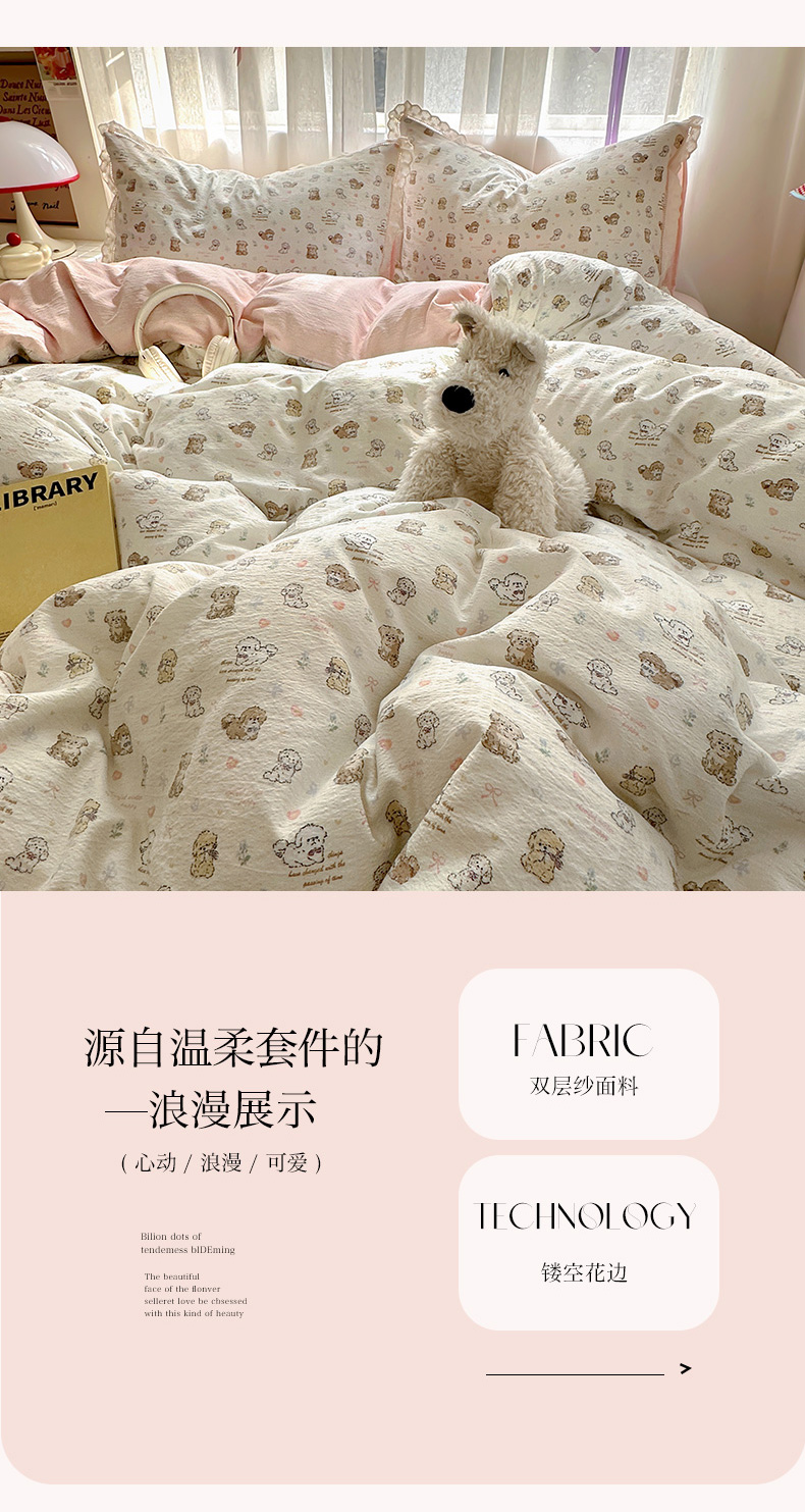 当前位置: 91家纺网 > 商品网购 > 床品套件 > 四件套 > 双层纱四件套 > 罗亿家纺 2025新款云感双层纱全棉镂空花边四件套(提供买家秀) 淡奶油狗