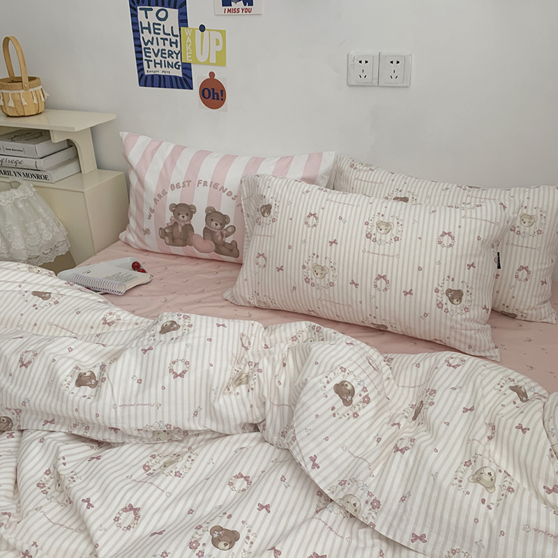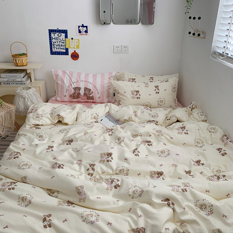 柚可家居 2024新款40支纯棉活性印花四件套-小熊系列-实拍图第二组 奶油小熊蝴蝶结粉