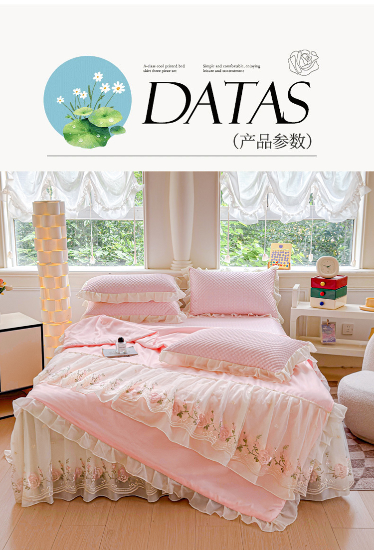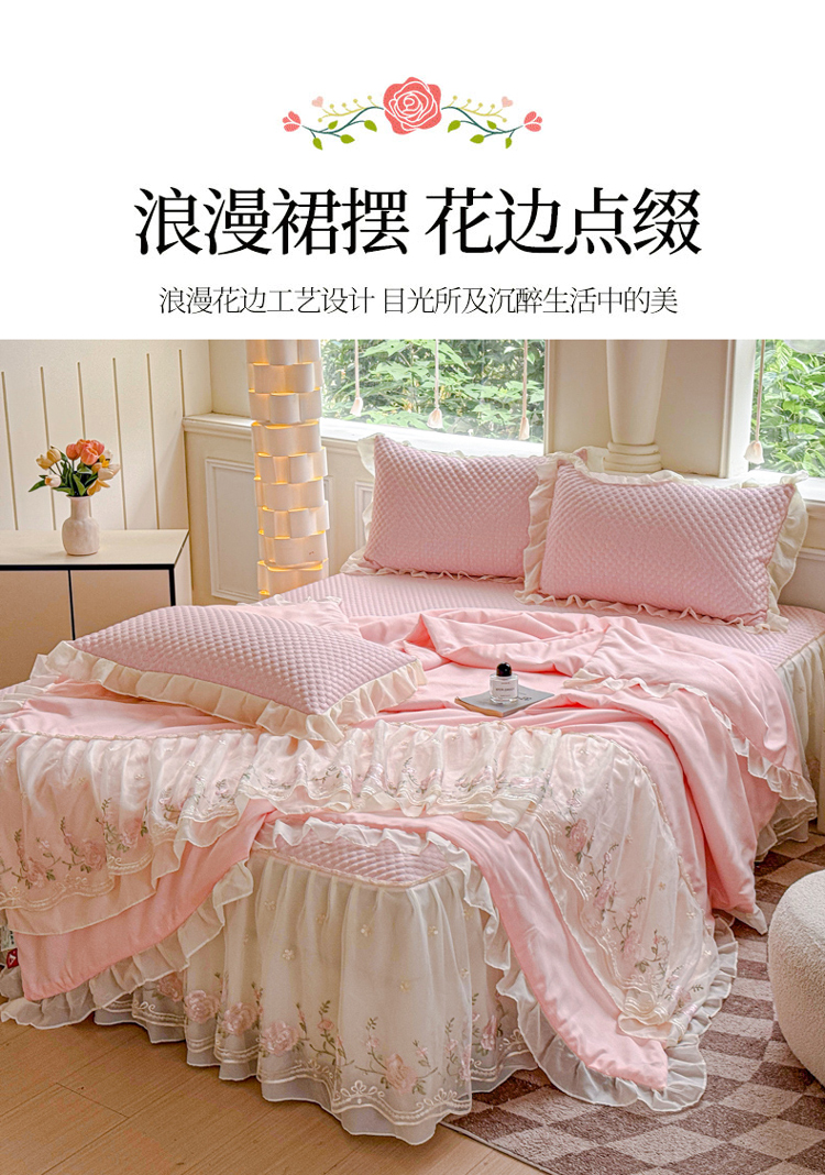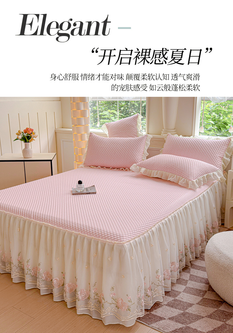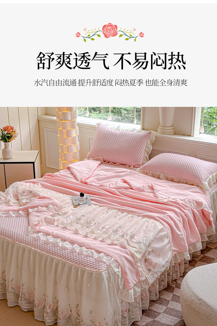 商品名称:漫布云2025新款A类甄选PE凉感丝花边床裙款冰豆豆凉席床盖三件套春夏韩版公主风水洗棉蕾丝夏被 梦幻—樱花粉