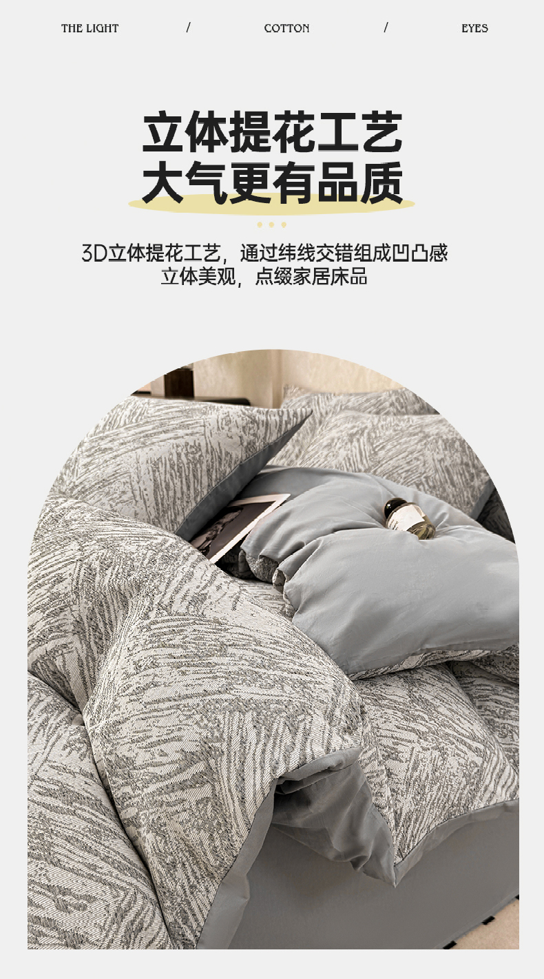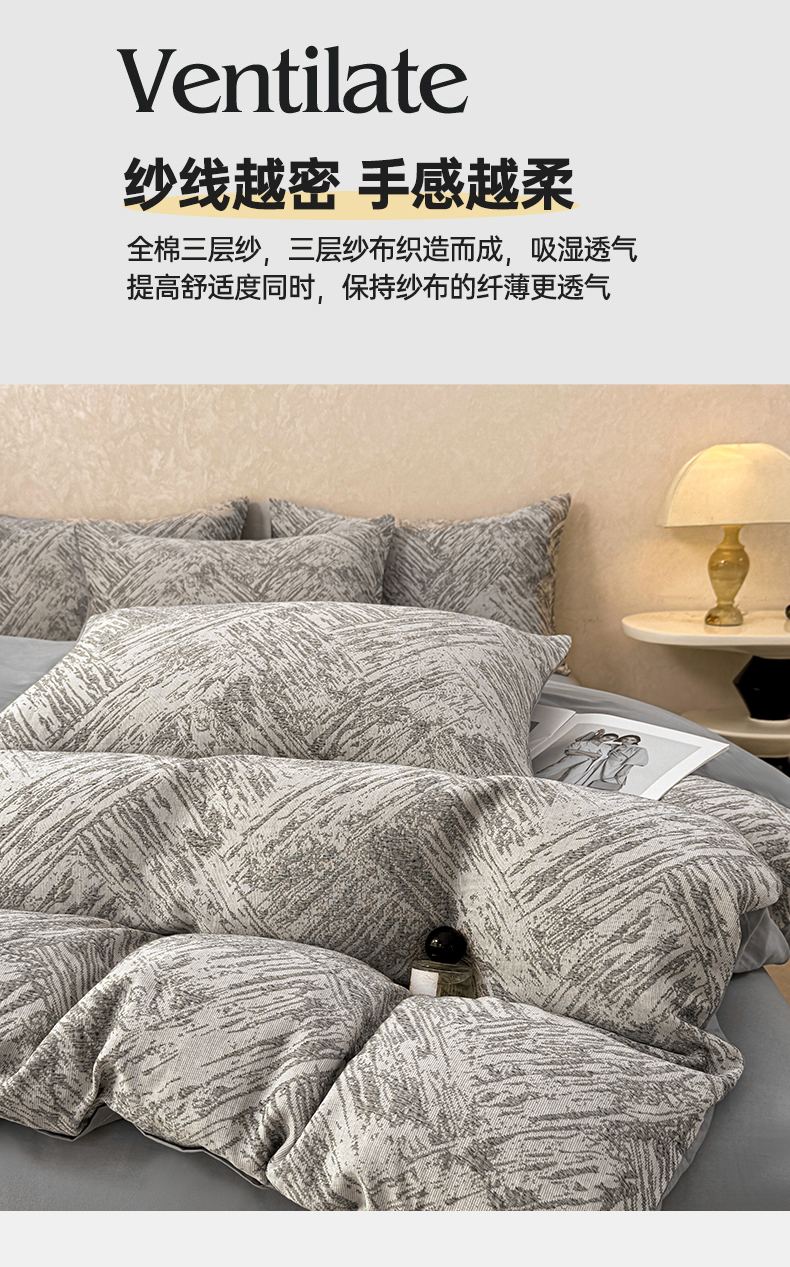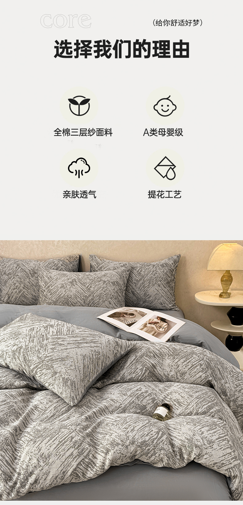 当前位置: 91家纺网 > 商品网购 > 床品套件 > 四件套 > 色织四件套 > 灰鲸2025新款A类全棉三层纱色织提花系列四件套 本色-灰