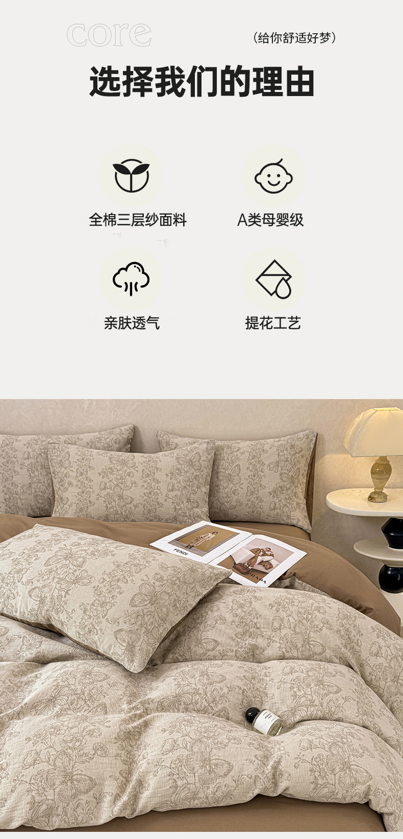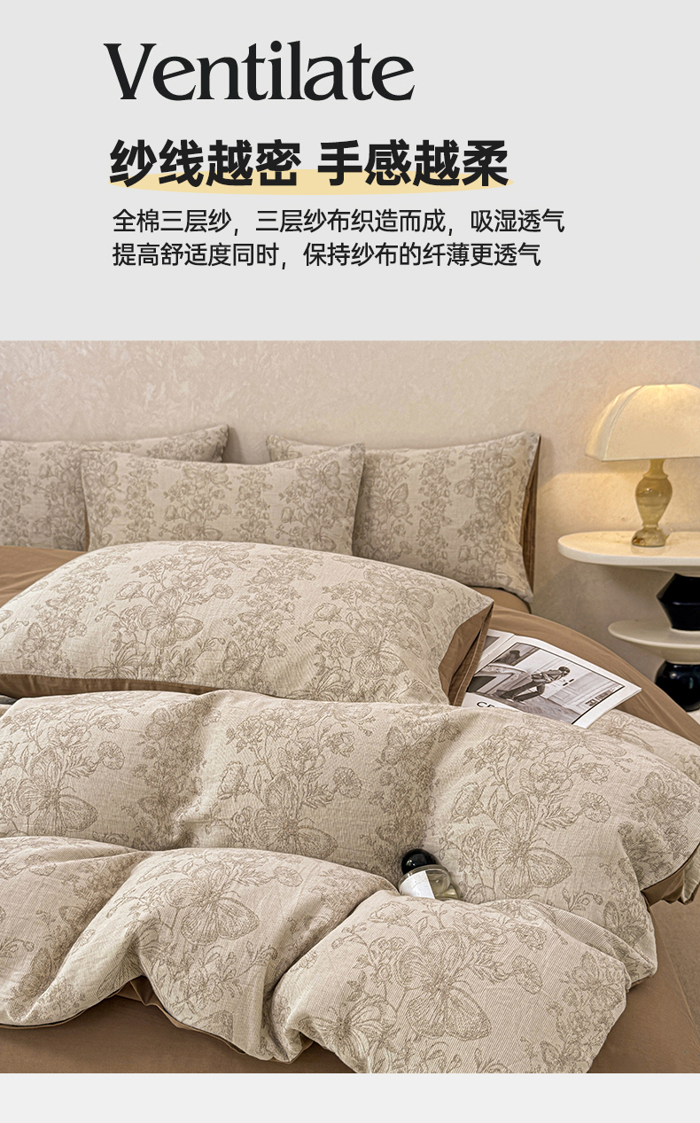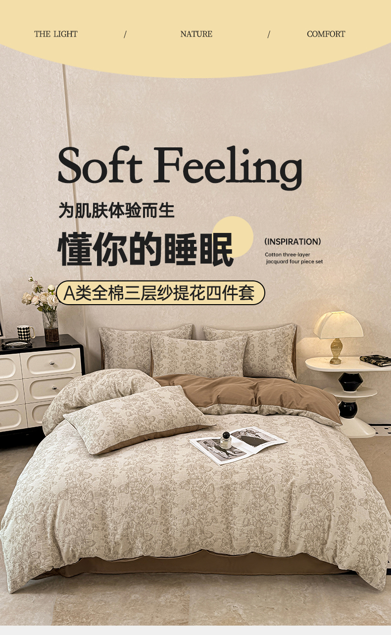 当前位置: 91家纺网 > 商品网购 > 床品套件 > 四件套 > 色织四件套 > 灰鲸2025新款A类全棉三层纱色织提花系列四件套 蝶飞-咖