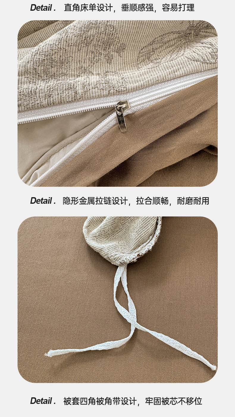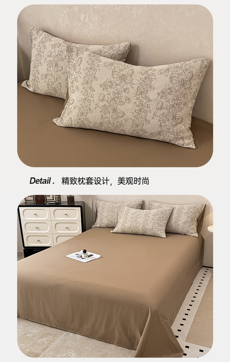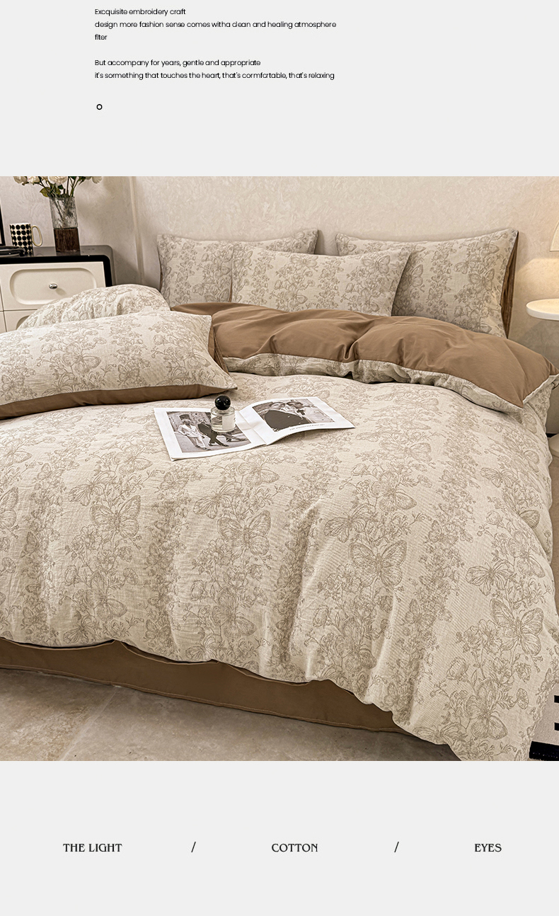 当前位置: 91家纺网 > 商品网购 > 床品套件 > 四件套 > 色织四件套 > 灰鲸2025新款A类全棉三层纱色织提花系列四件套 蝶飞-咖