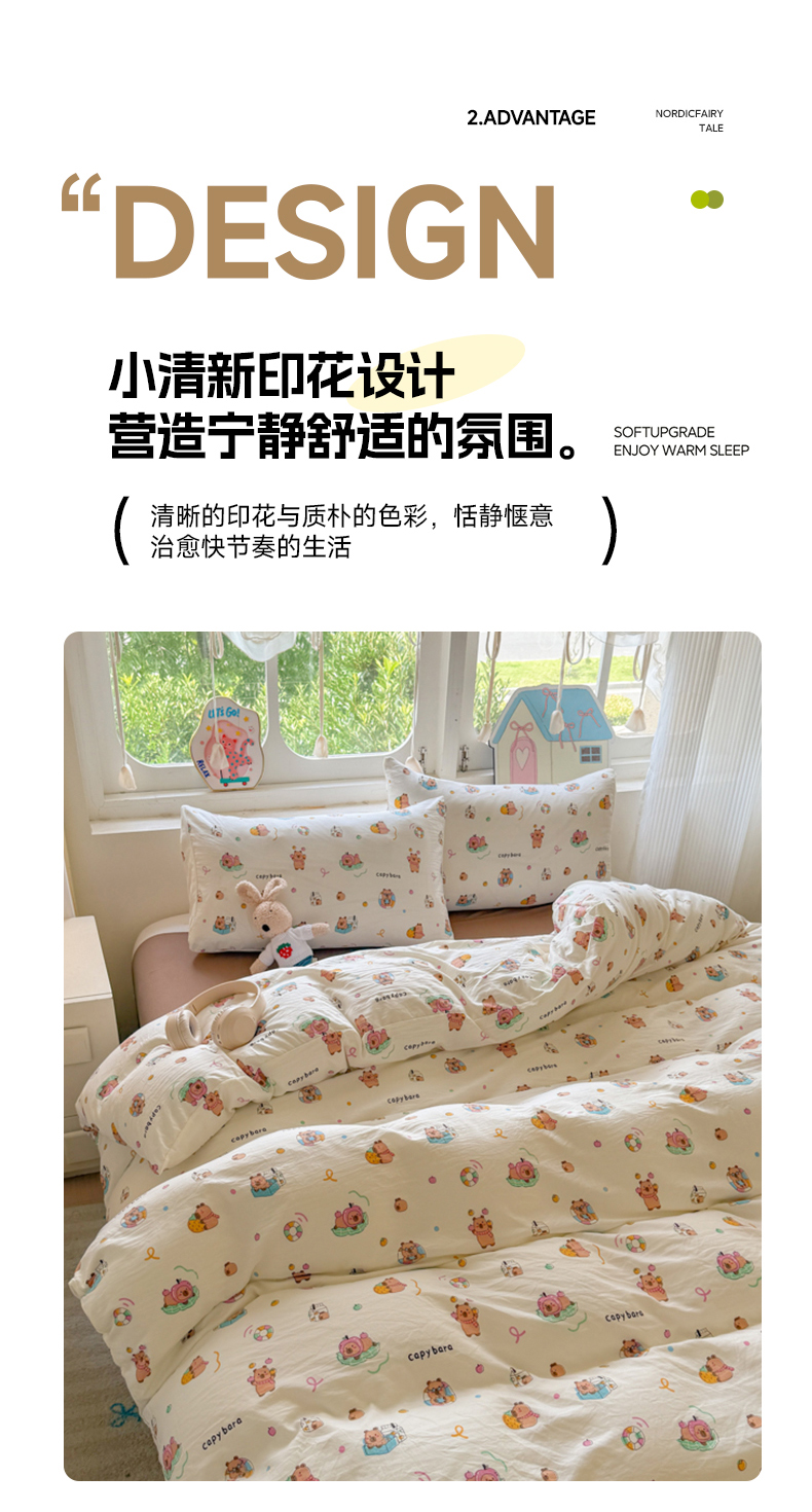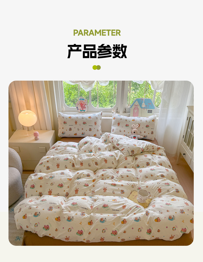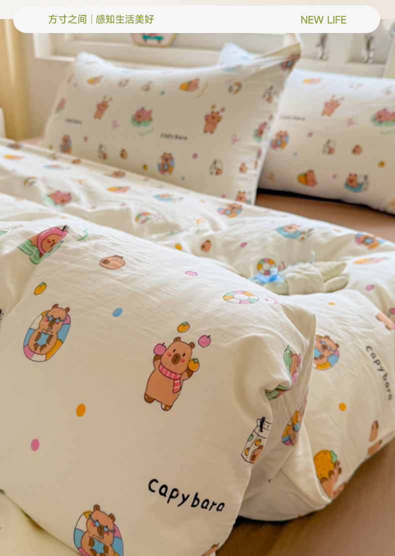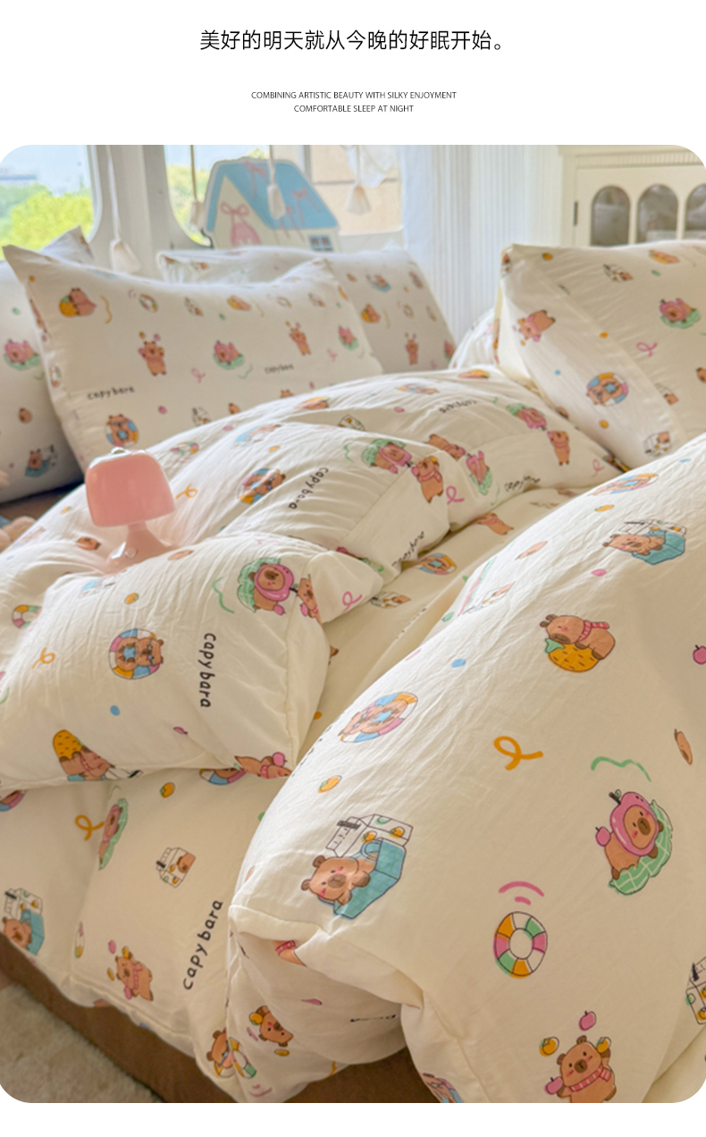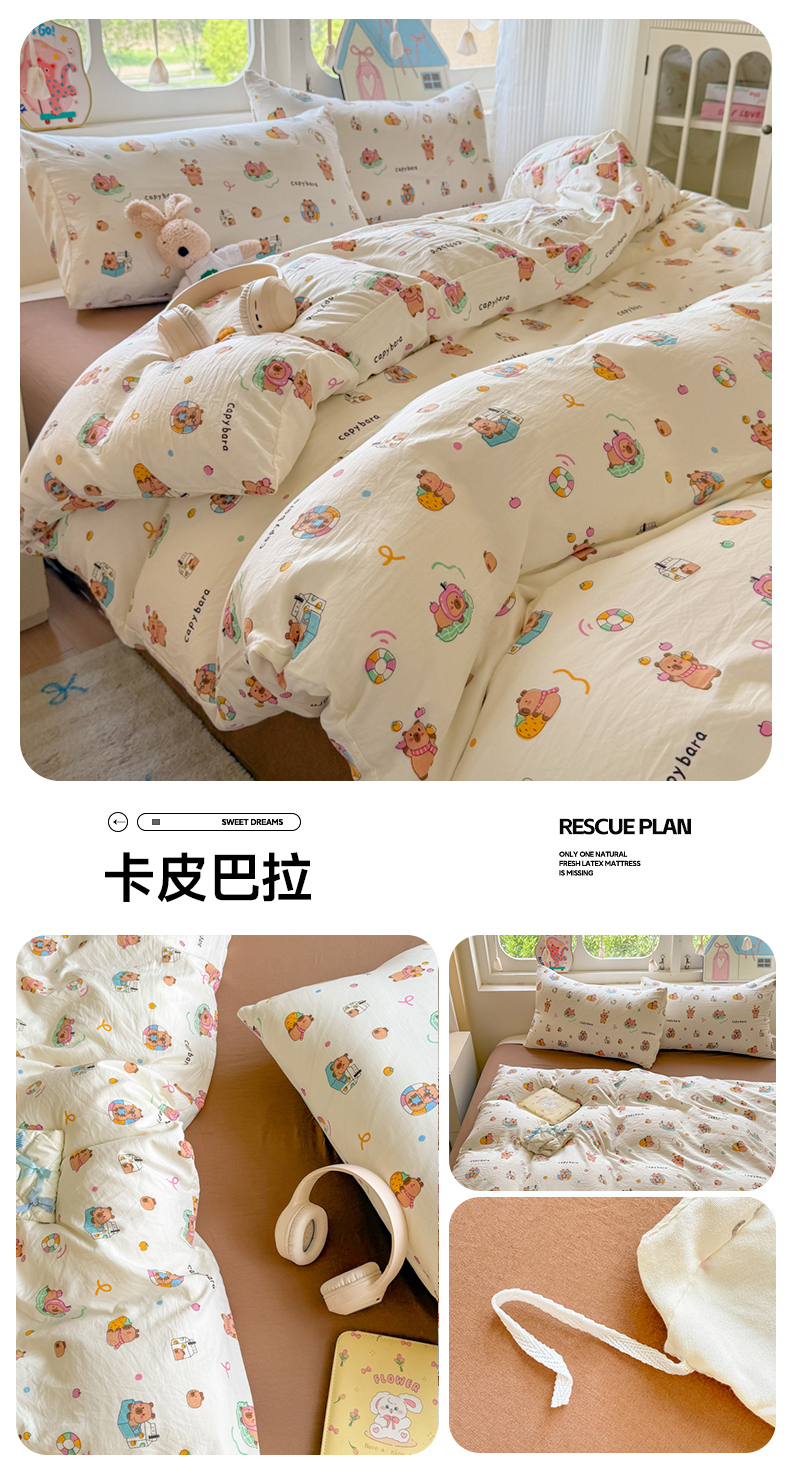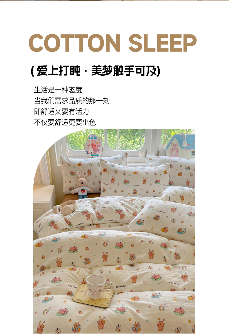 当前位置: 91家纺网 > 商品网购 > 床品套件 > 四件套 > 水洗棉四件套 > 晚爱家纺(原晚安家居) 2025新款超柔水洗棉四件套卡通小清新学生宿舍三件套 卡皮巴拉