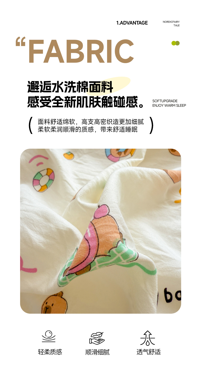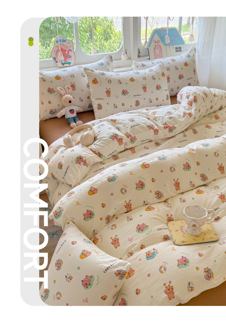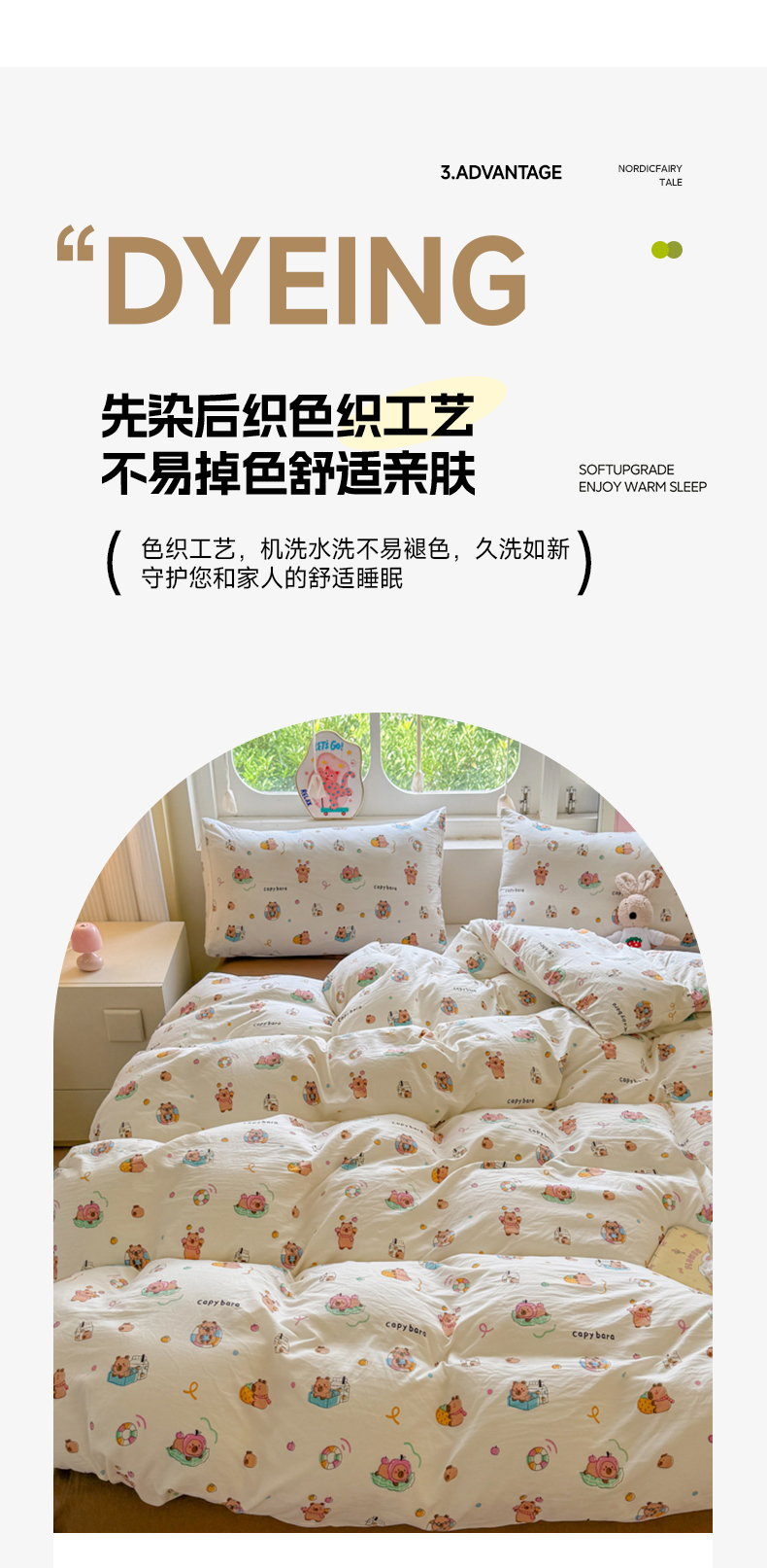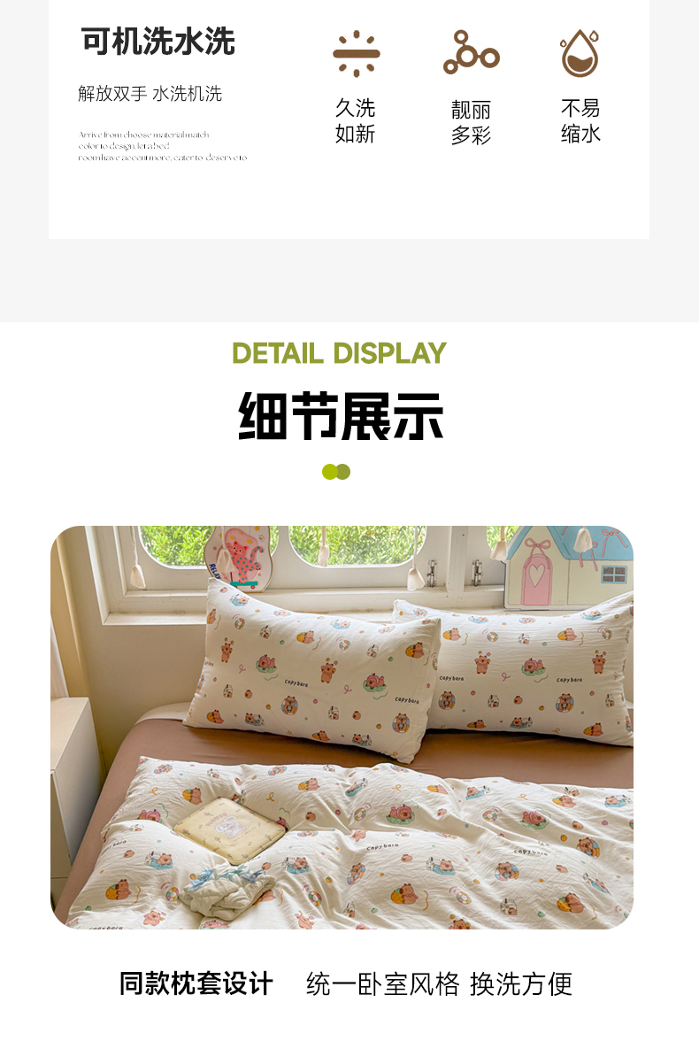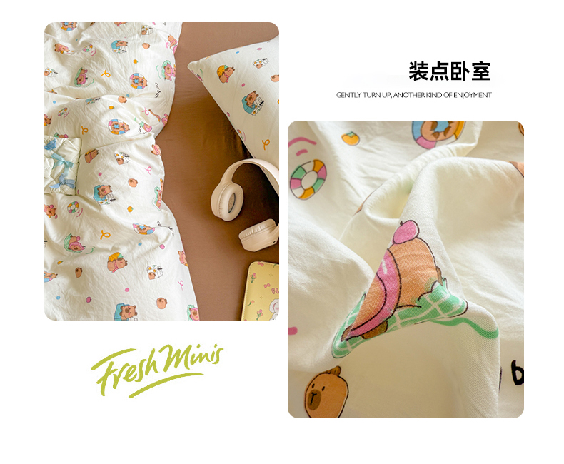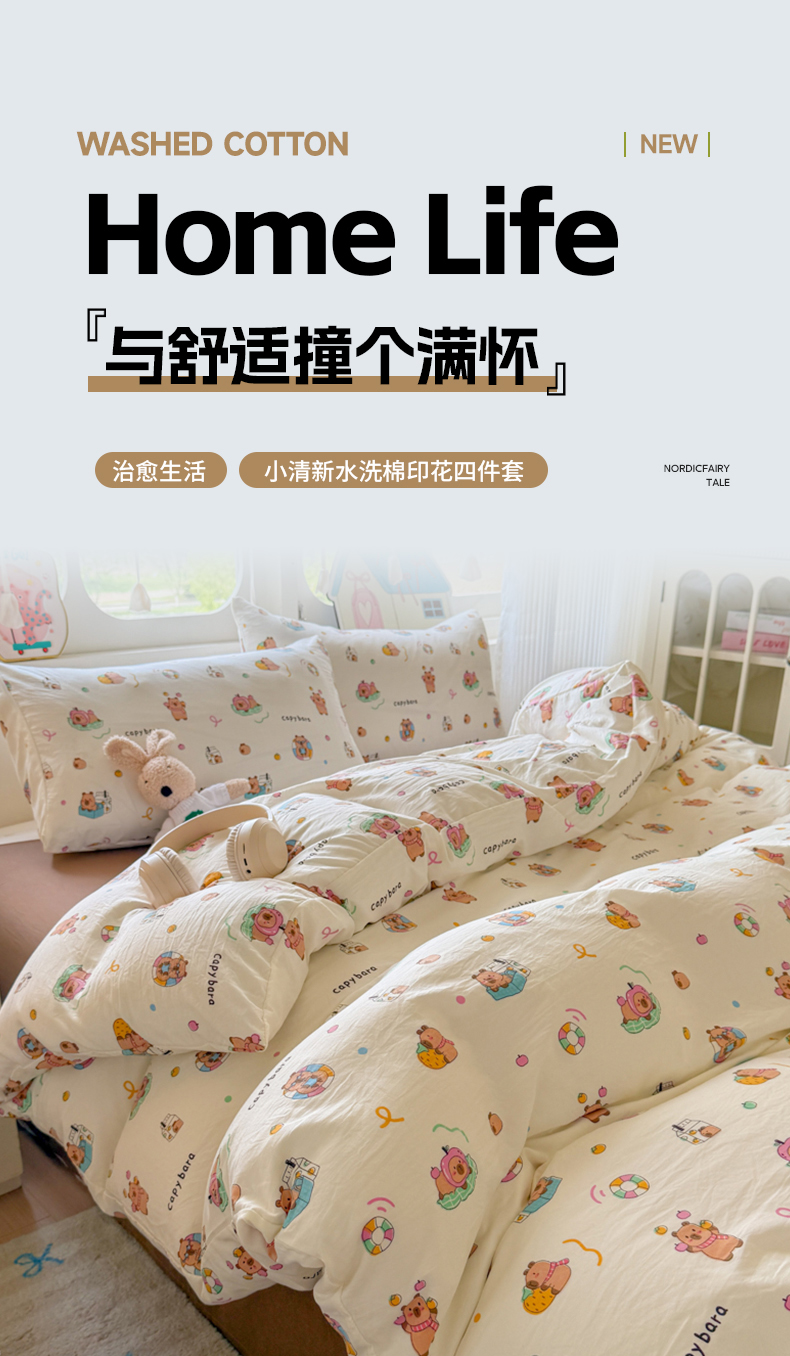 当前位置: 91家纺网 > 商品网购 > 床品套件 > 四件套 > 水洗棉四件套 > 晚爱家纺(原晚安家居) 2025新款超柔水洗棉四件套卡通小清新学生宿舍三件套 卡皮巴拉
