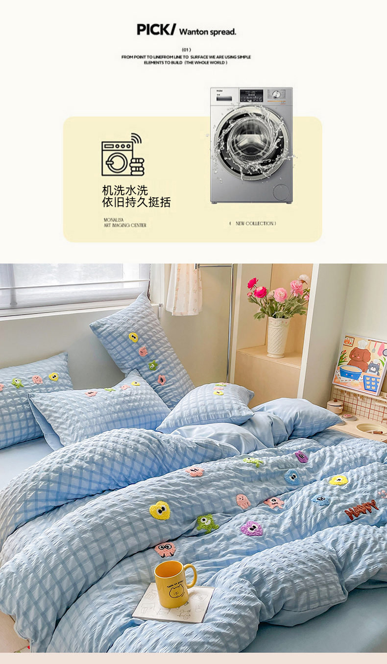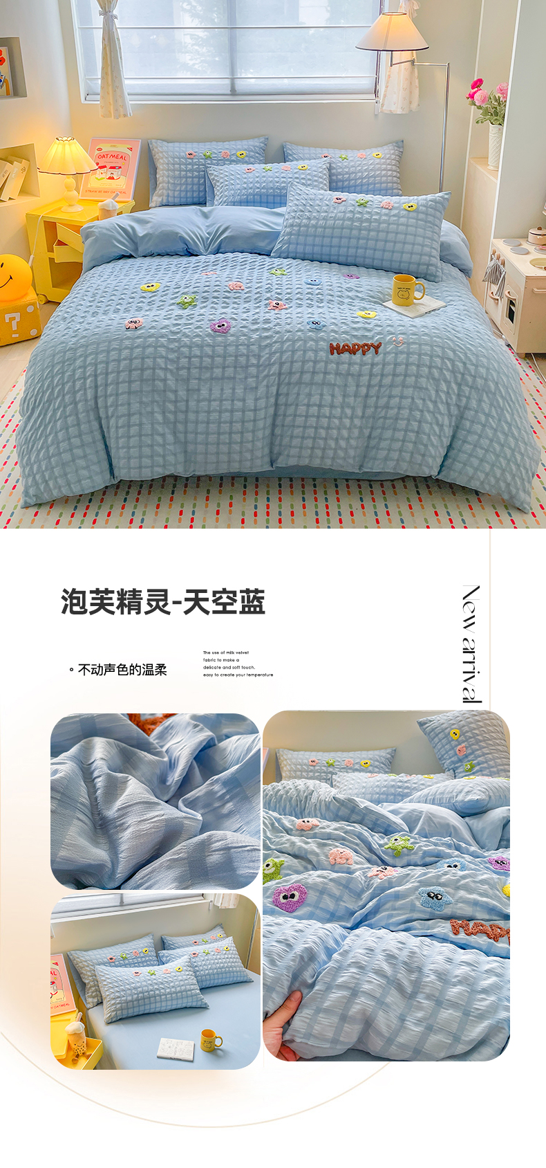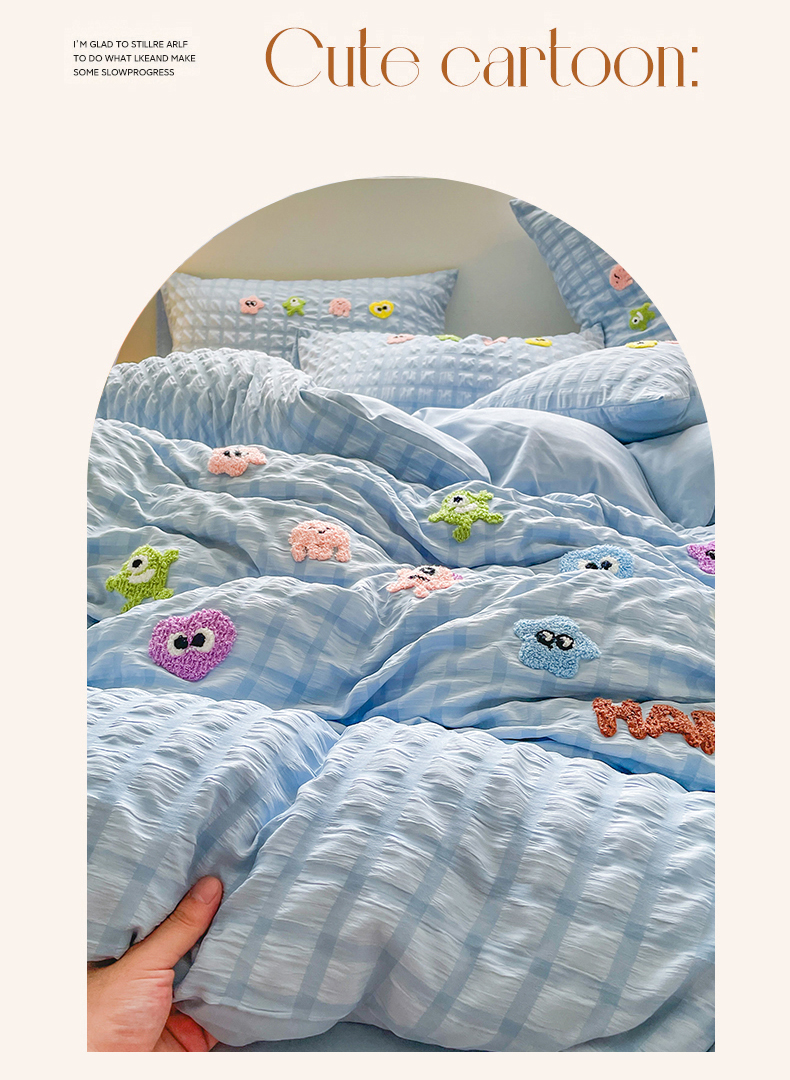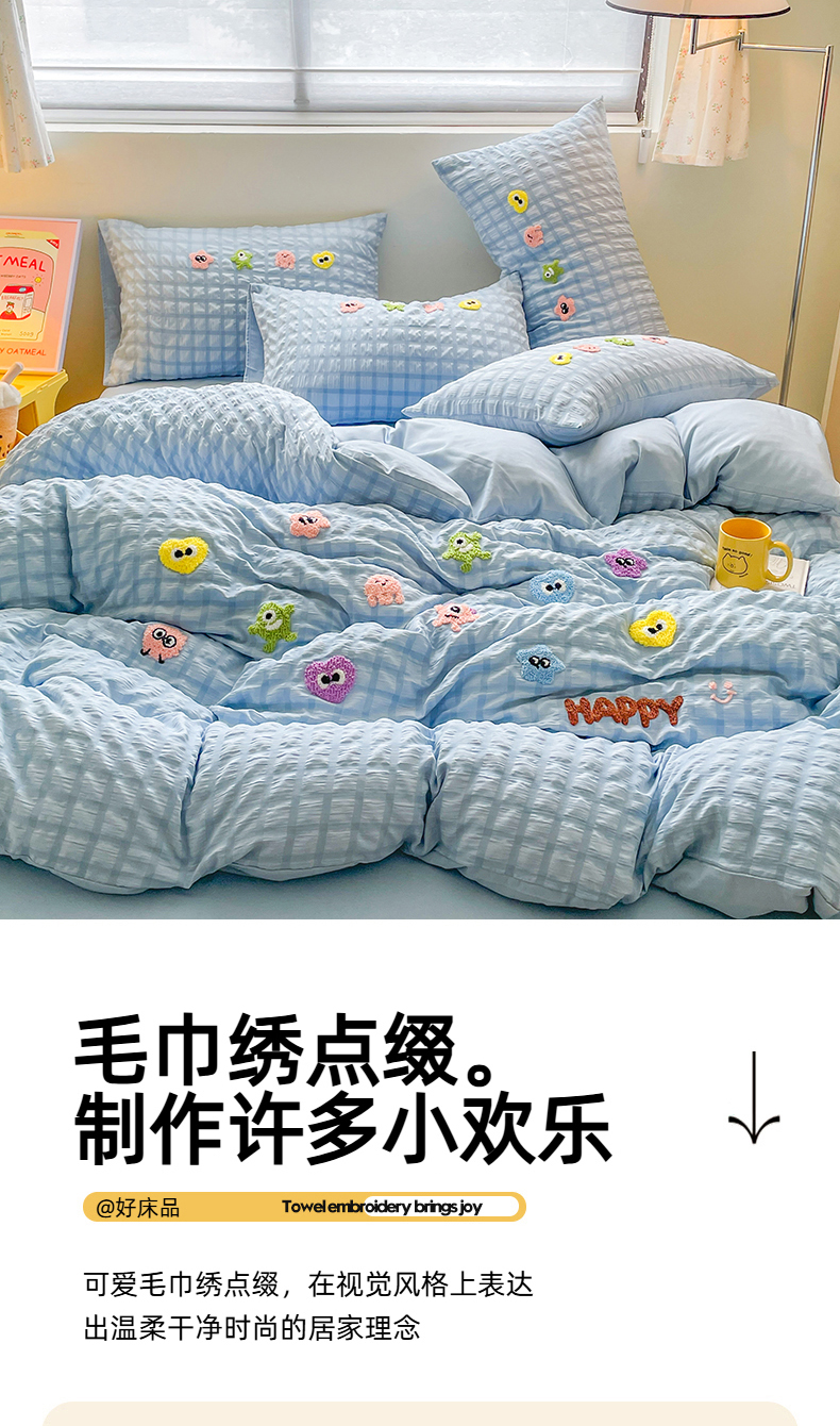 商品名称:千希家纺 2025新款高克重超柔泡泡纱毛巾绣泡芙精灵系列四件套 泡芙精灵-天空蓝
