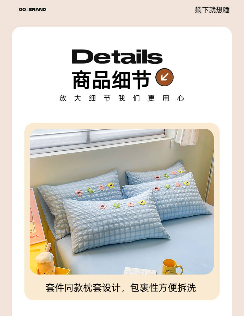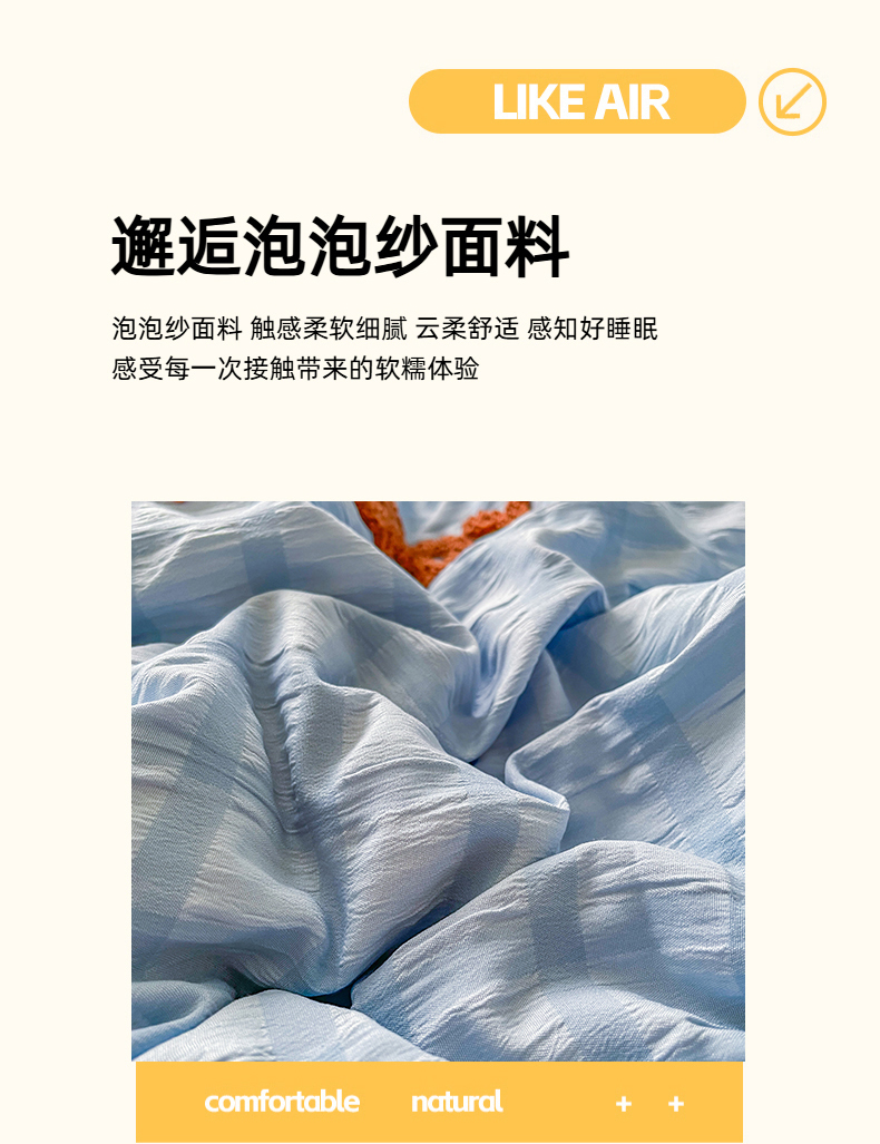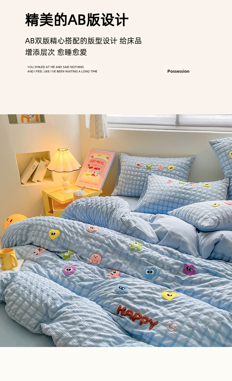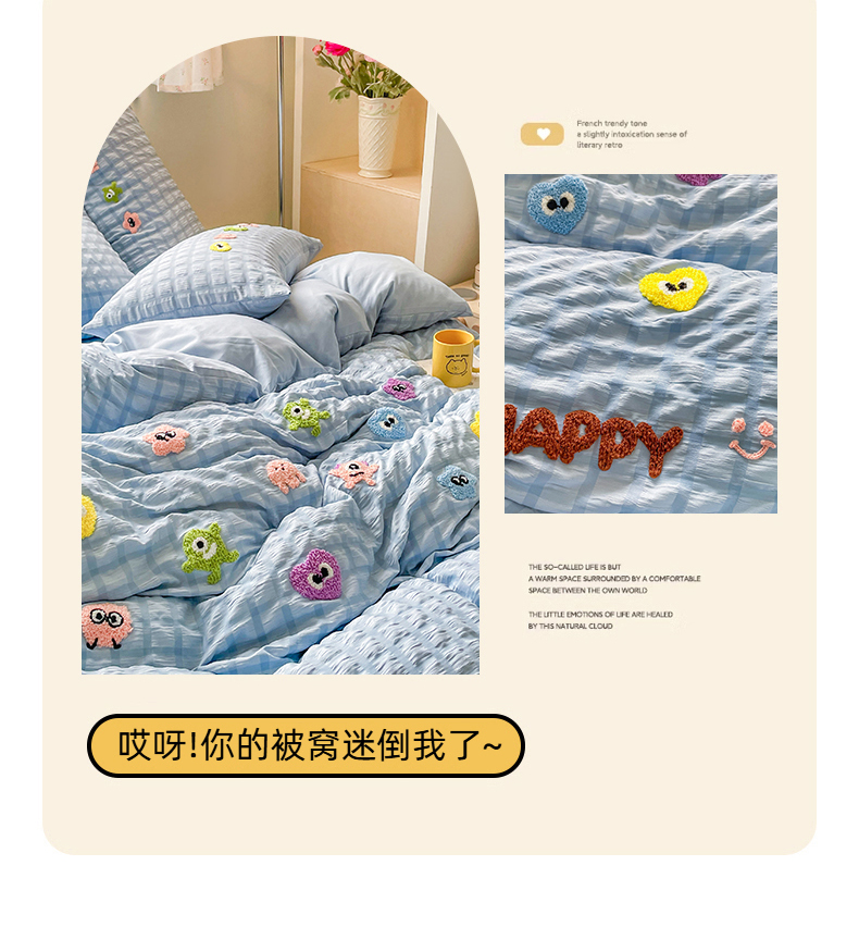 商品名称:千希家纺 2025新款高克重超柔泡泡纱毛巾绣泡芙精灵系列四件套 泡芙精灵-天空蓝
