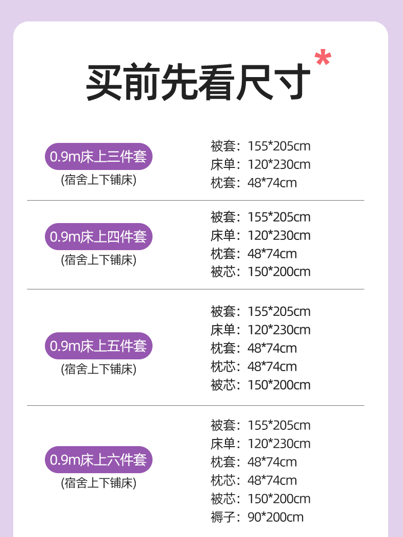 0.9m床六件套【床单三件套+秋冬被约5斤+枕芯+垫芯】 | ¥188.00 |