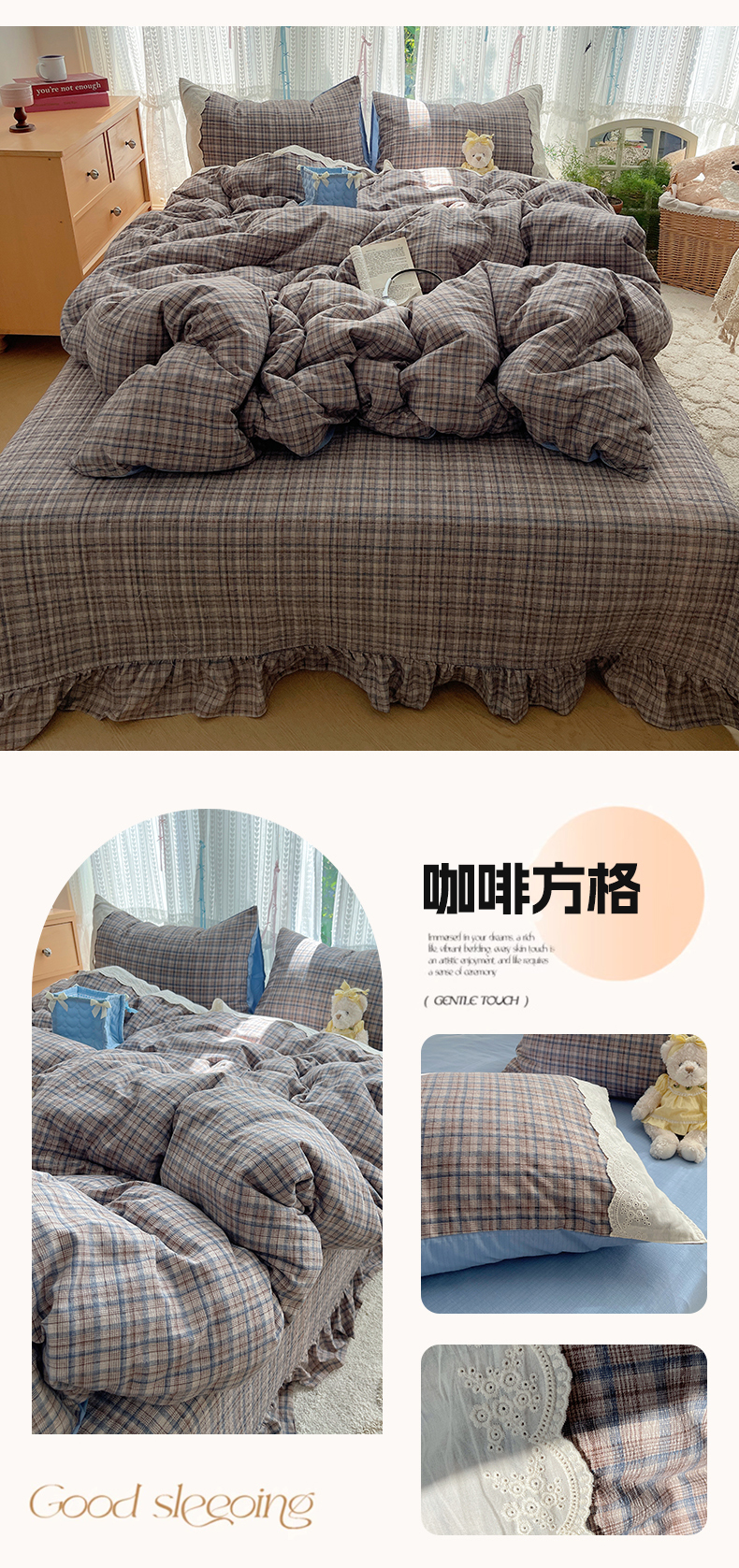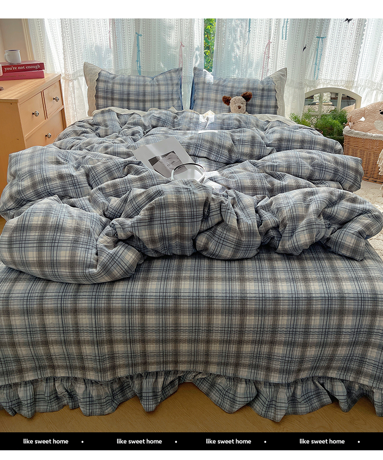 当前位置: 91家纺网 > 商品网购 > 床品套件 > 四件套 > 其它四件套 > 轻奢坊 2025新款125g高克重皱皱撒欢复古格子蕾丝花边四件套 复古酒红