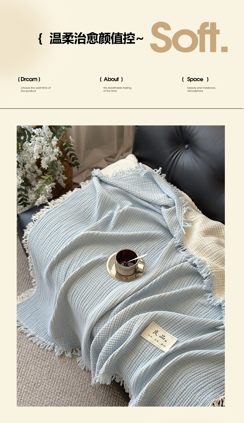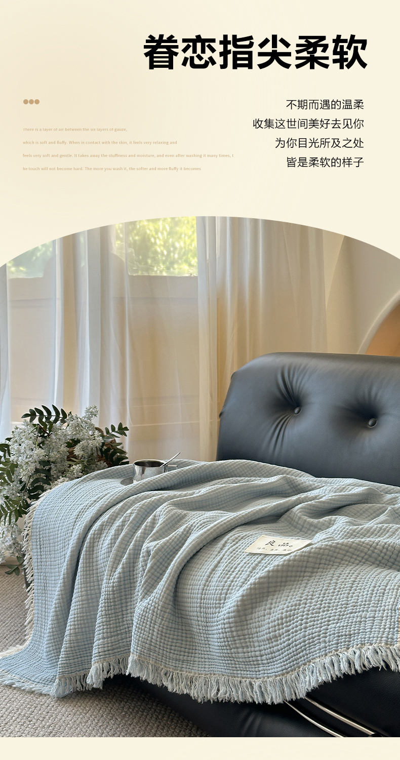 吉象家纺 2025新款全棉纯棉四层纱流苏毯盖毯毯子 优雅-浅蓝