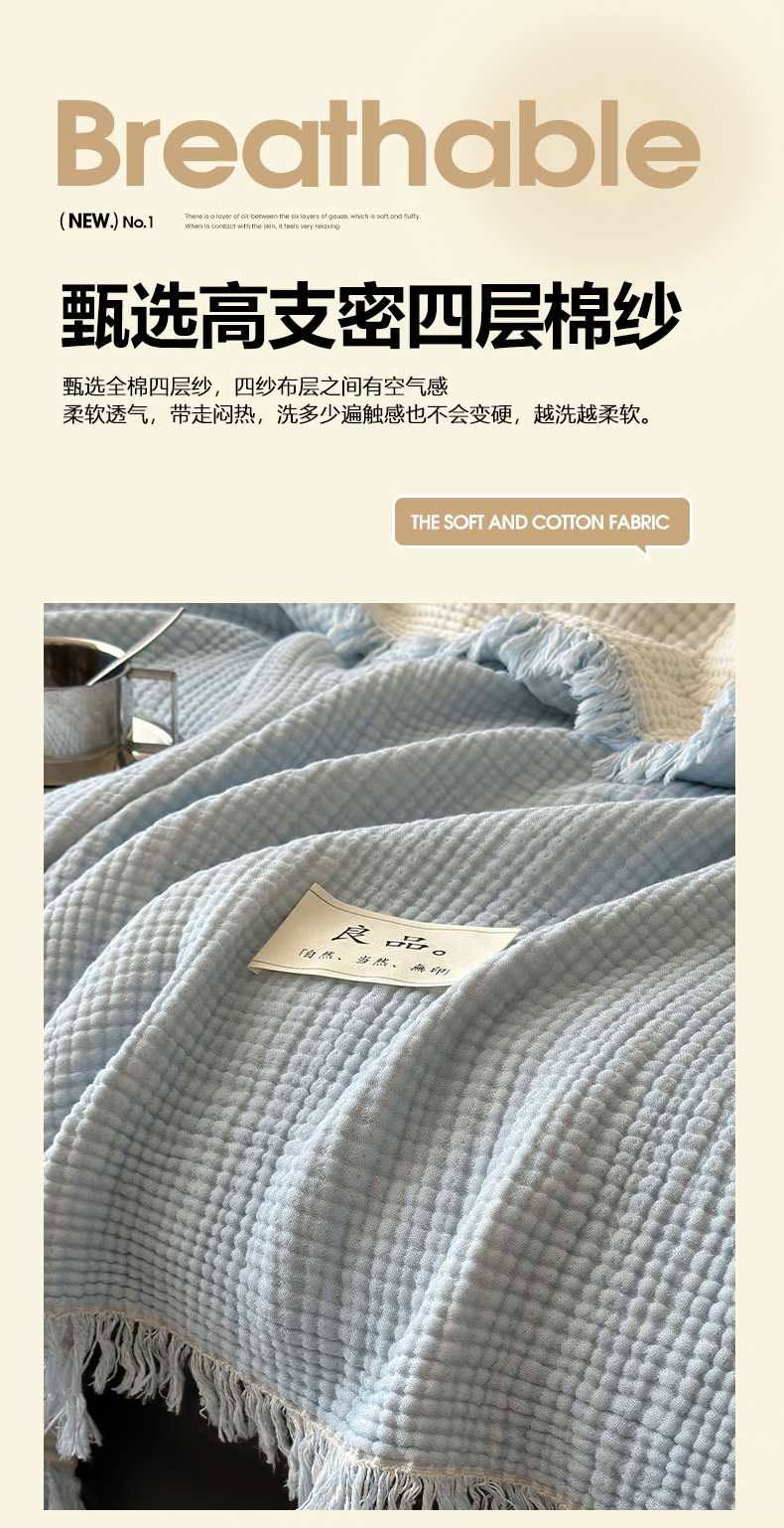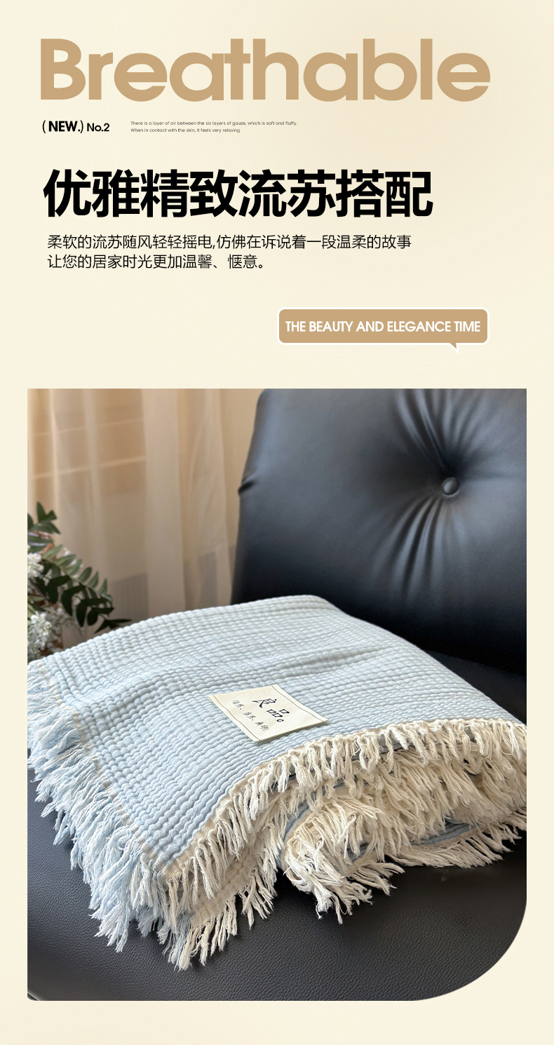 商品名称:吉象家纺 2025新款全棉纯棉四层纱流苏毯盖毯毯子 优雅-浅蓝