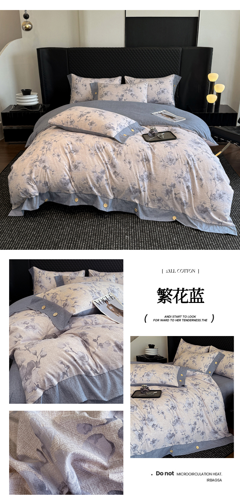 当前位置: 91家纺网 > 商品网购 > 床品套件 > 四件套 > 其它四件套 > 晚爱家纺(原晚安家居) 2025新款A类原麻四件套纽扣款加厚双层纱仿亚麻套件四件套 繁花蓝