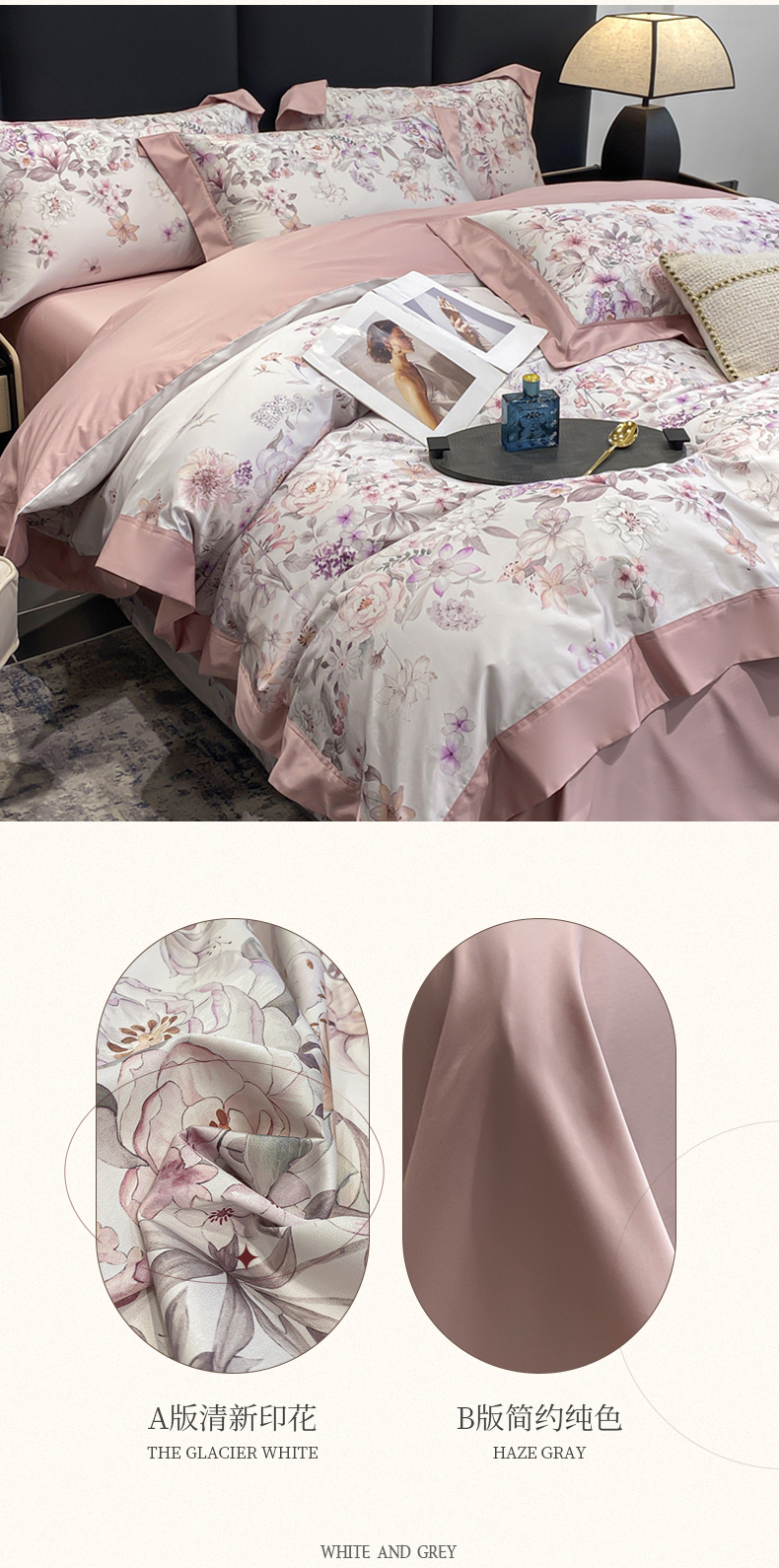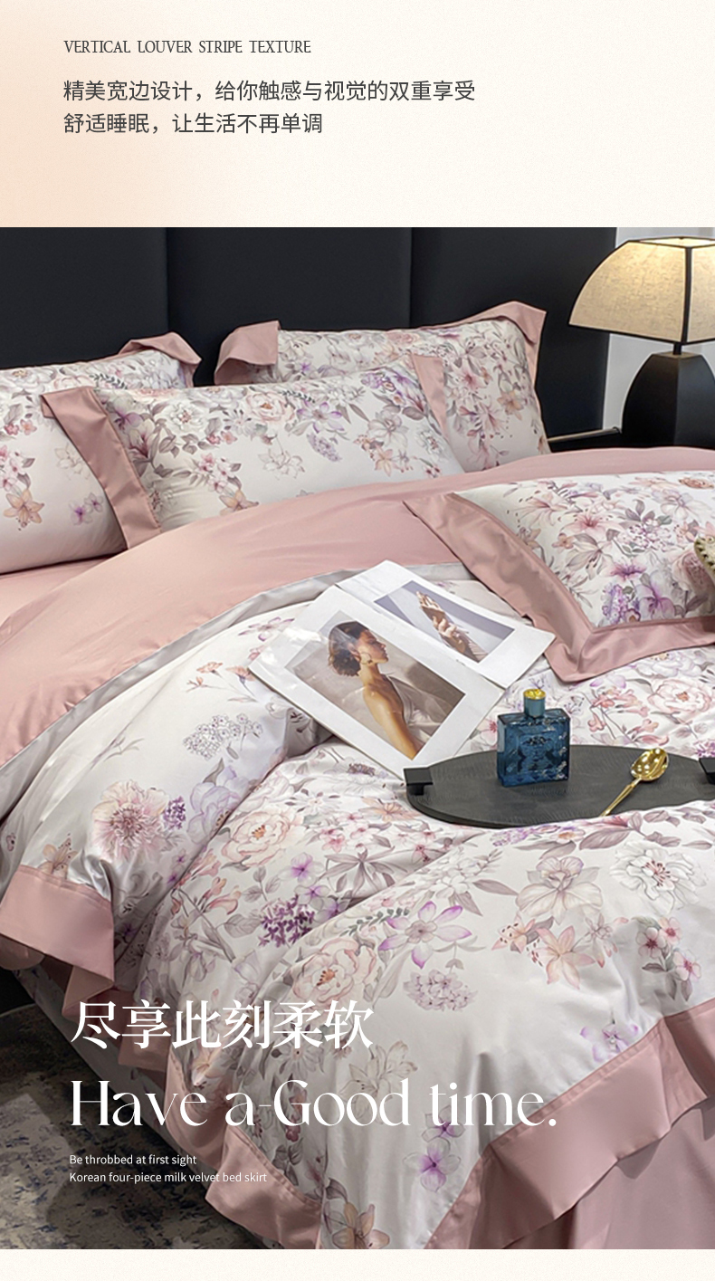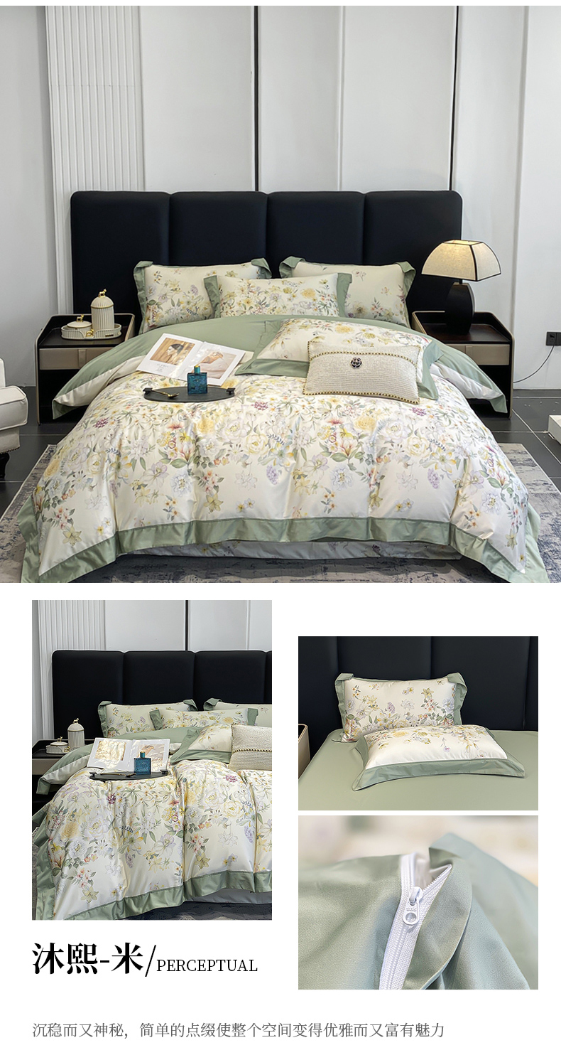 (总)娇逸家居 2025新款高克重A类数码印花牛奶绒双拼边款四件套,采薇灰,扶桑,浅影,秋灵粉,秋灵黄,秋灵绿,舜华粉,采薇米,舜华绿,仙客,栩蝶,璎珞,玉树,芸芙