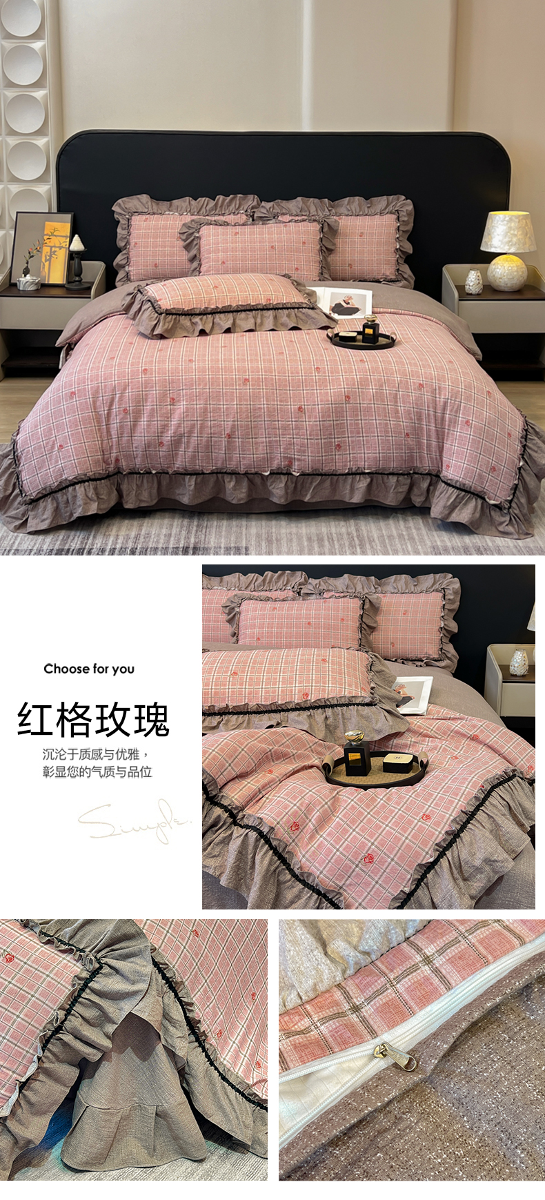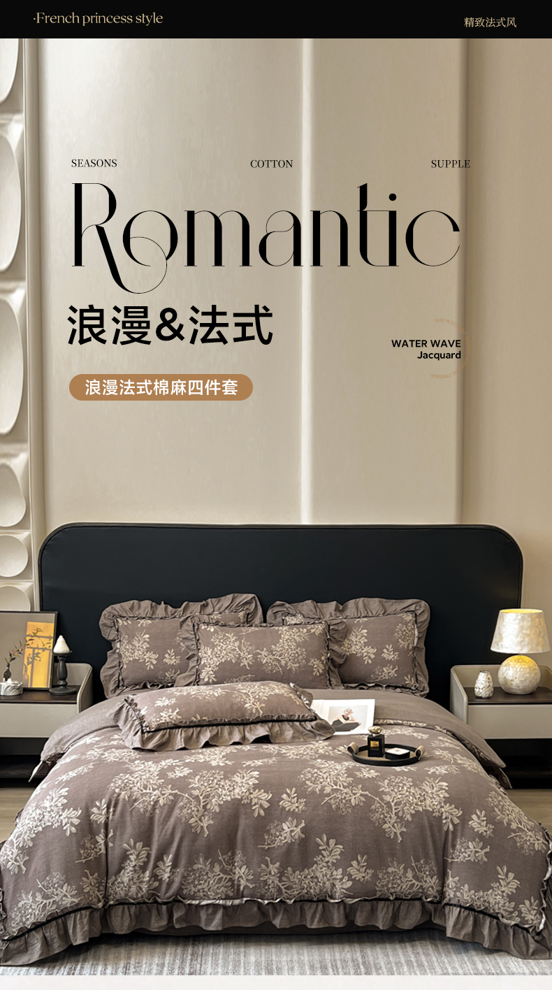 玉海棠家纺 2025新款法式花边棉麻四件套 枝槿
