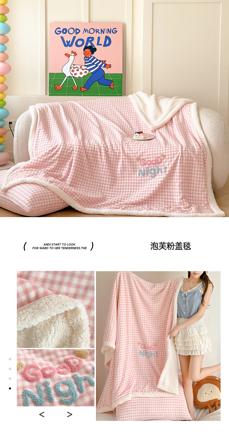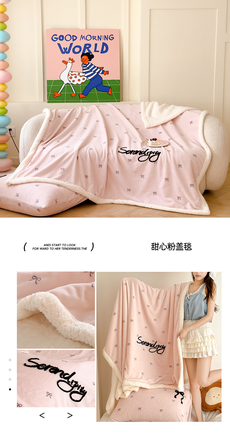 商品名称:布柔 2025新款高克重加厚印花毛巾刺绣牛奶绒羊羔绒盖毯双层毛毯午休毯卡通多功能沙发毯子 泡芙粉盖毯