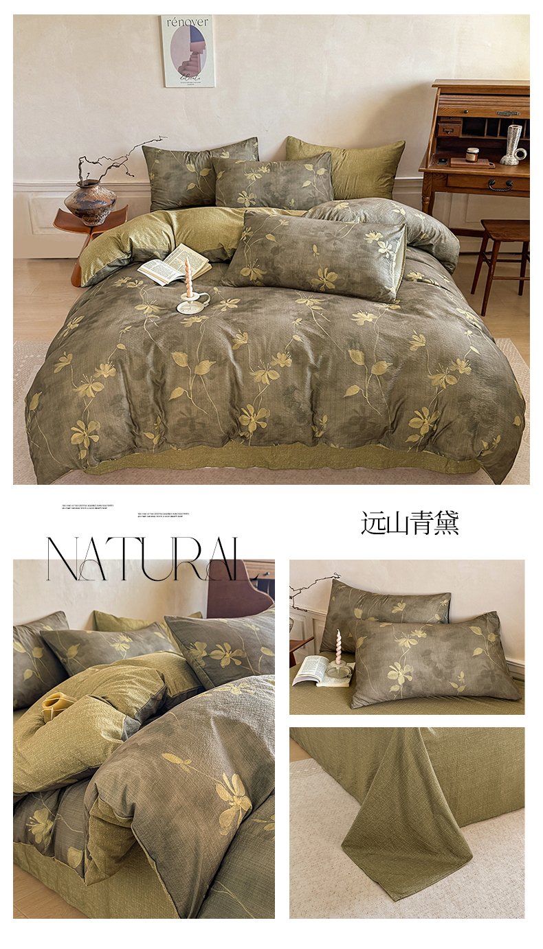 商品名称:壹号库家纺 2025年新品A类仿麻中古风皱皱纱双层纱四件套 远山青黛
