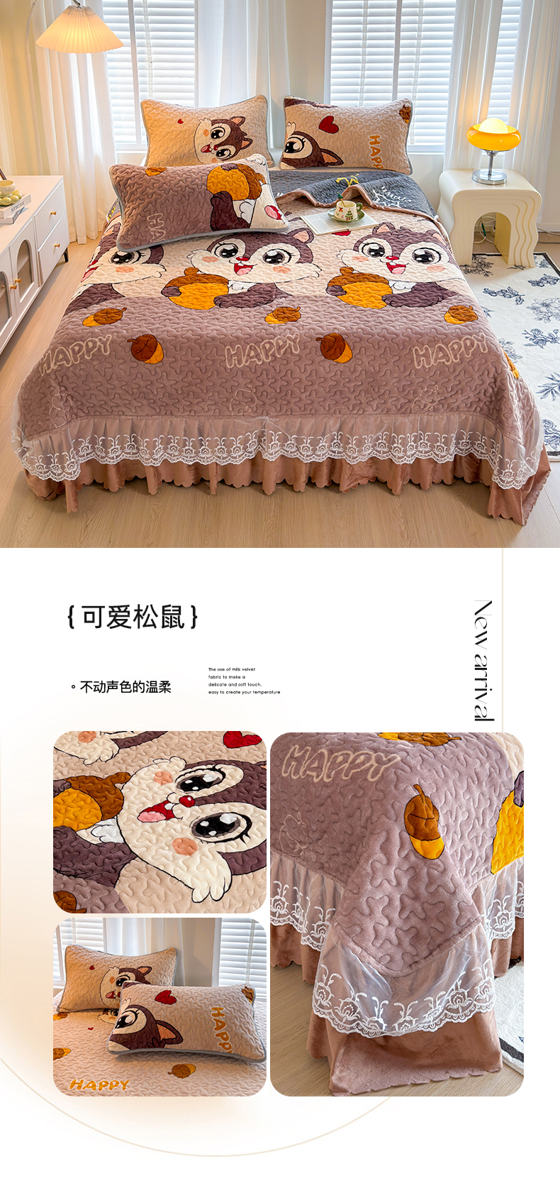 梓依家纺 2025新款牛奶绒单床裙款蕾丝床盖三件套四件套 可爱松鼠