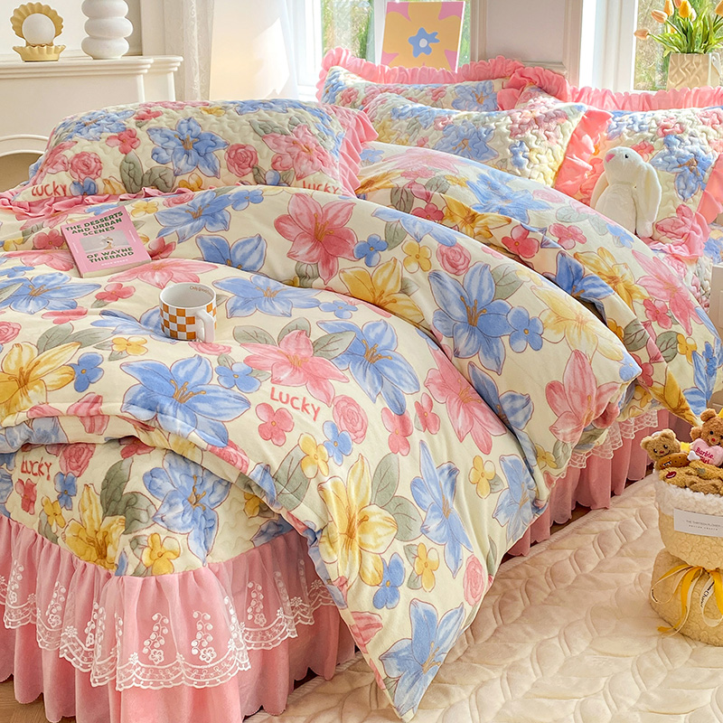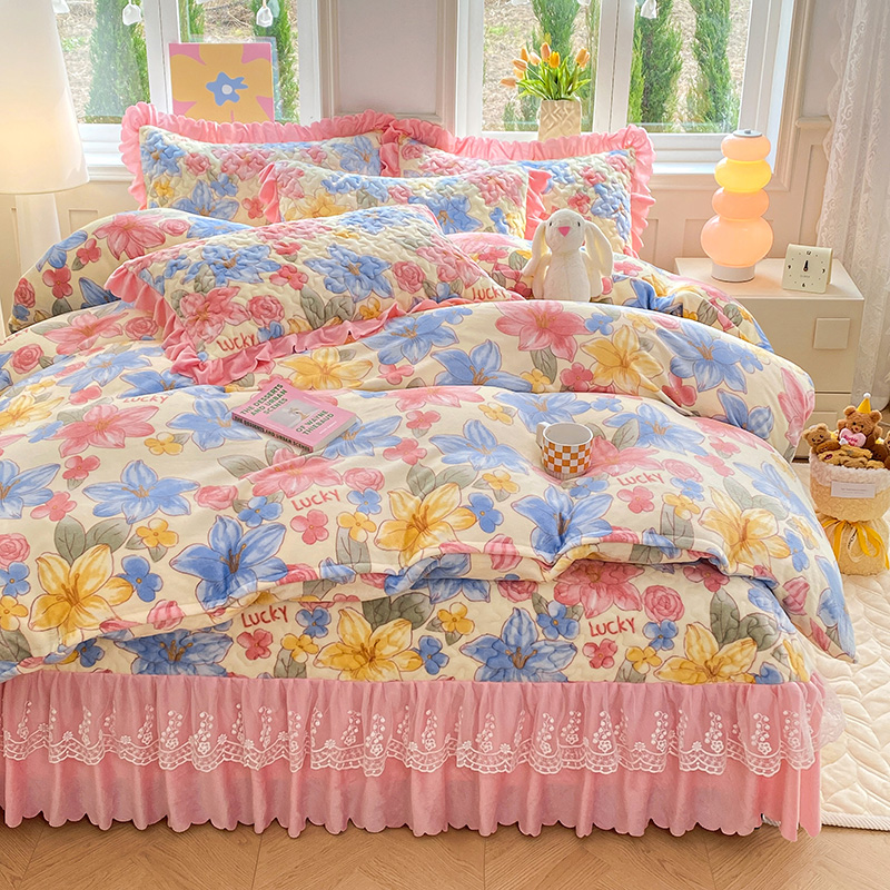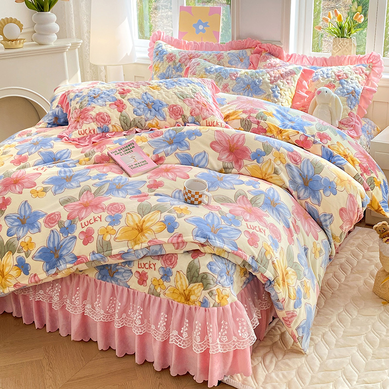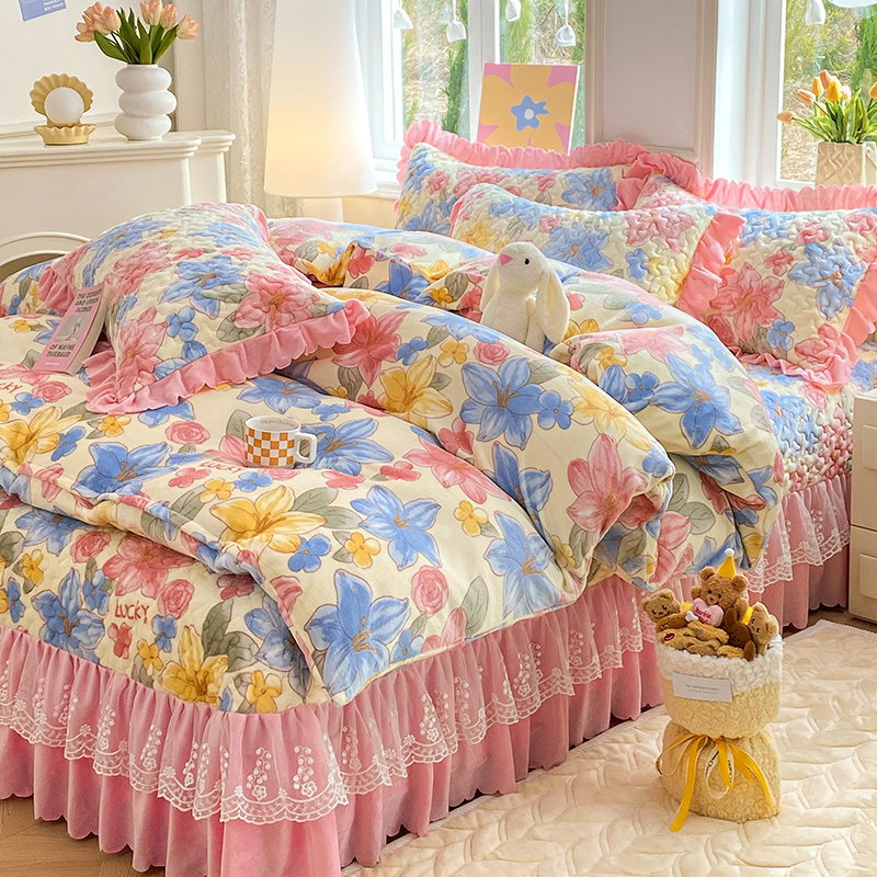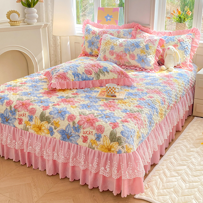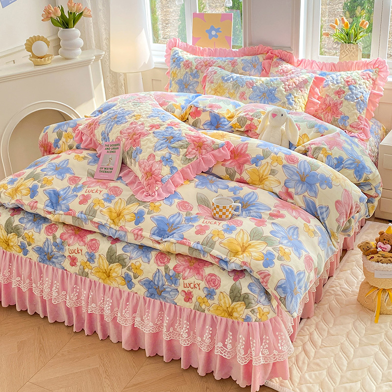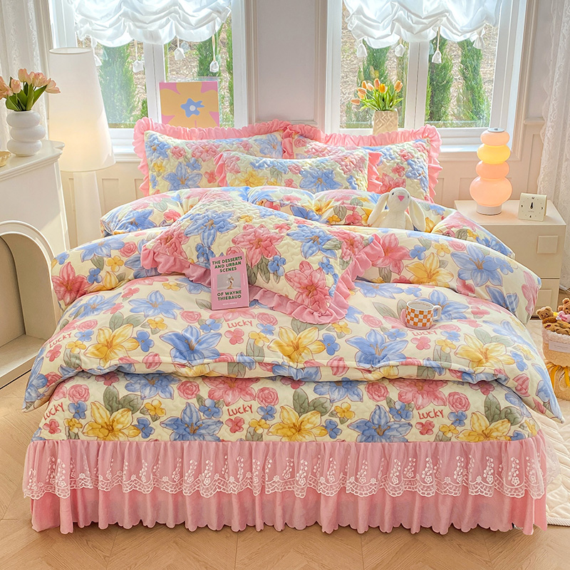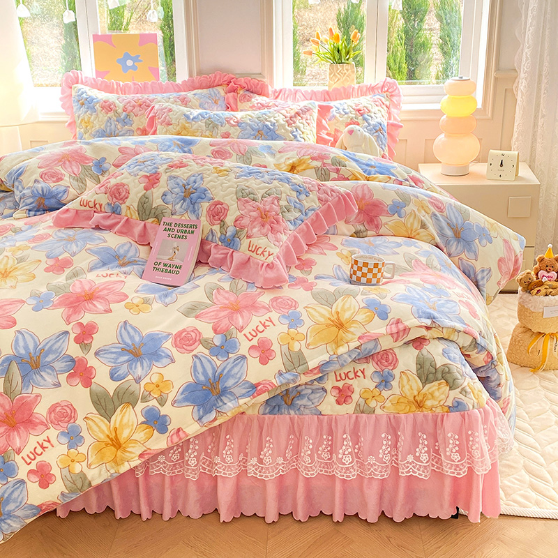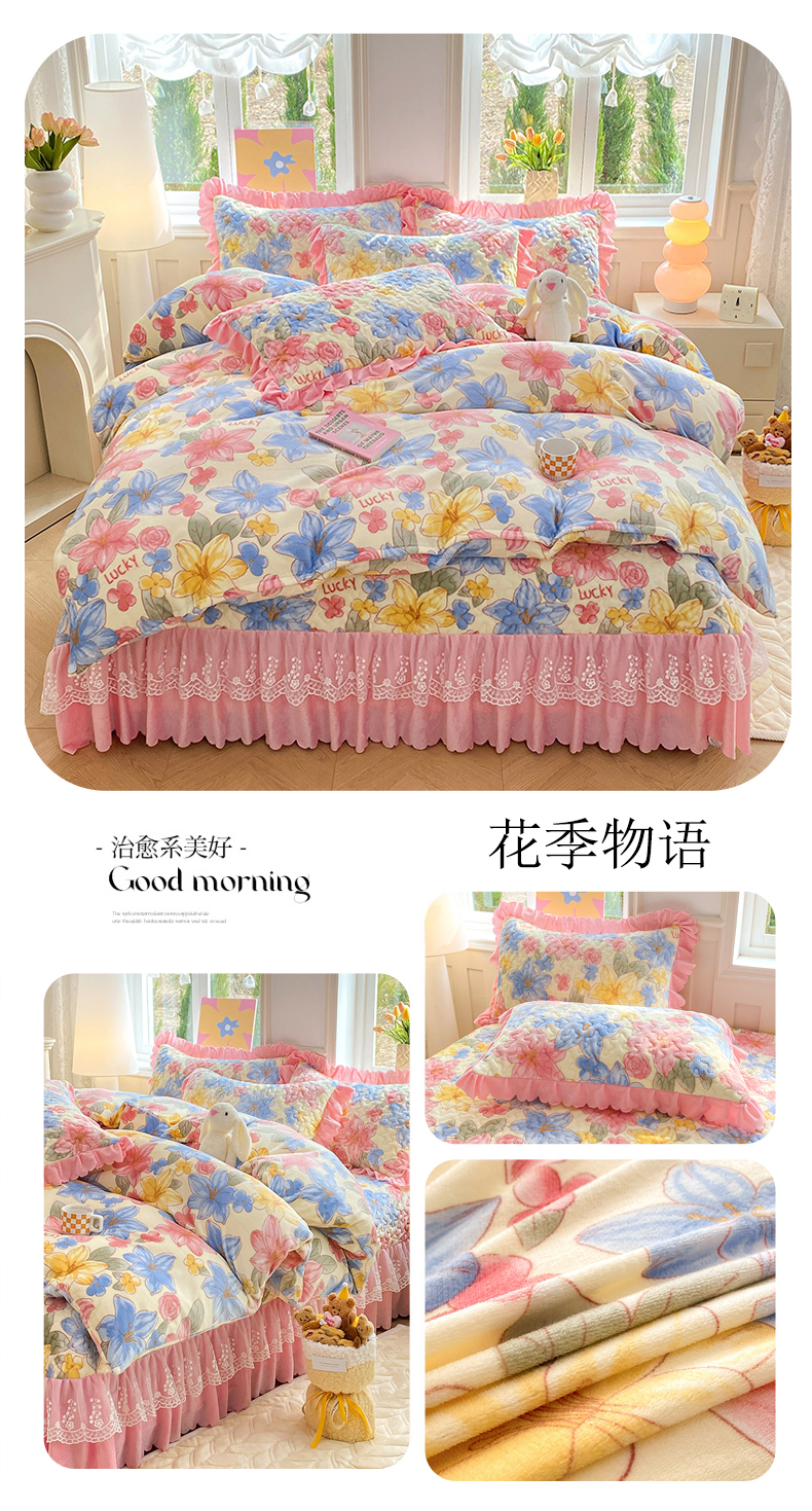 当前位置: 91家纺网 > 商品网购 > 床品套件 > 四件套 > 牛奶绒四件套 > 提花大世界 2025新款爆款高克重牛奶绒印花夹棉蕾丝花边床盖床三件四件套 花季物语