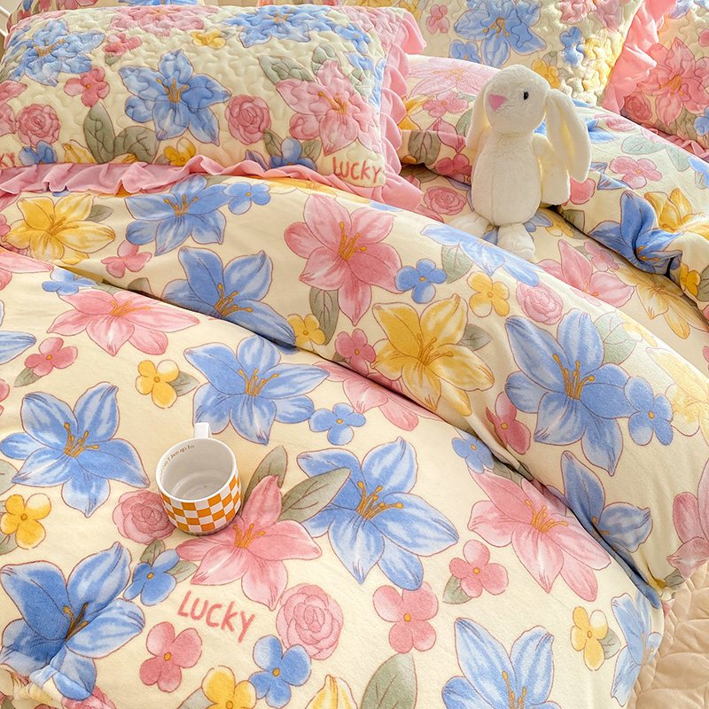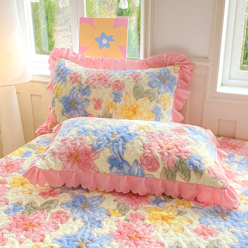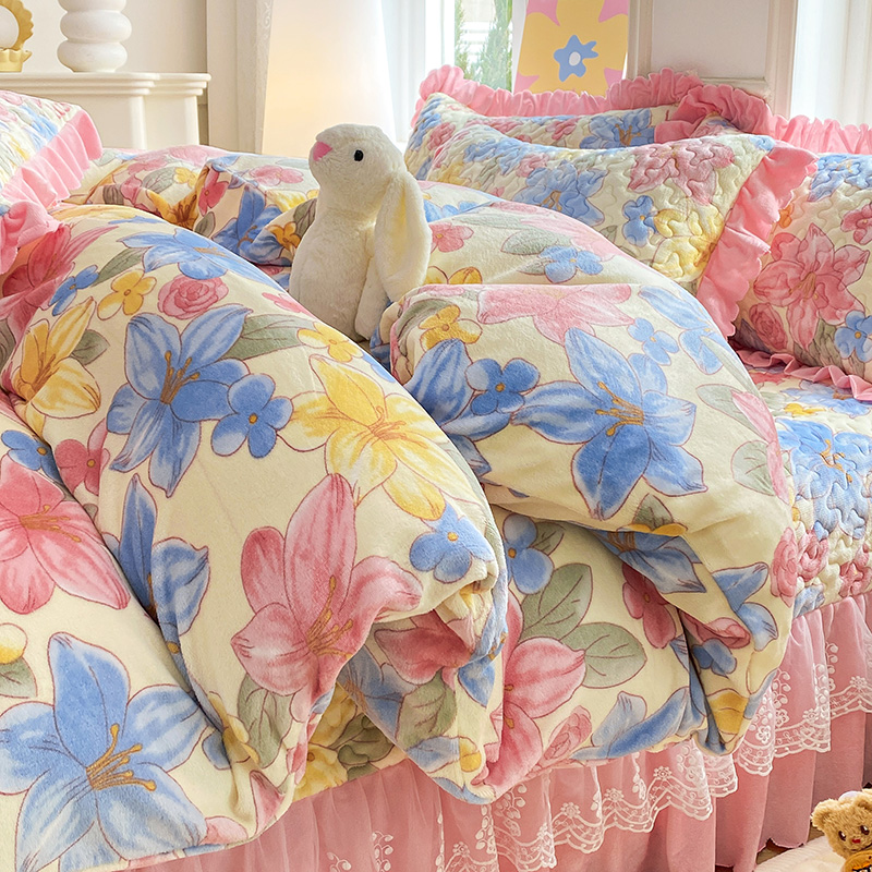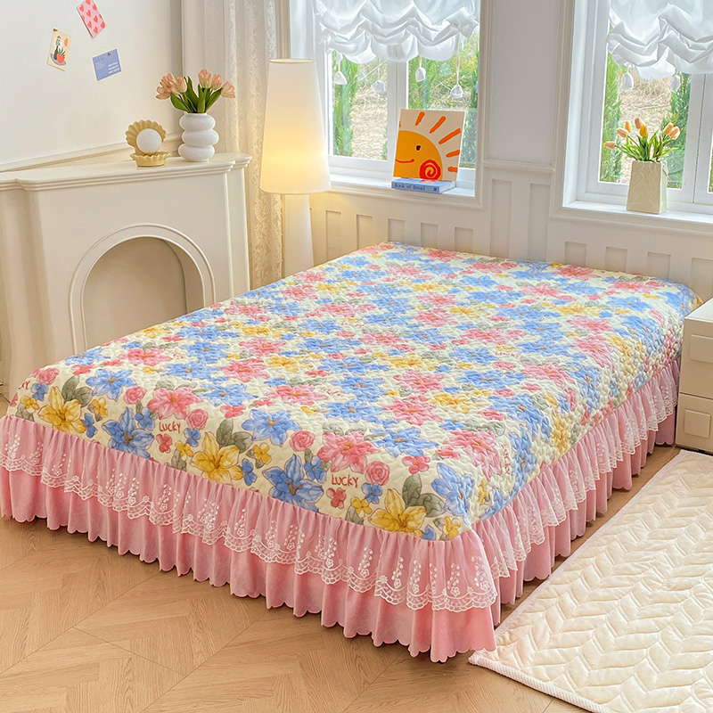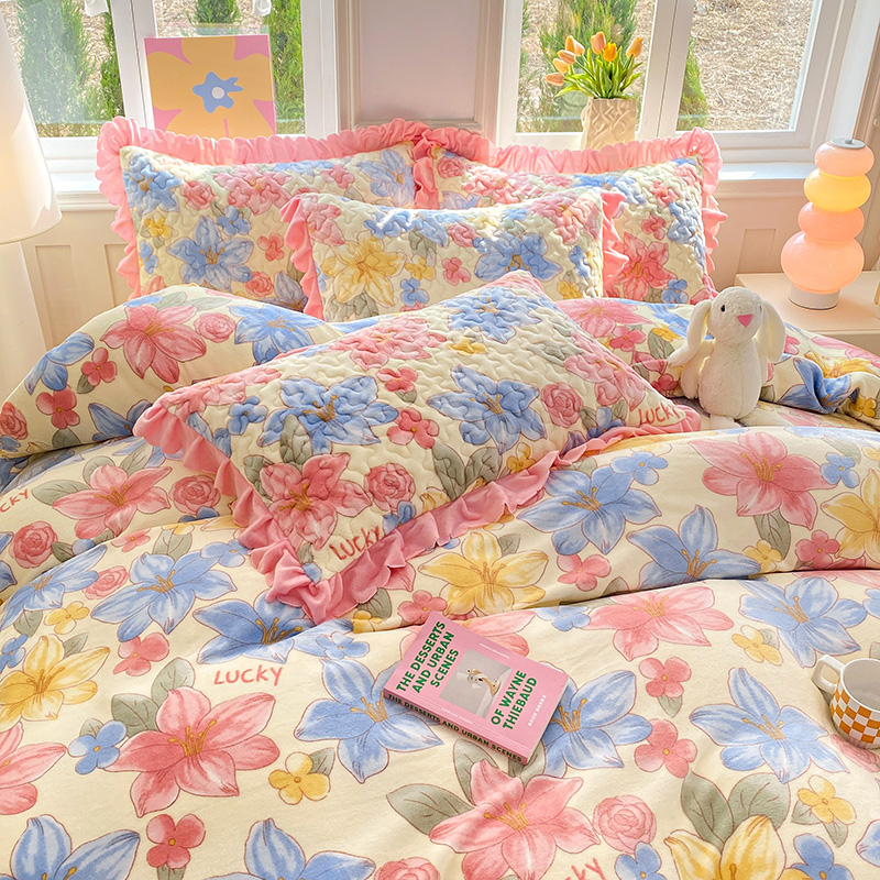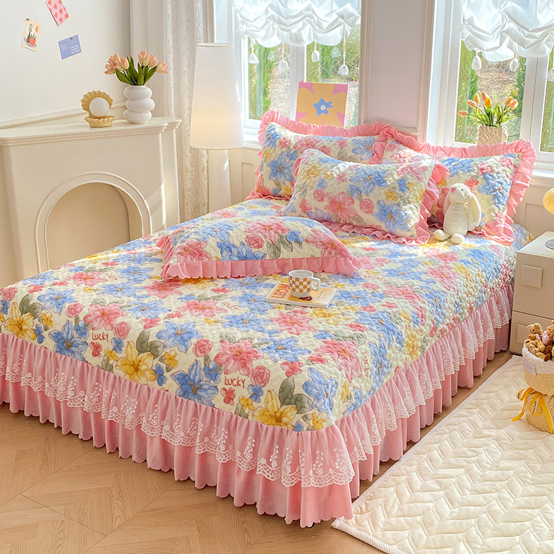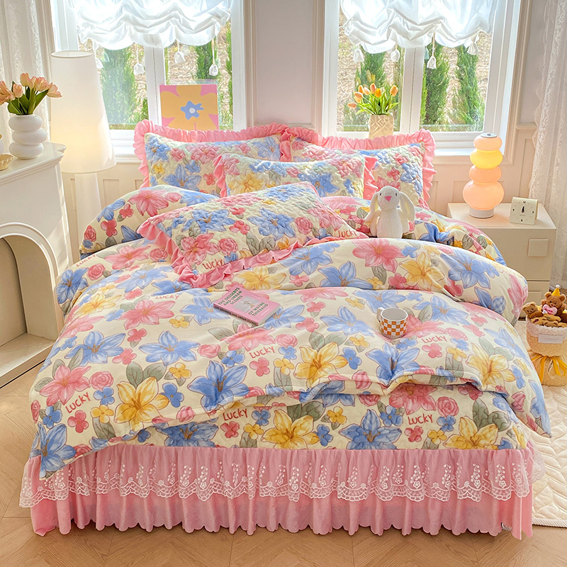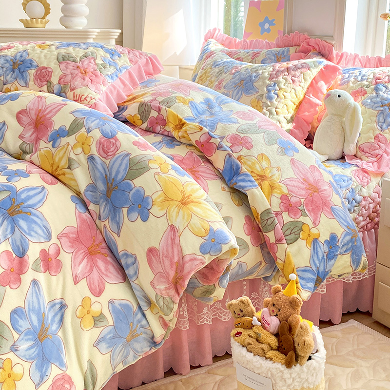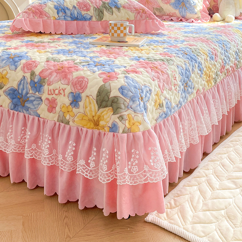 当前位置: 91家纺网 > 商品网购 > 床品套件 > 四件套 > 牛奶绒四件套 > 提花大世界 2025新款爆款高克重牛奶绒印花夹棉蕾丝花边床盖床三件四件套 花季物语
