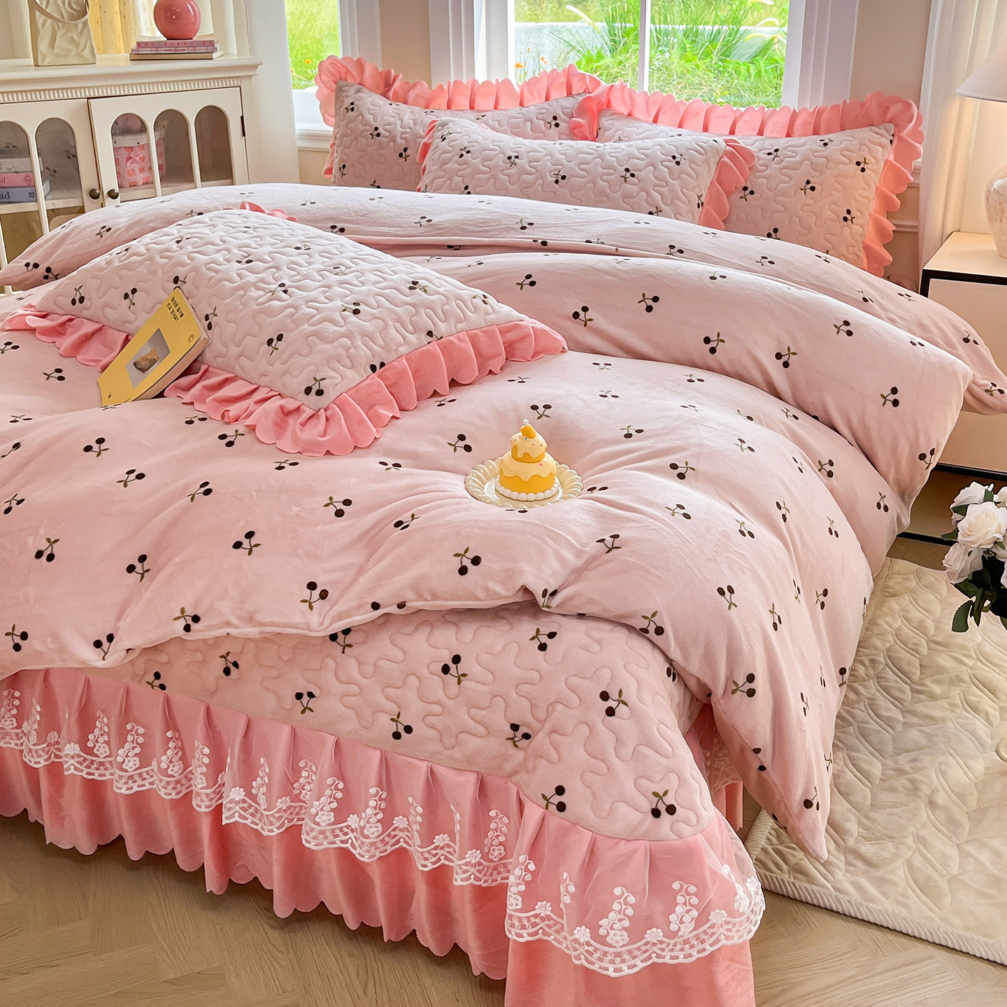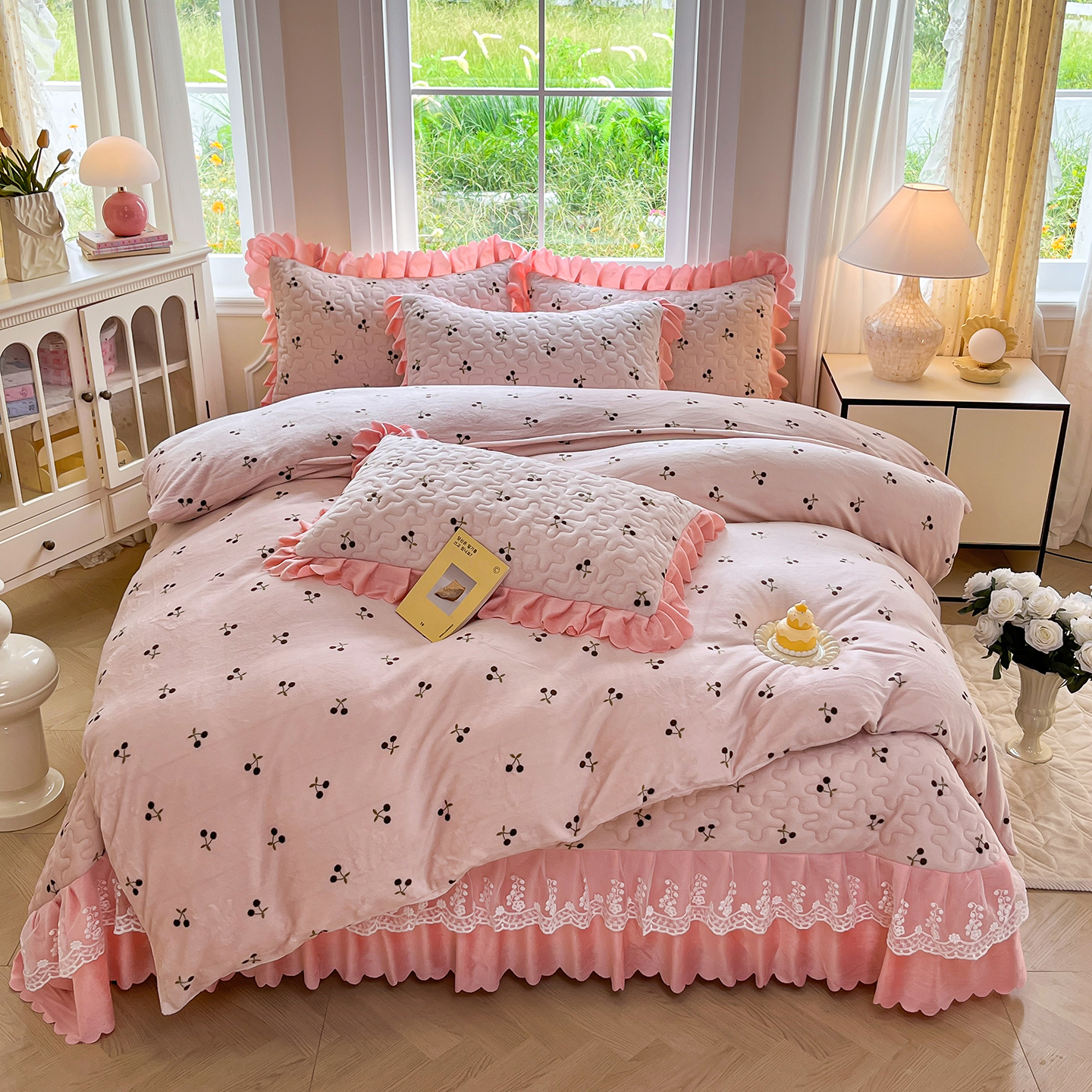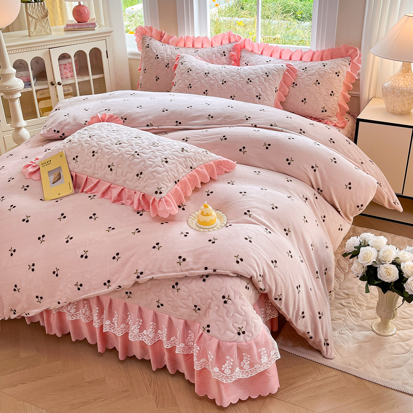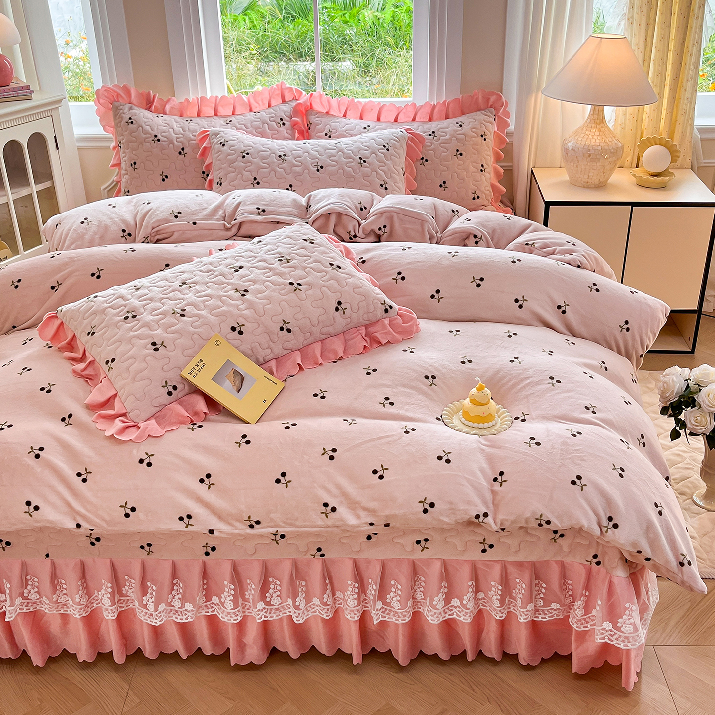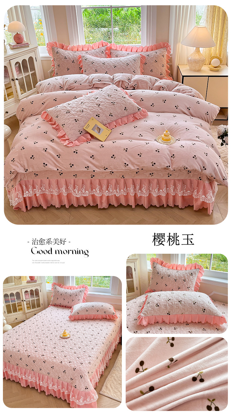 当前位置: 91家纺网 > 商品网购 > 床品套件 > 四件套 > 牛奶绒四件套 > 提花大世界 2025新款爆款高克重牛奶绒印花夹棉蕾丝花边床盖床三件四件套 樱桃玉