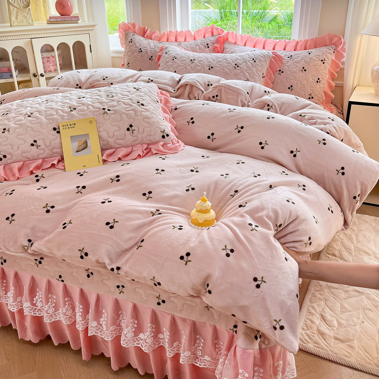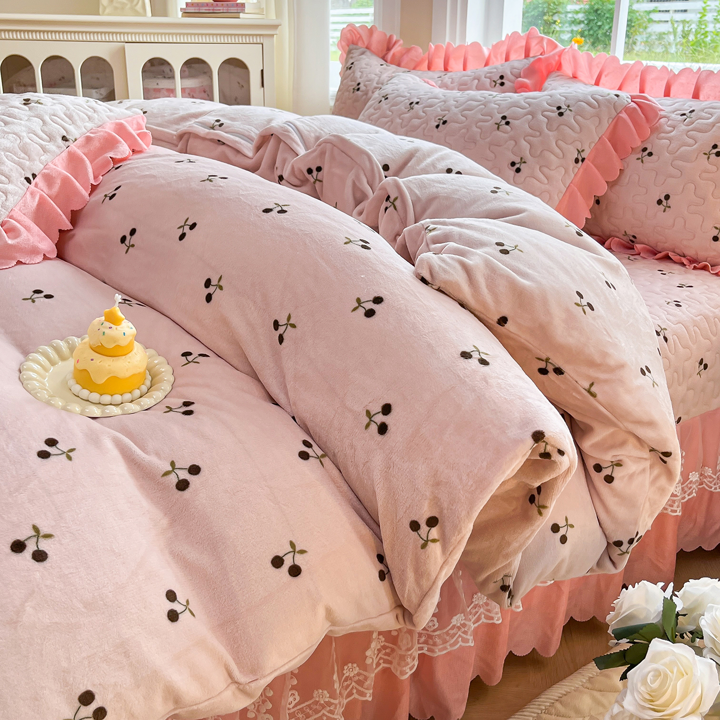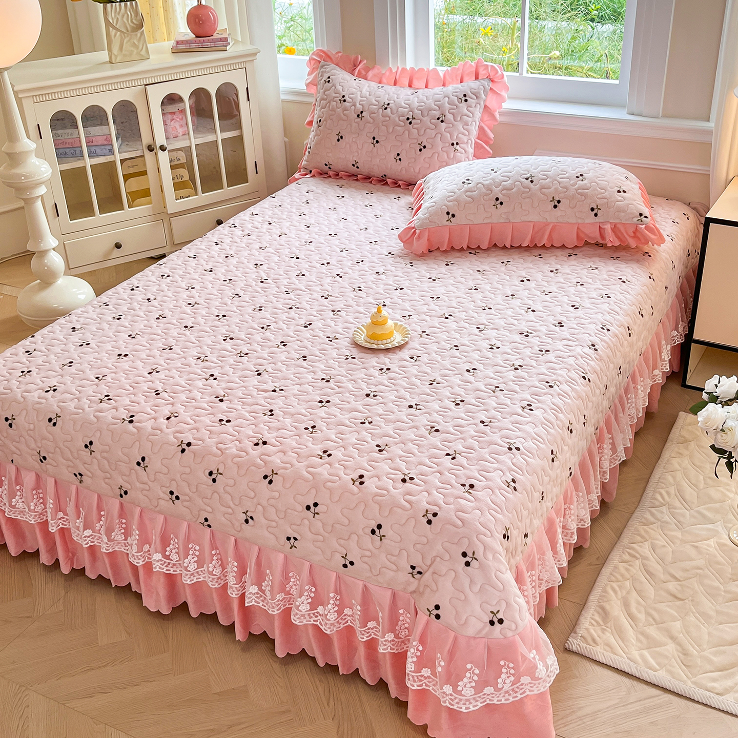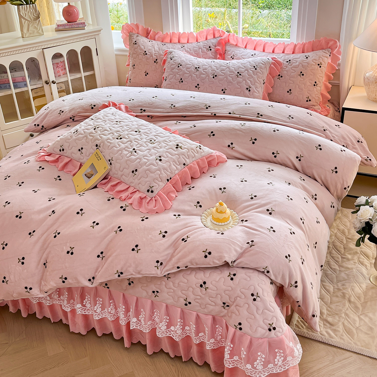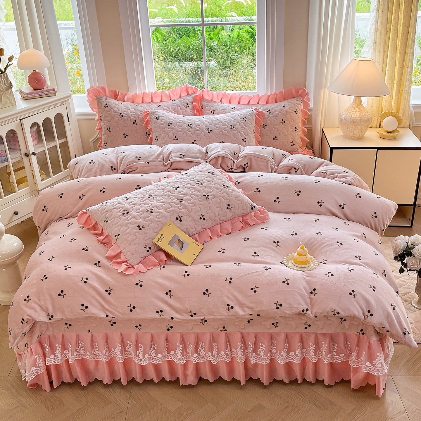 当前位置: 91家纺网 > 商品网购 > 床品套件 > 四件套 > 牛奶绒四件套 > 提花大世界 2025新款爆款高克重牛奶绒印花夹棉蕾丝花边床盖床三件四件套 樱桃玉
